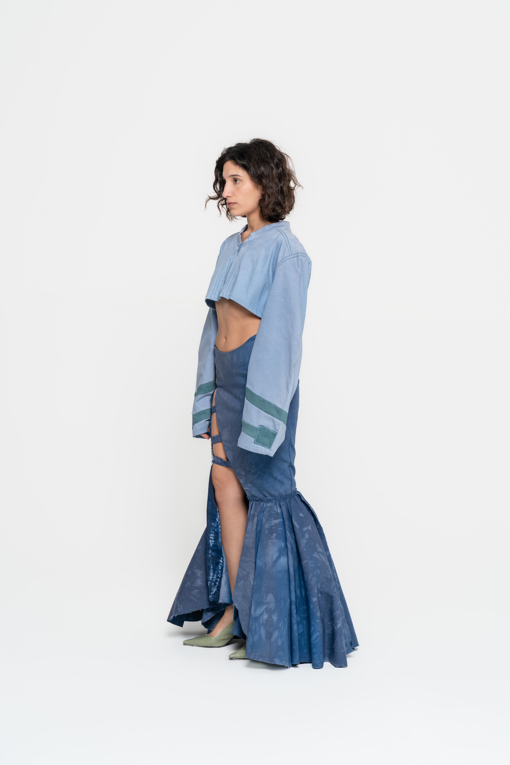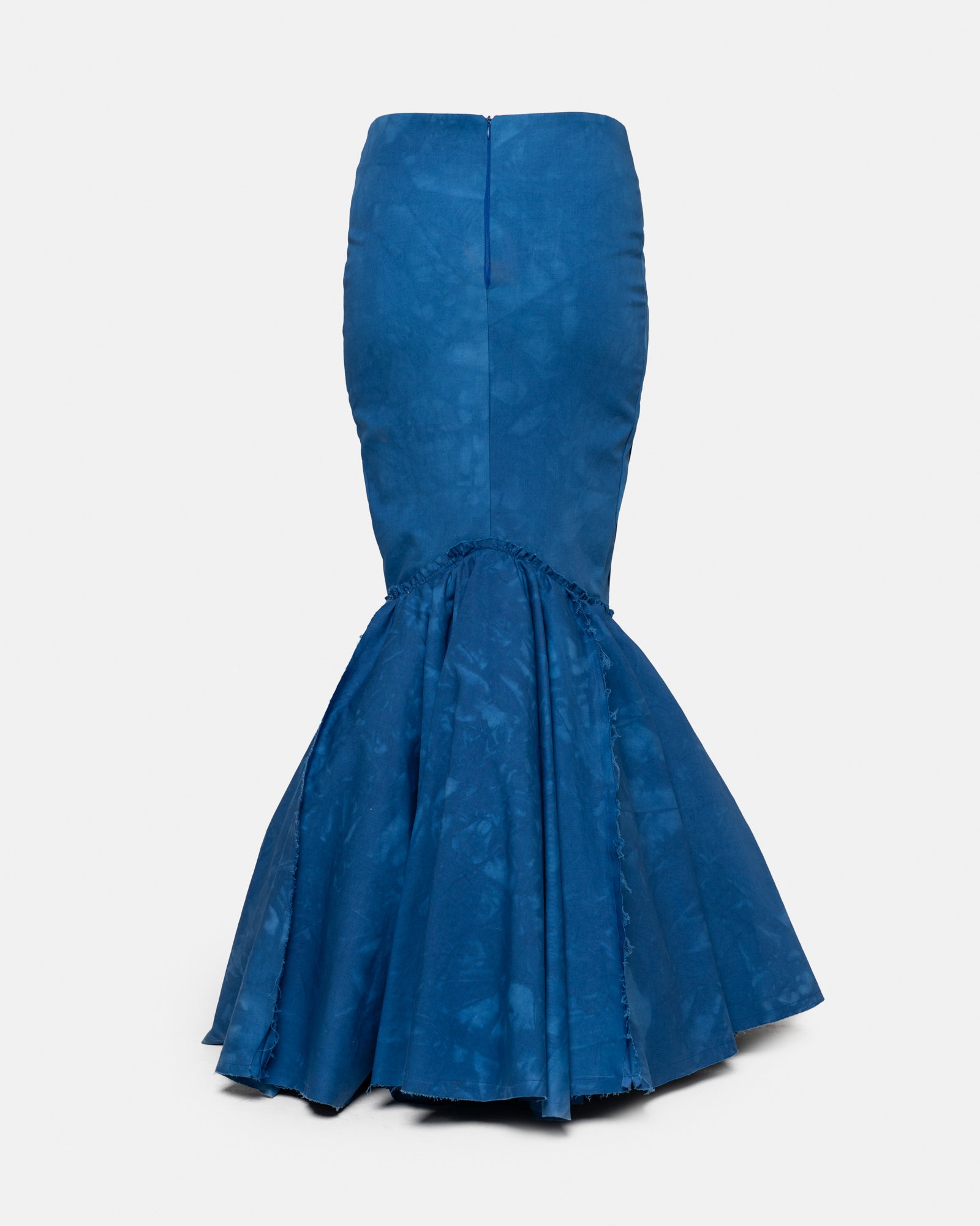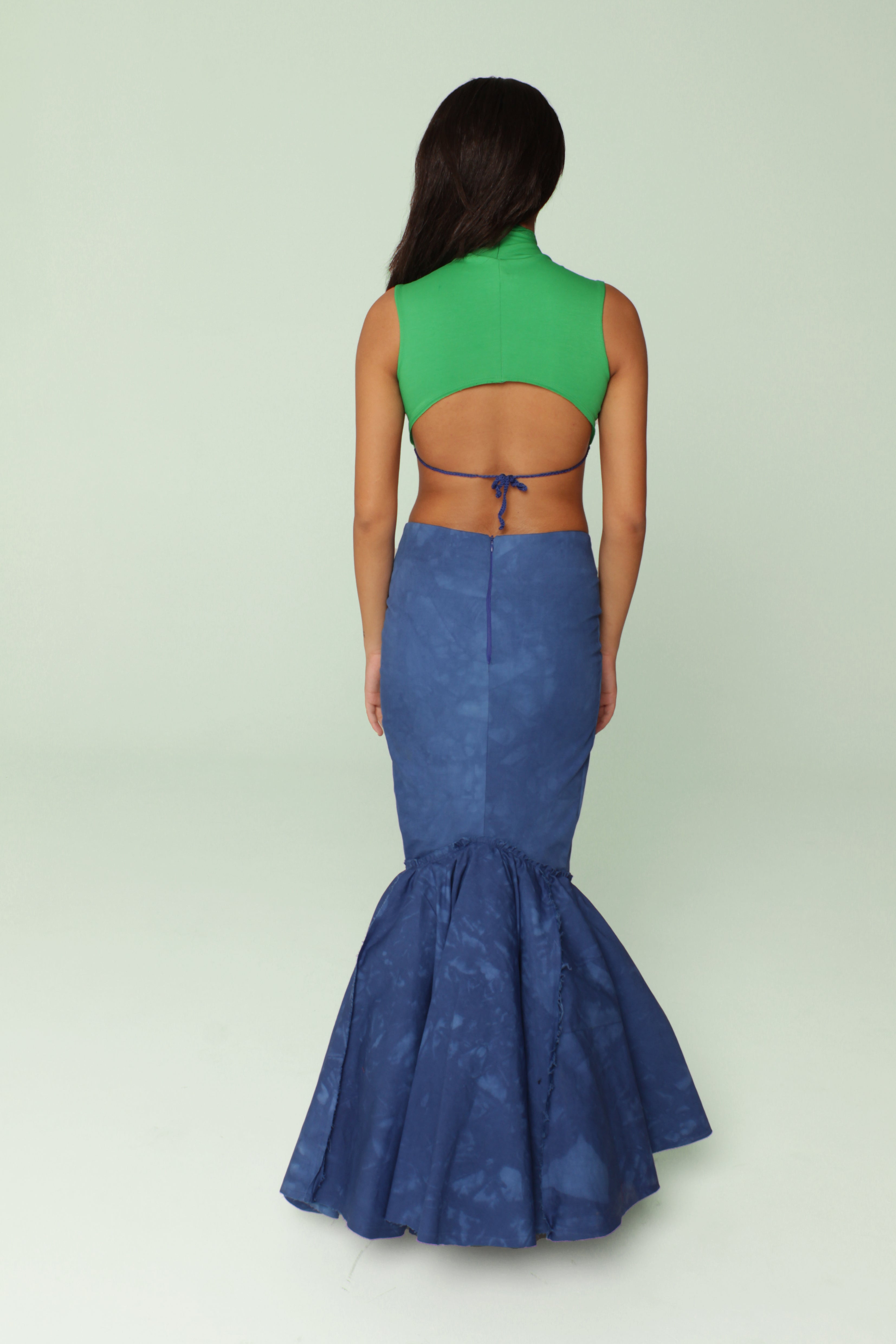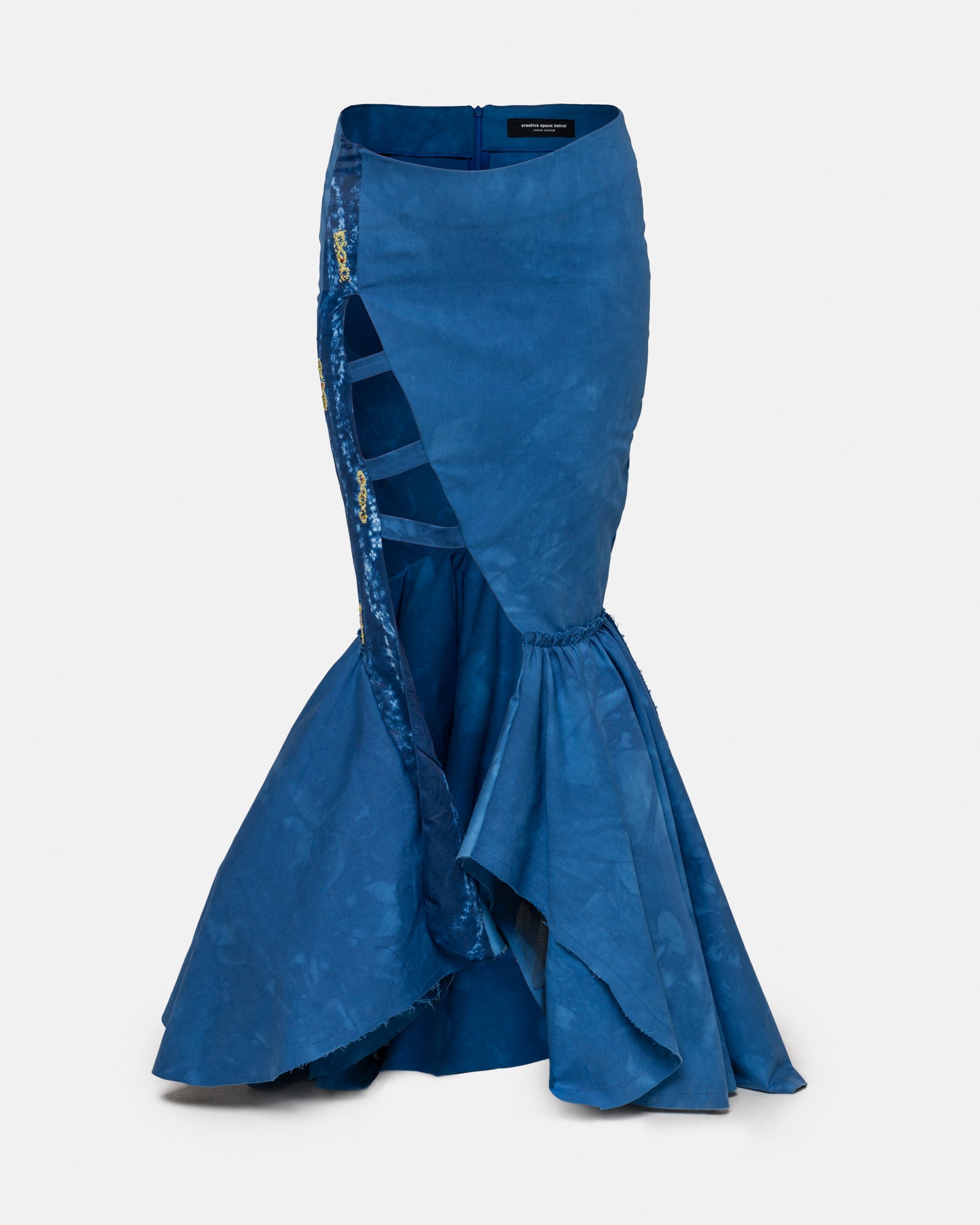 Low waisted double layered mermaid skirt with asymmetrical opening, band with dna shibori material work.
