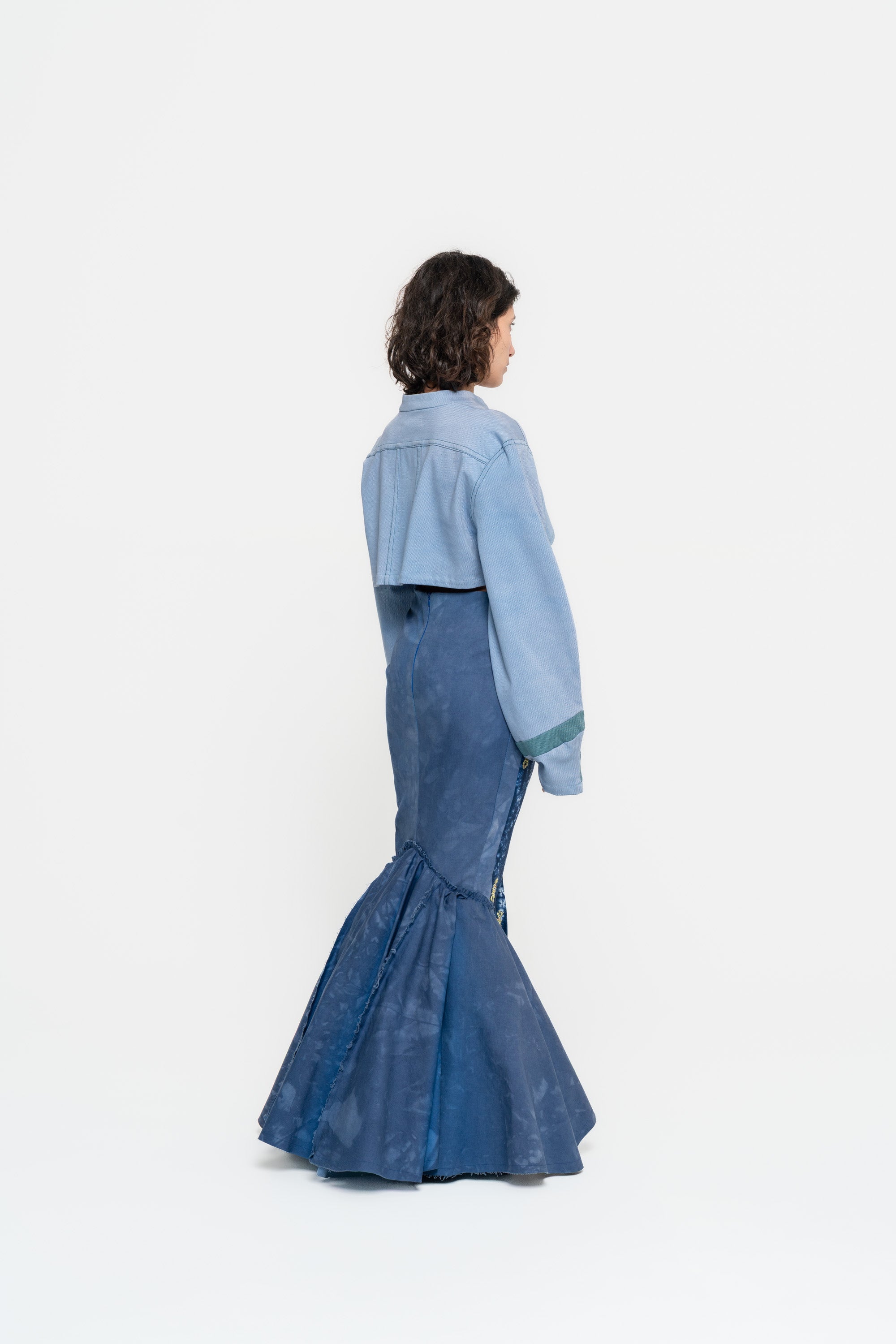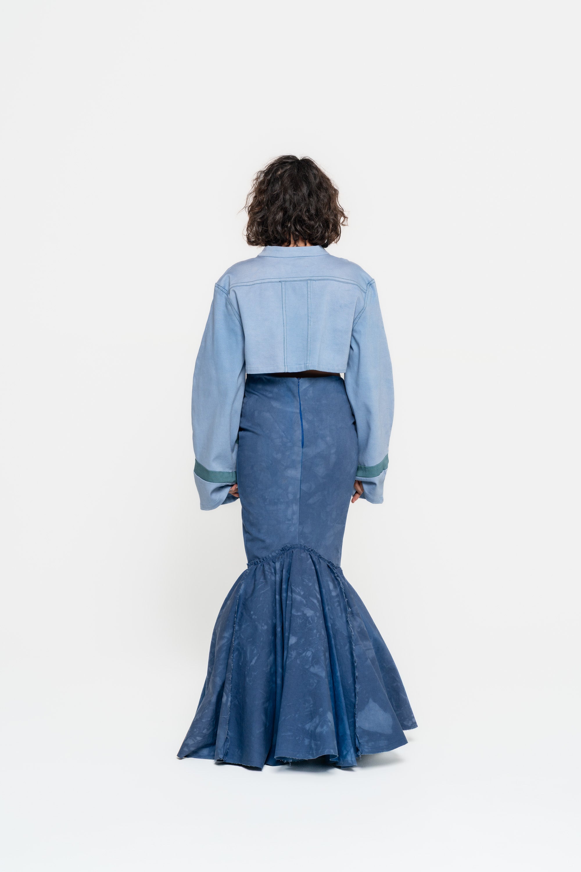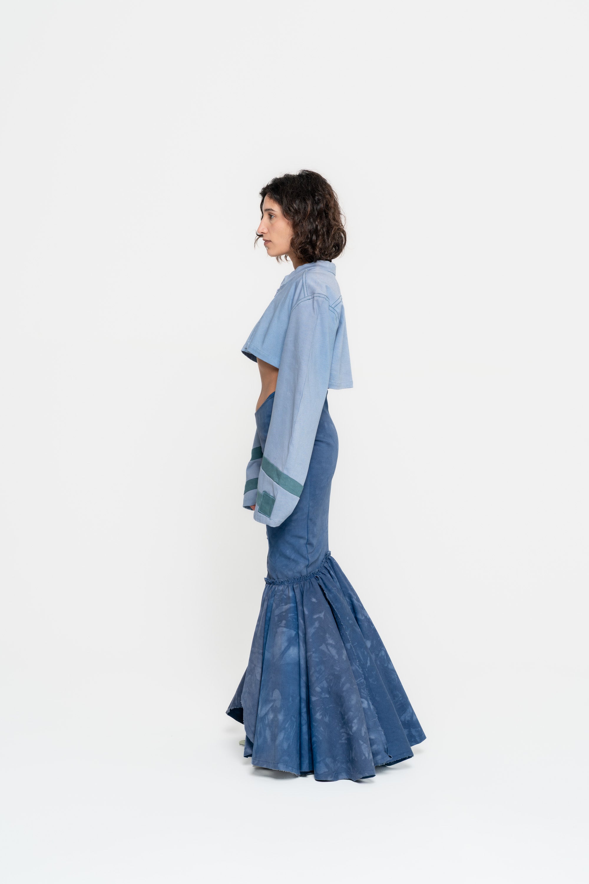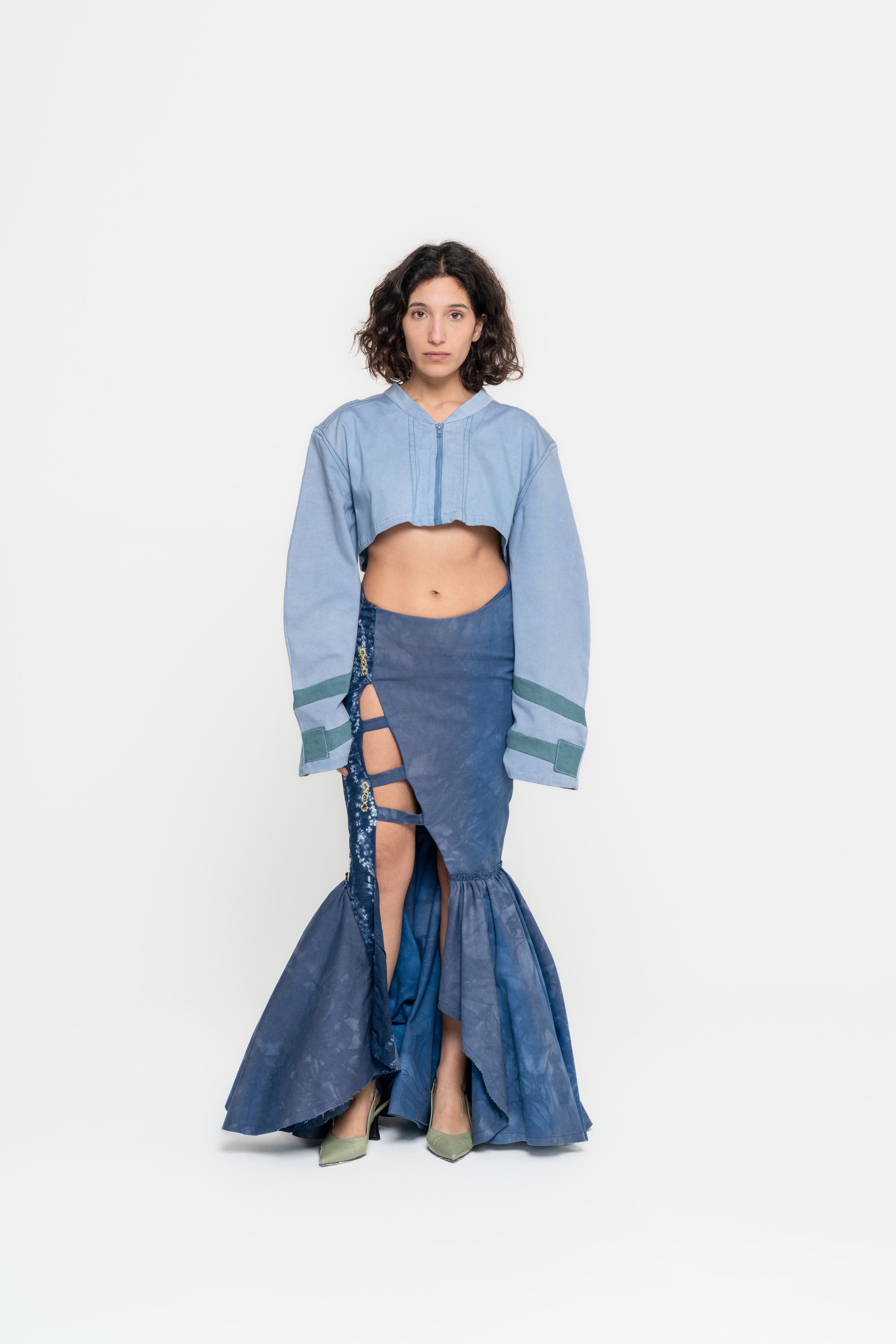 Low waisted double layered mermaid skirt with asymmetrical opening, band with dna shibori material work.