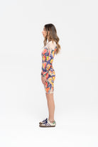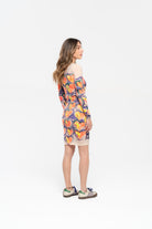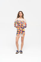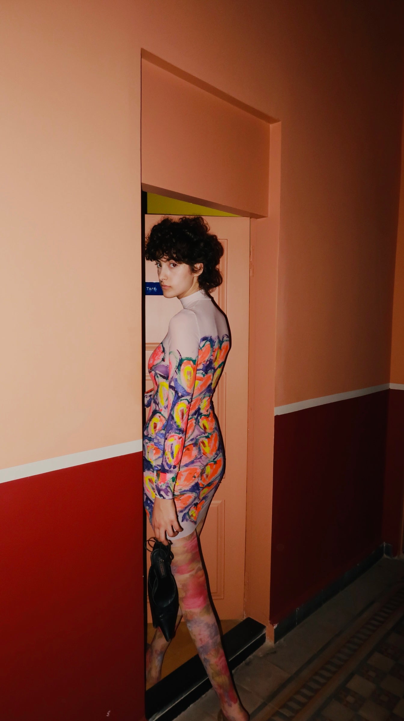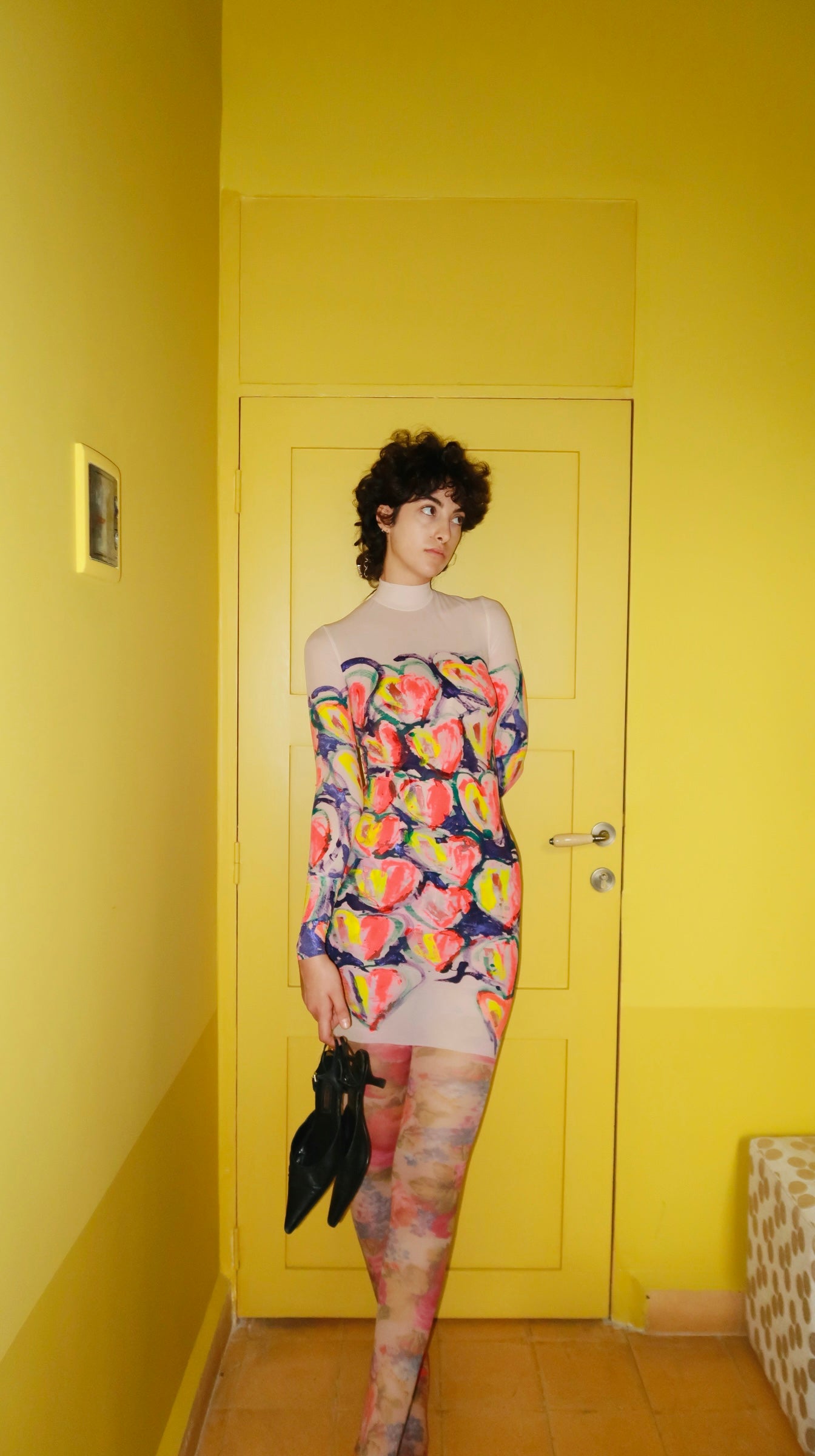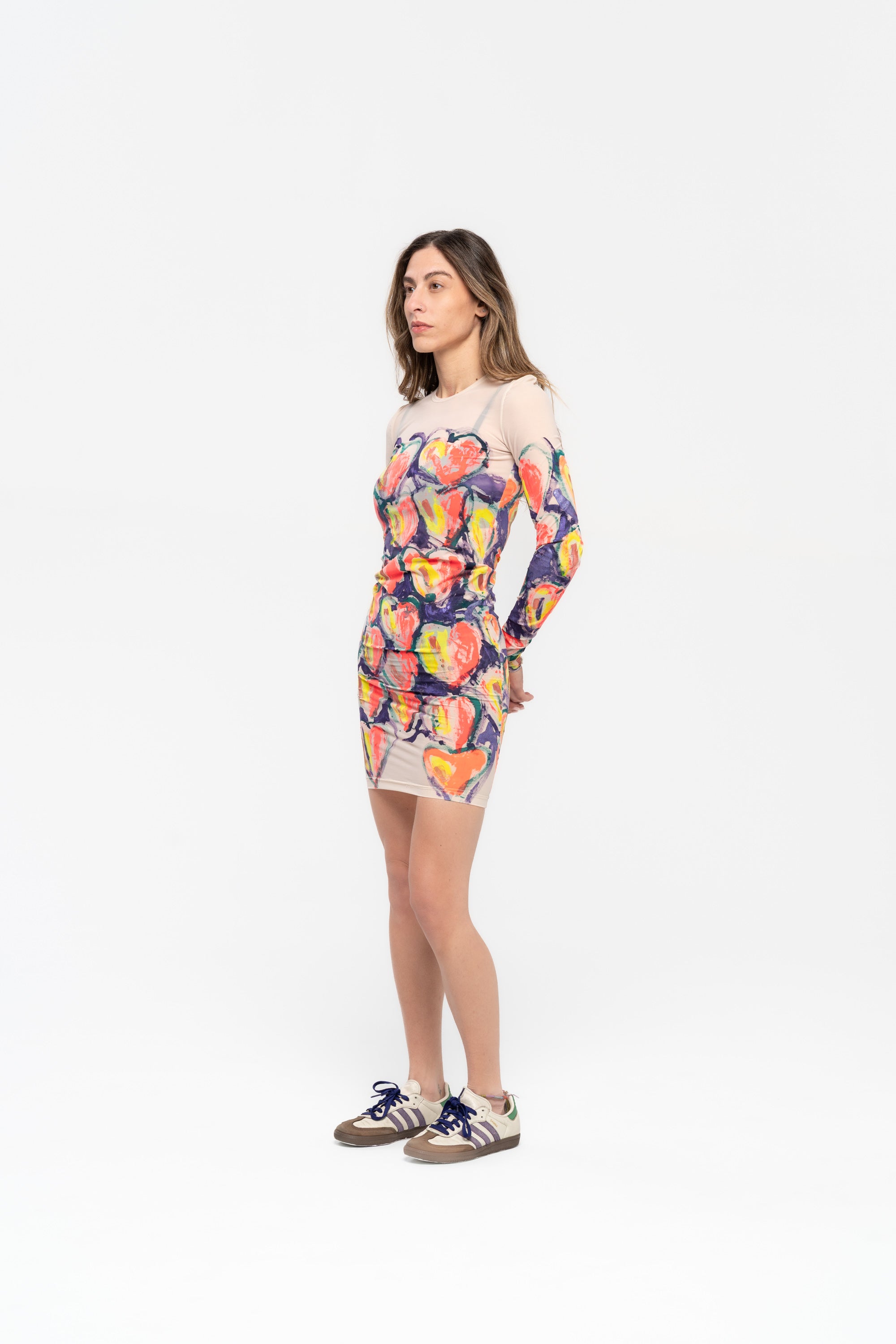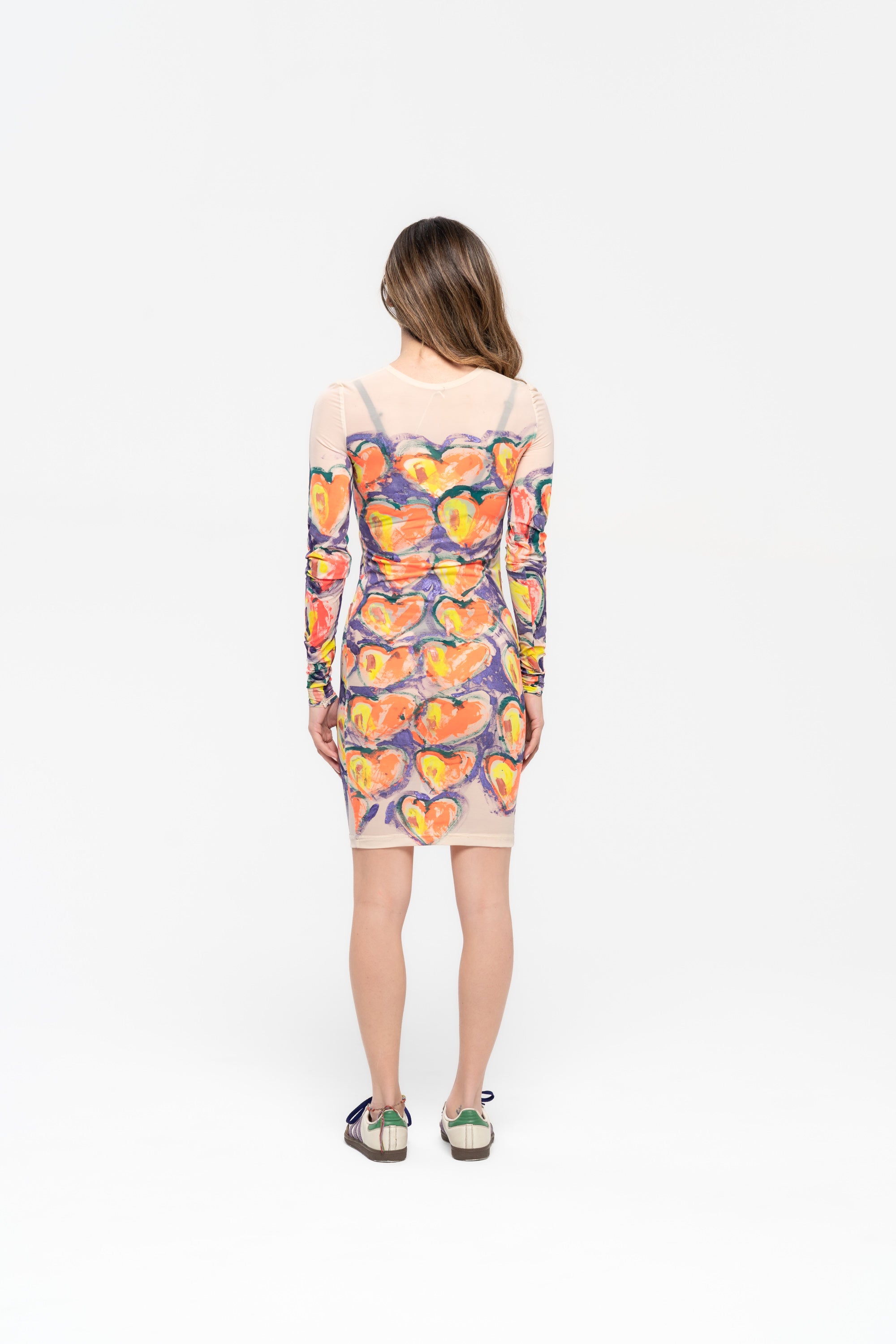 Long sleeved turtle neck mini dress in hand-painted jersey.