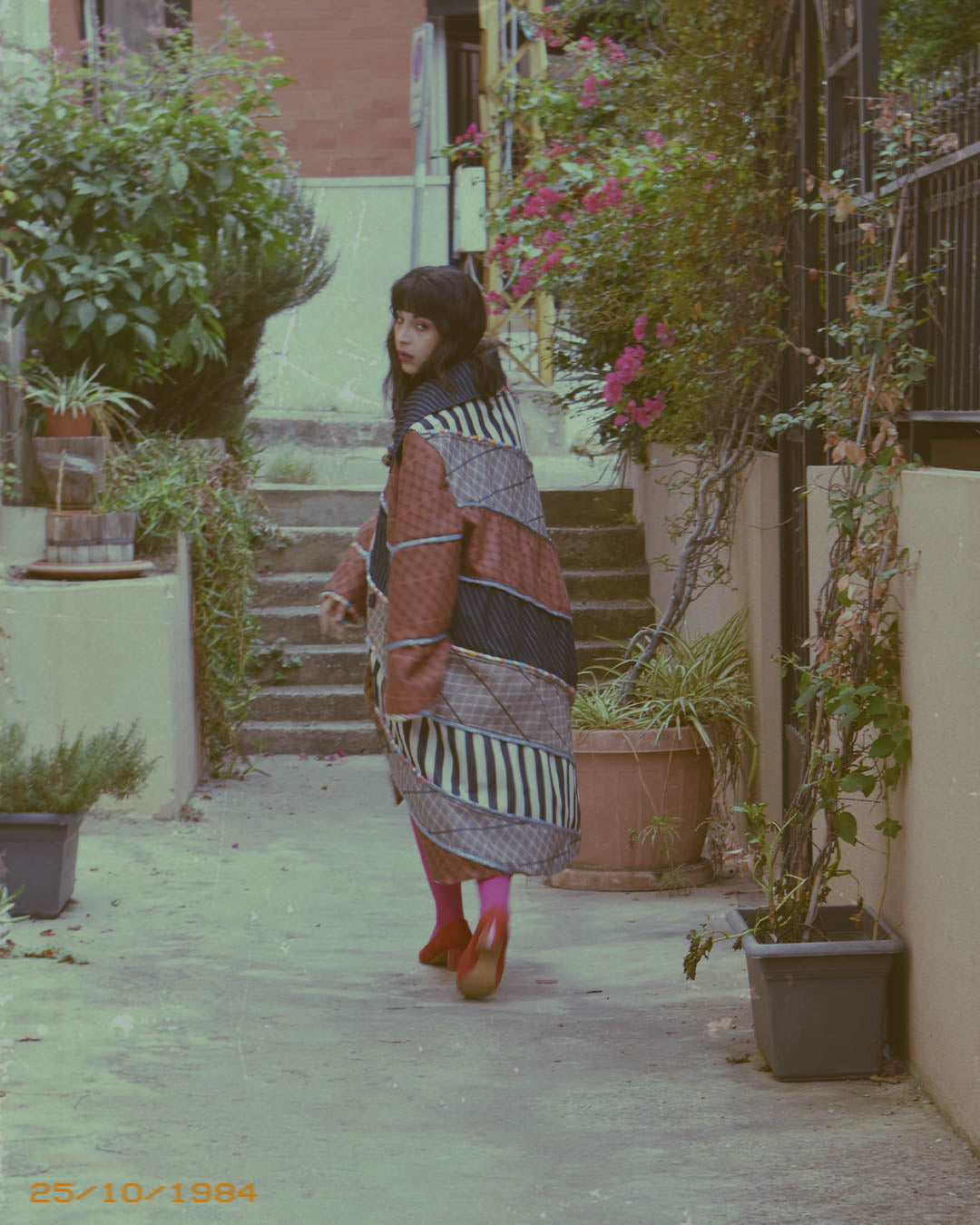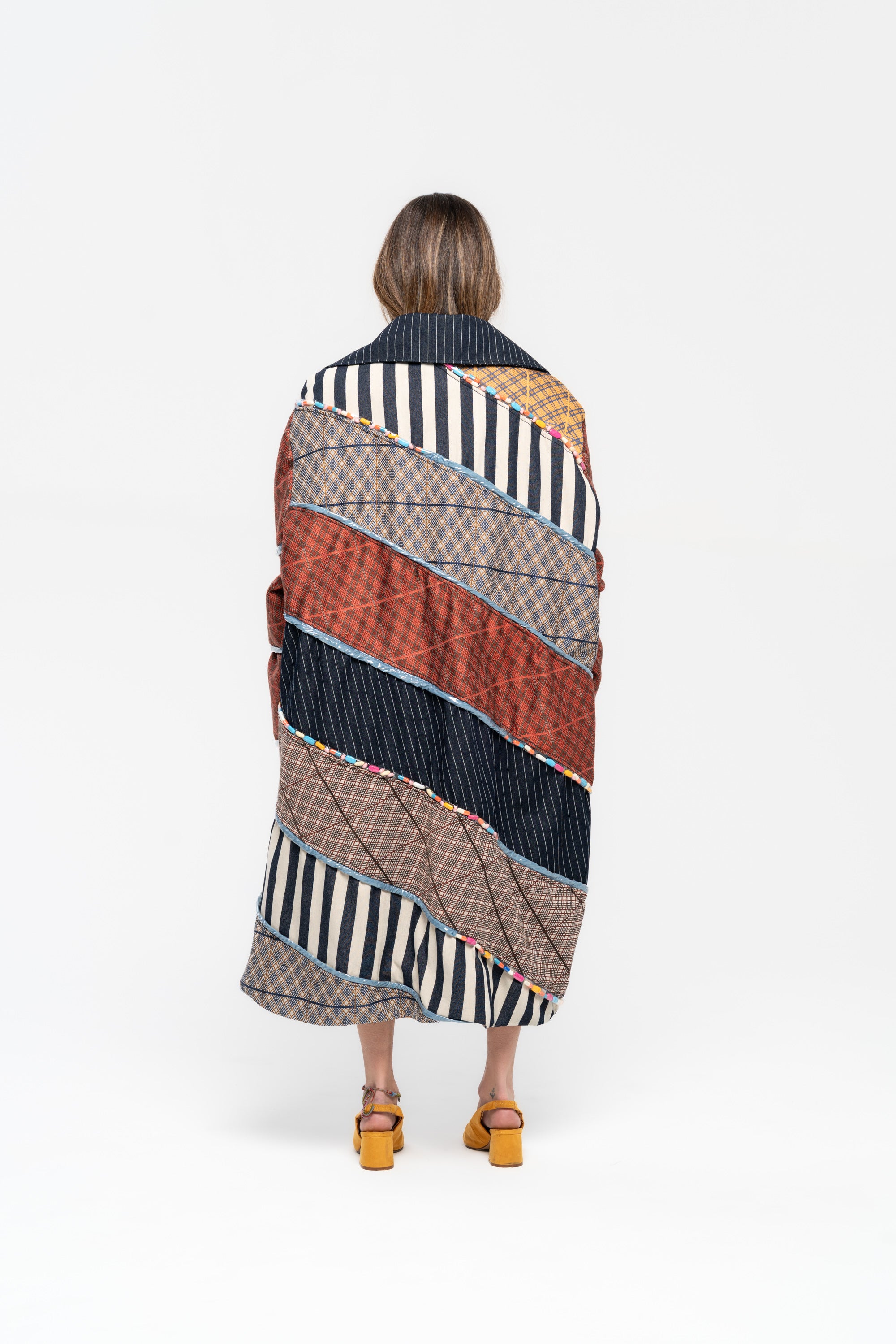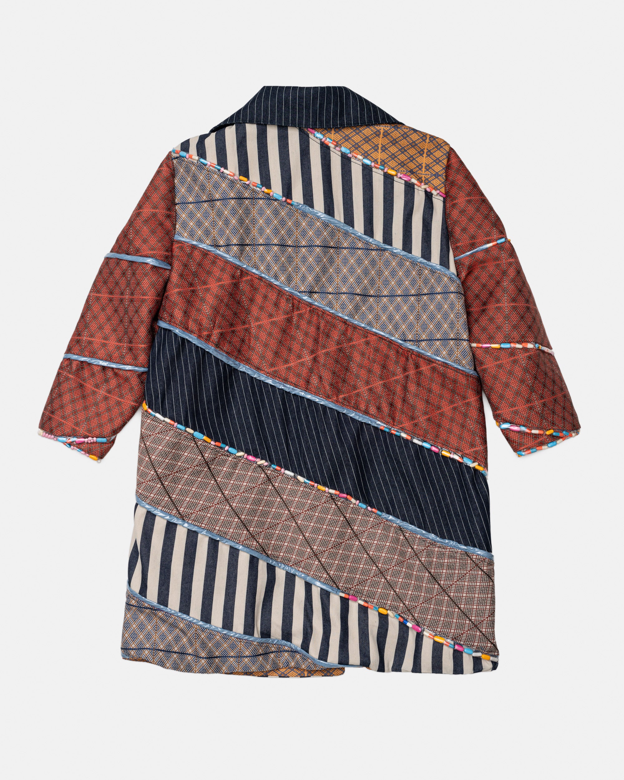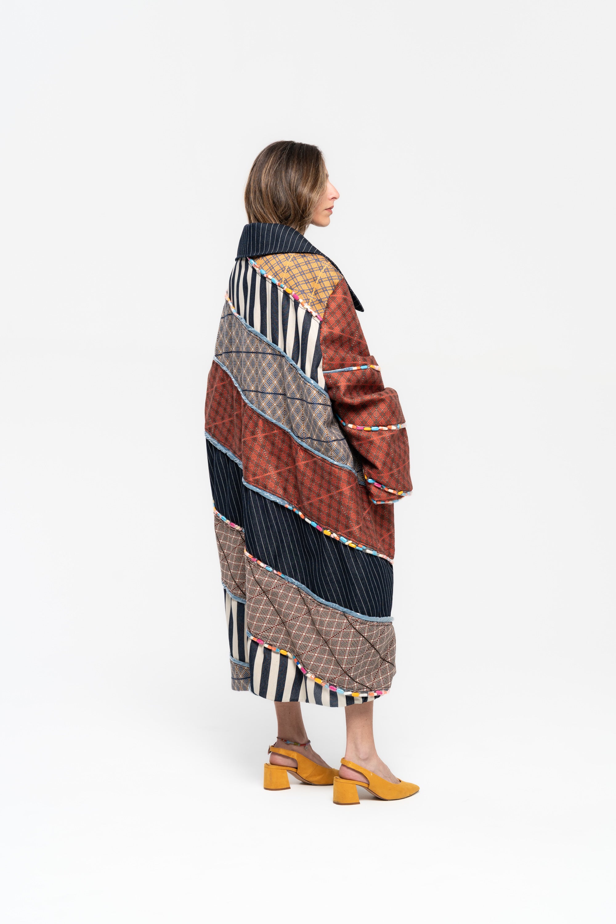 Oversized coat with spiral cuts, pill-stuffed lining, and two in-seam pockets.
