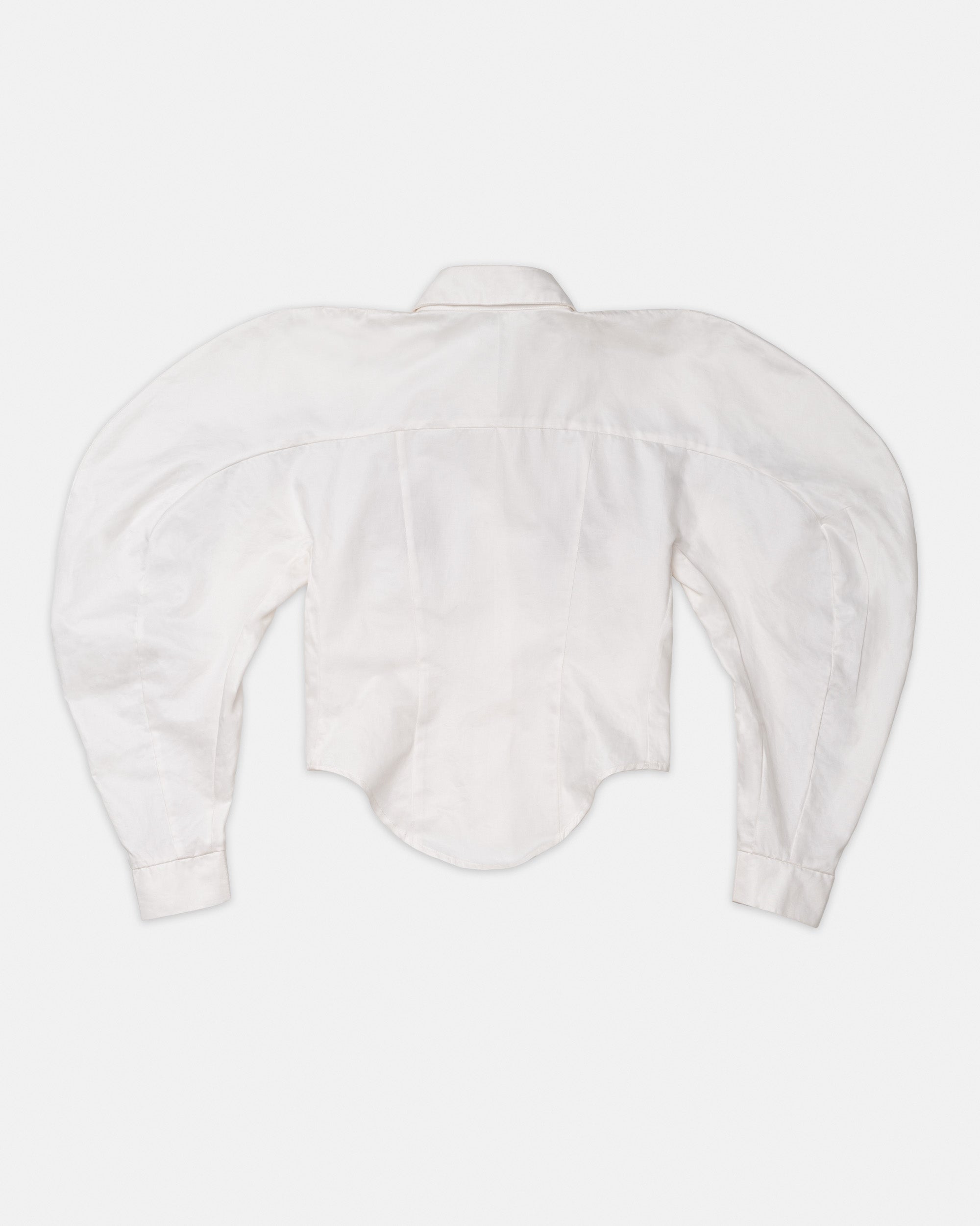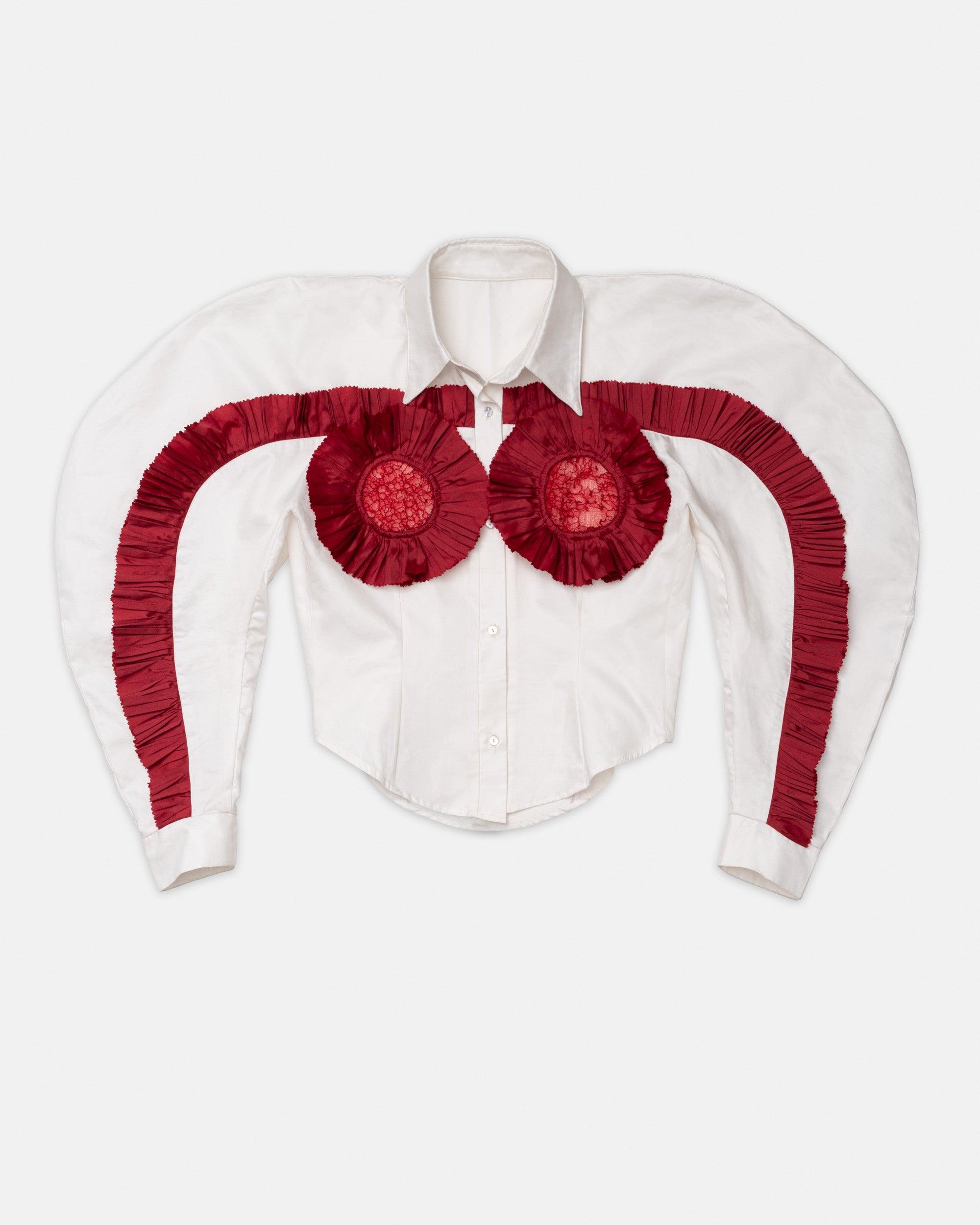 Slightly fitted voluminous sleeves. Featuring lace-covered circular cuts and pleats.