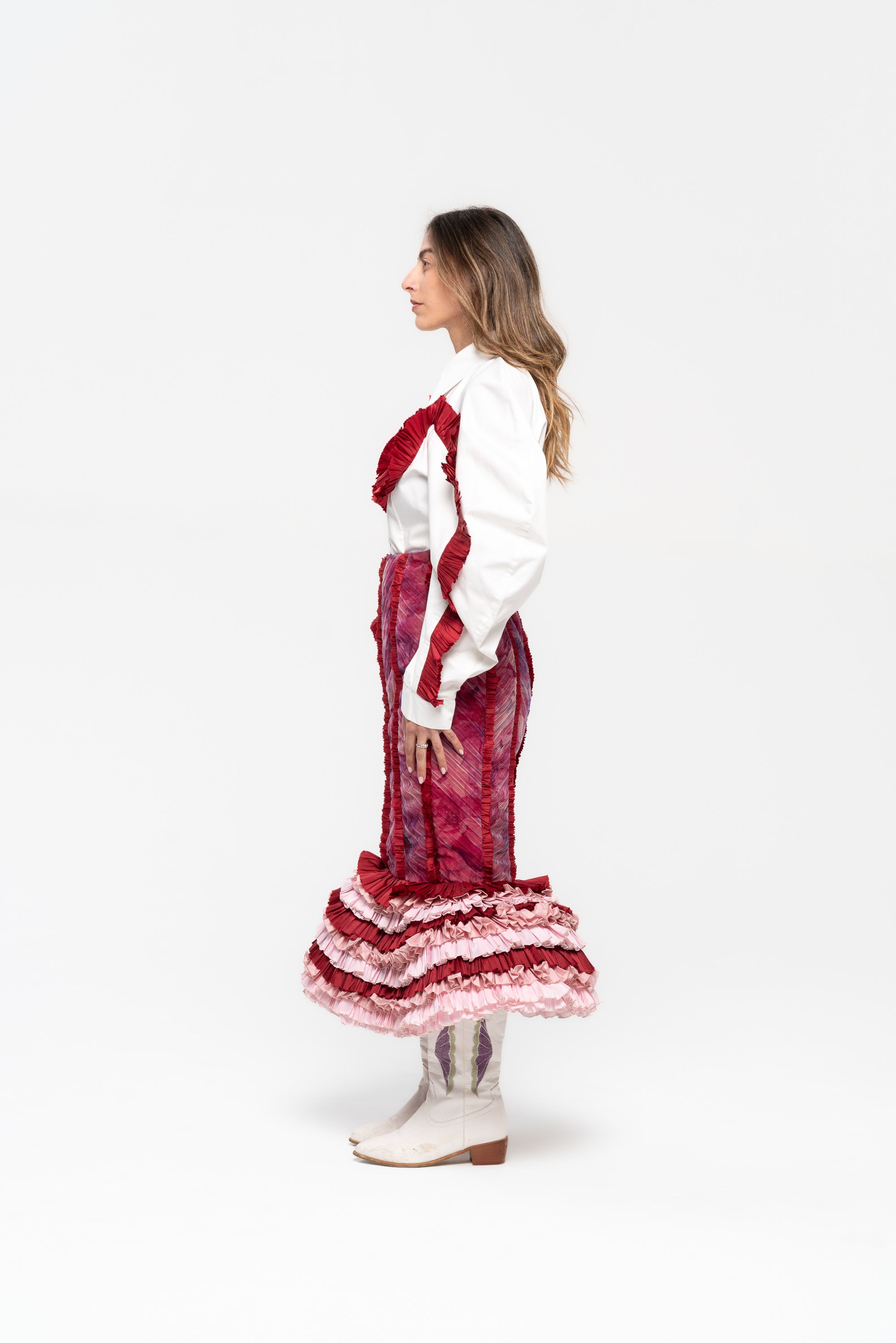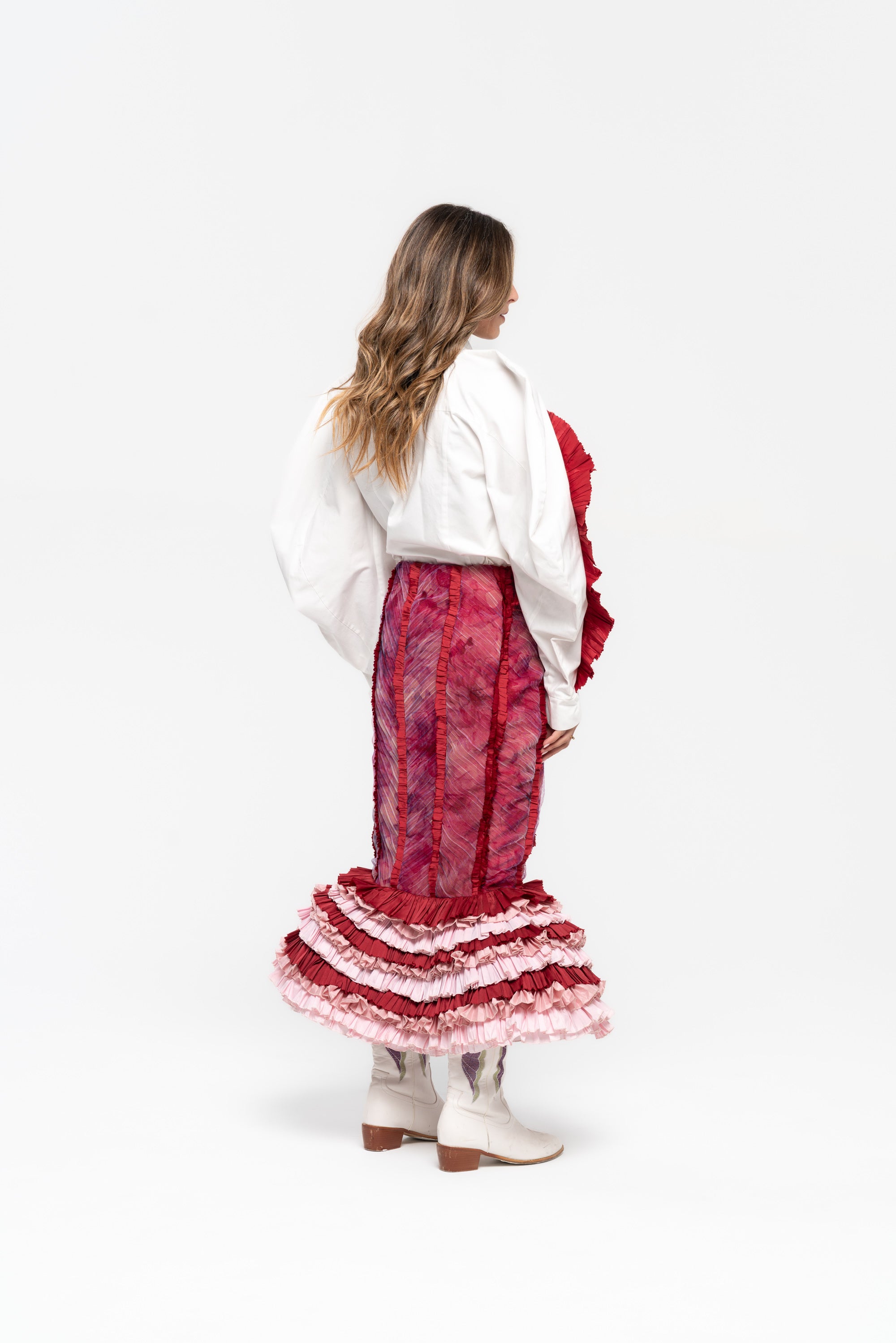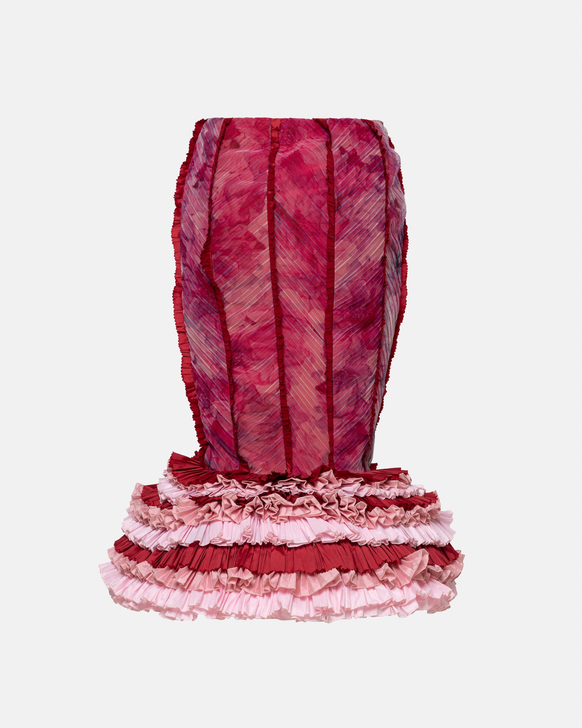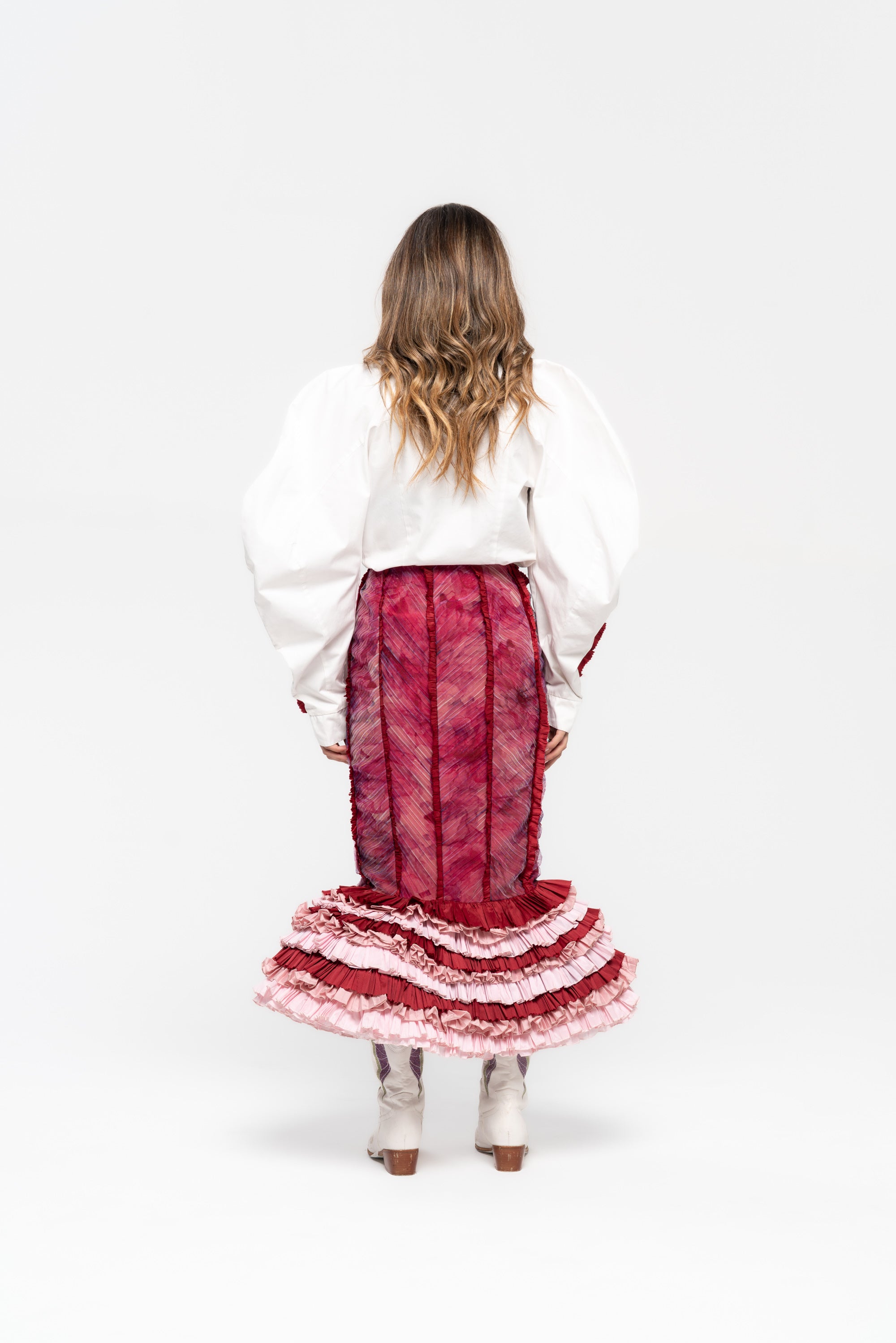 Midi skirt with panel cuts, pleats, and a voluminous structured cage in layered taffeta.