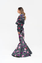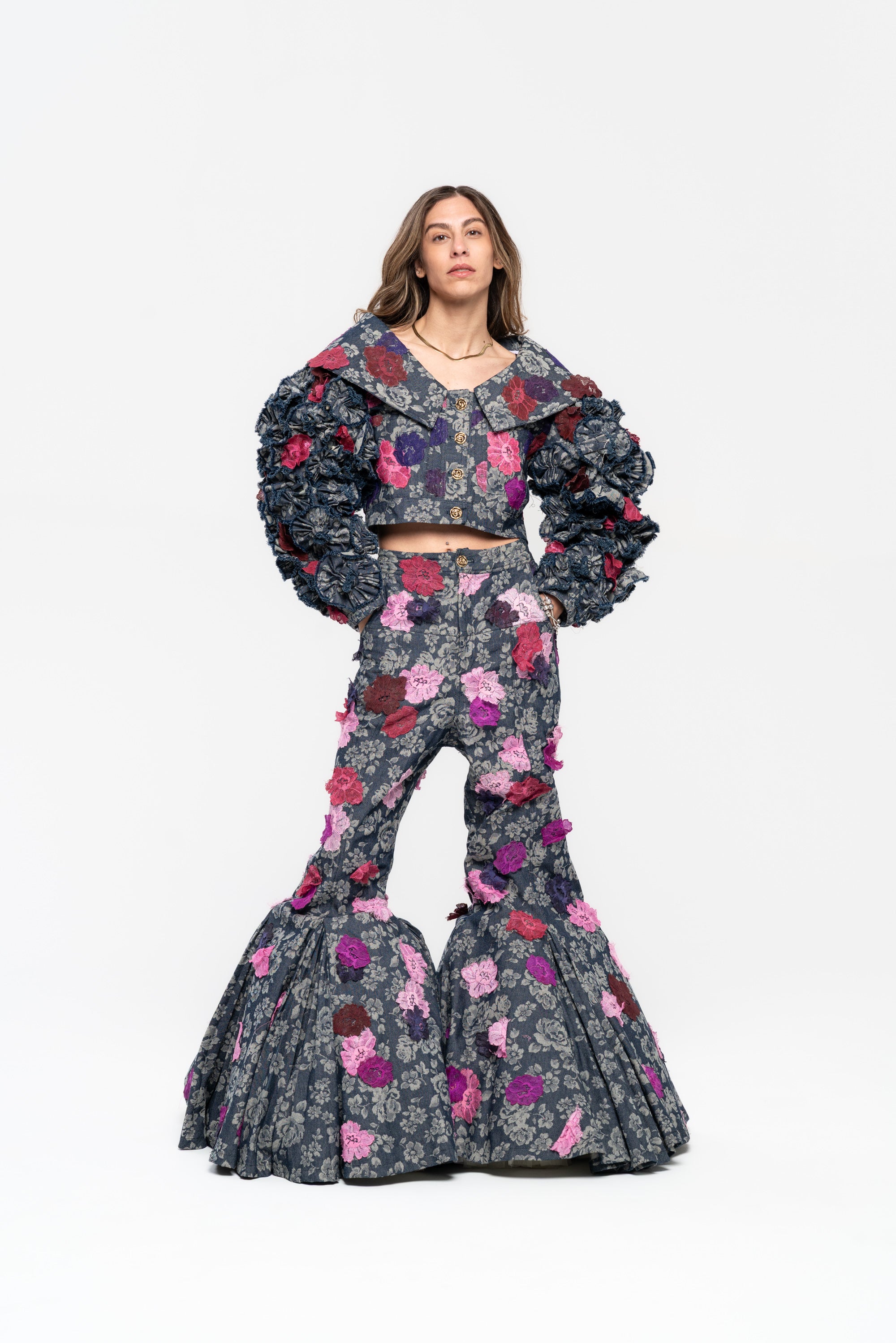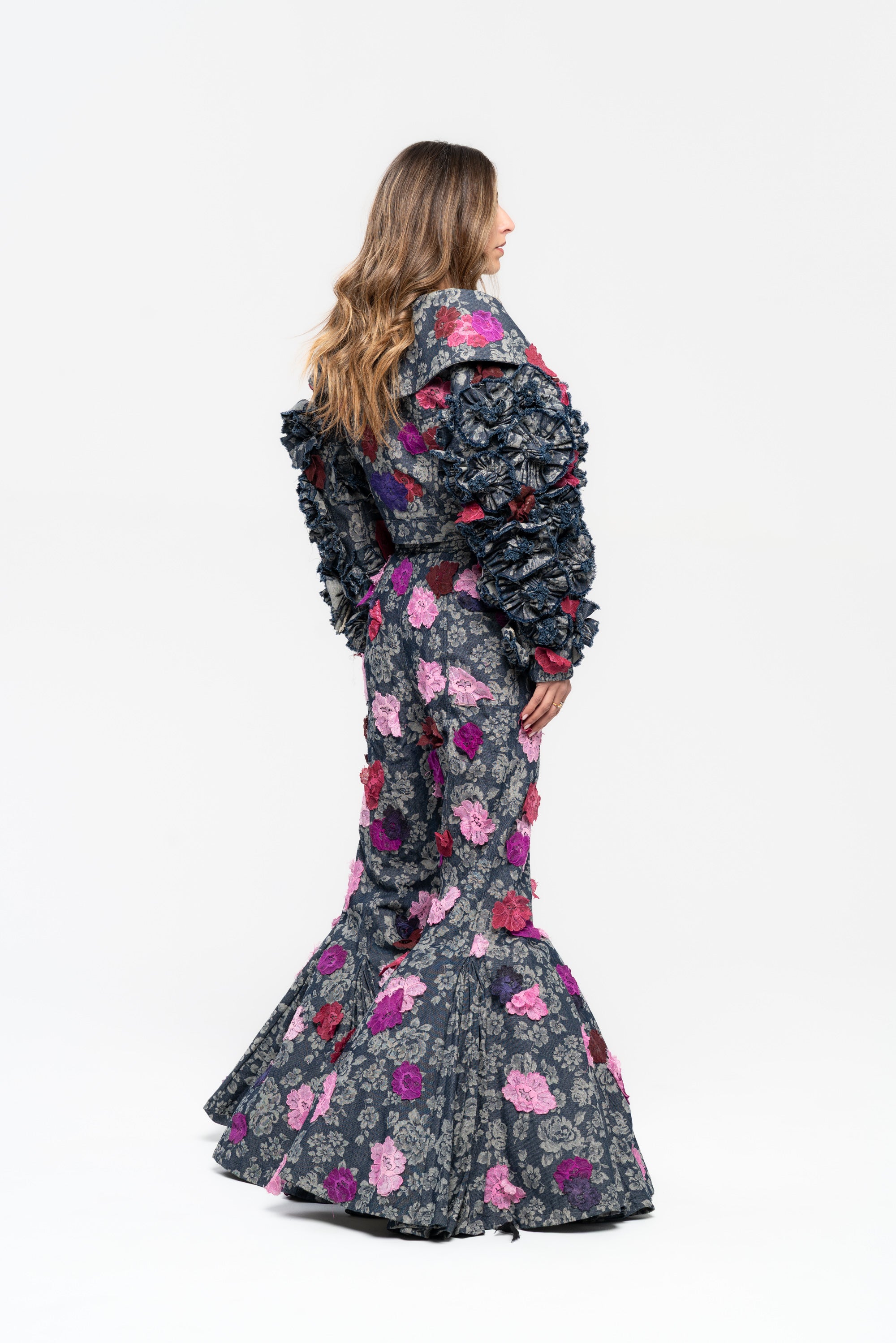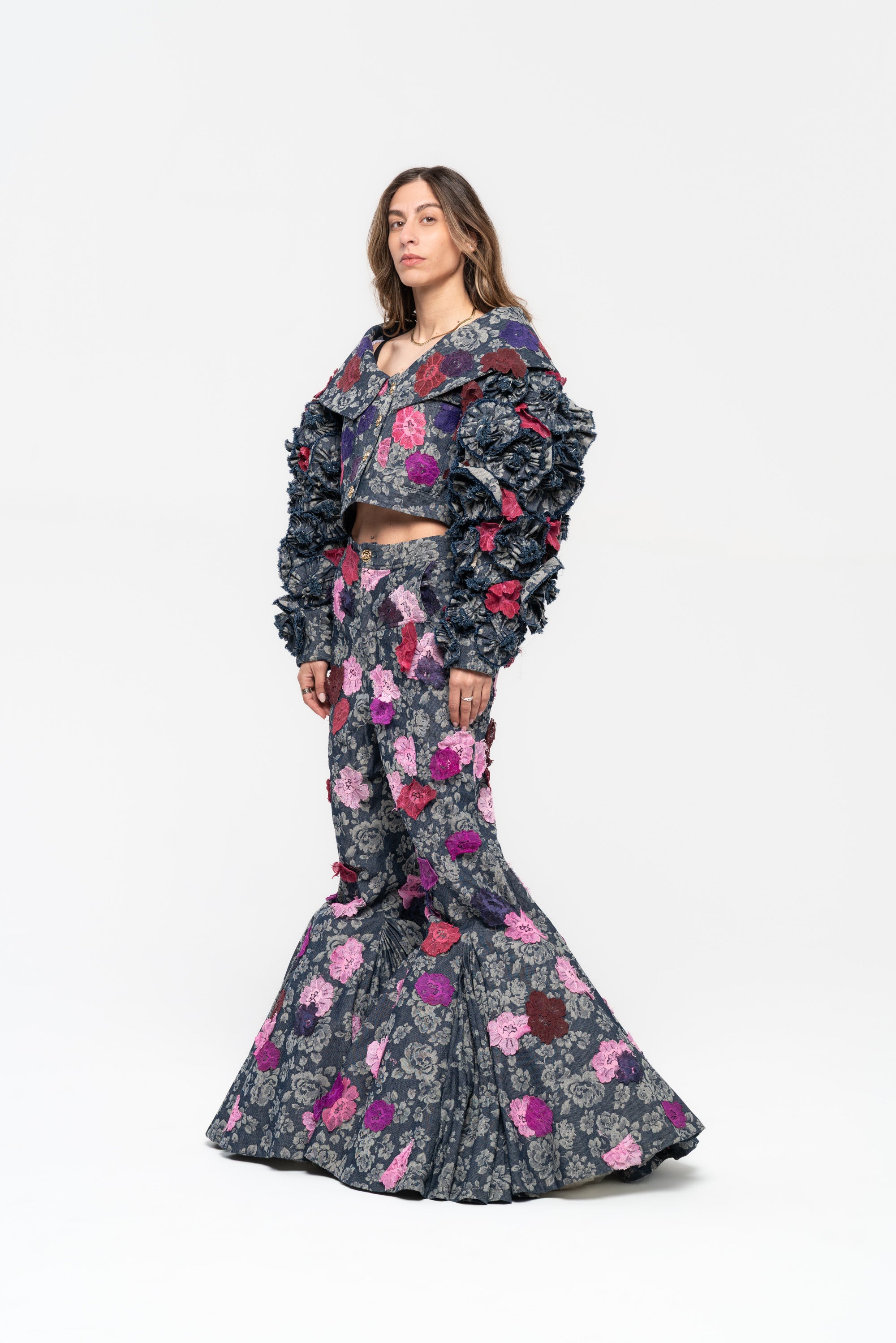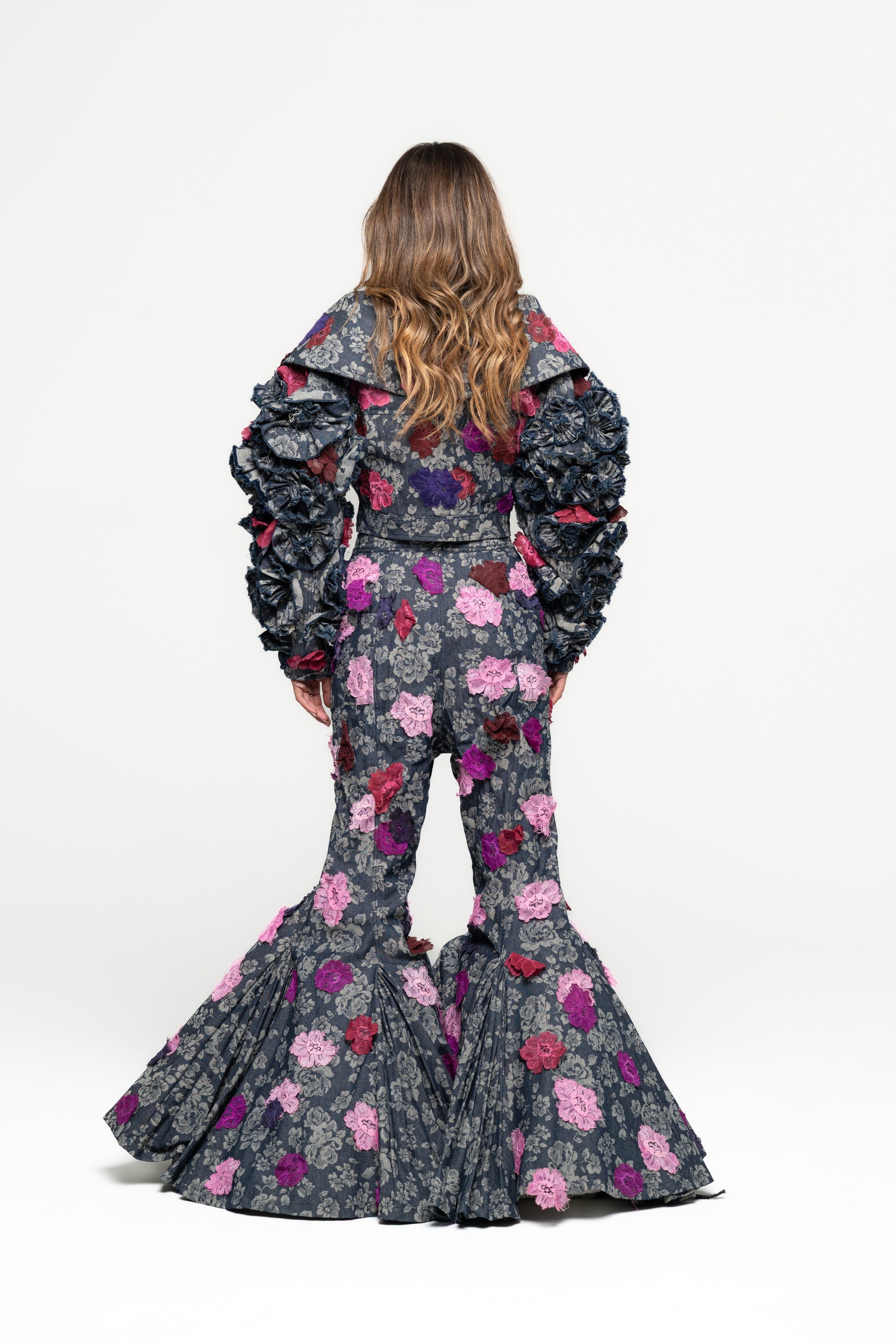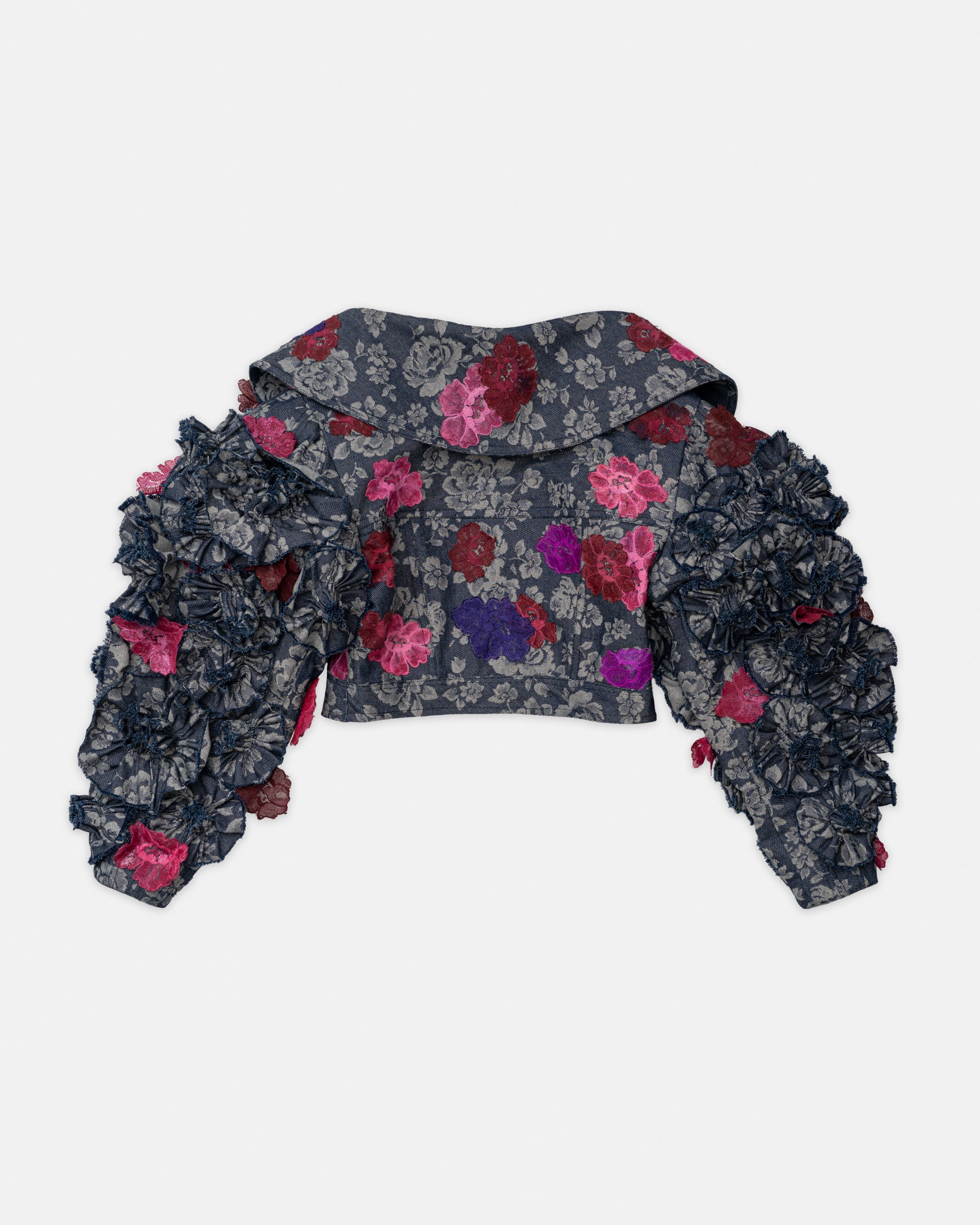 Waist length, wide shawl collar jacket featuring voluminous structured sleeves with floral material work.