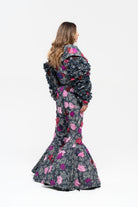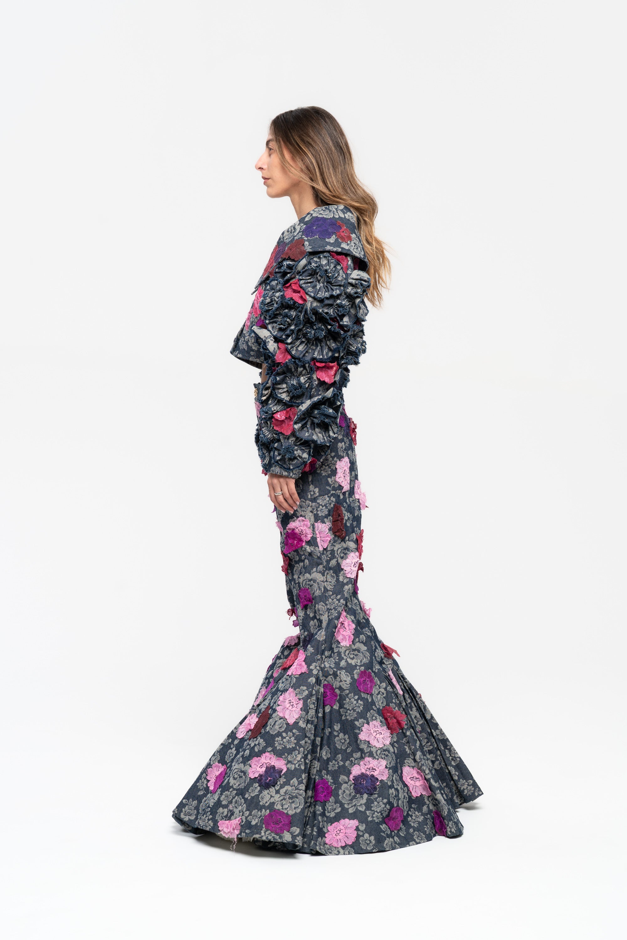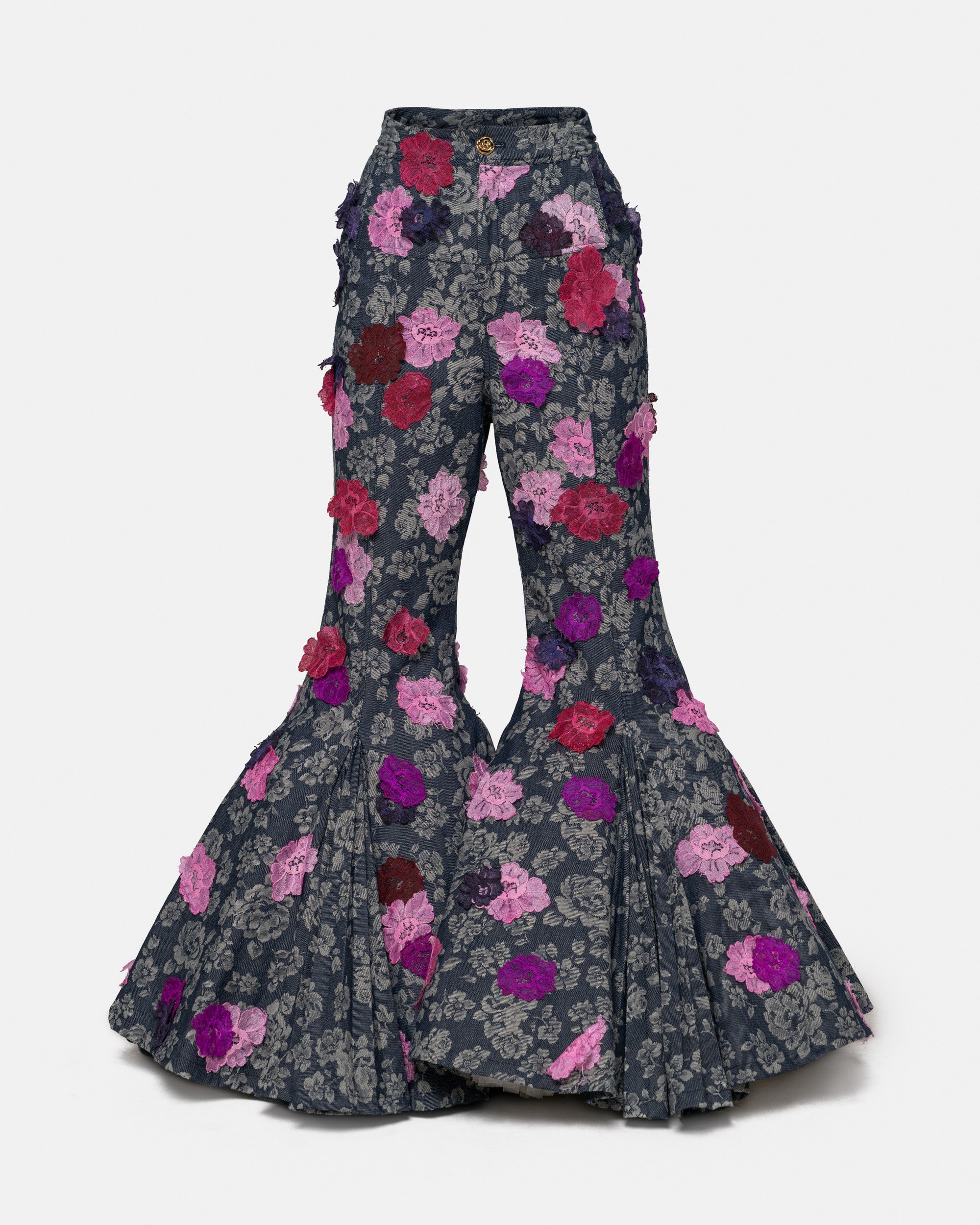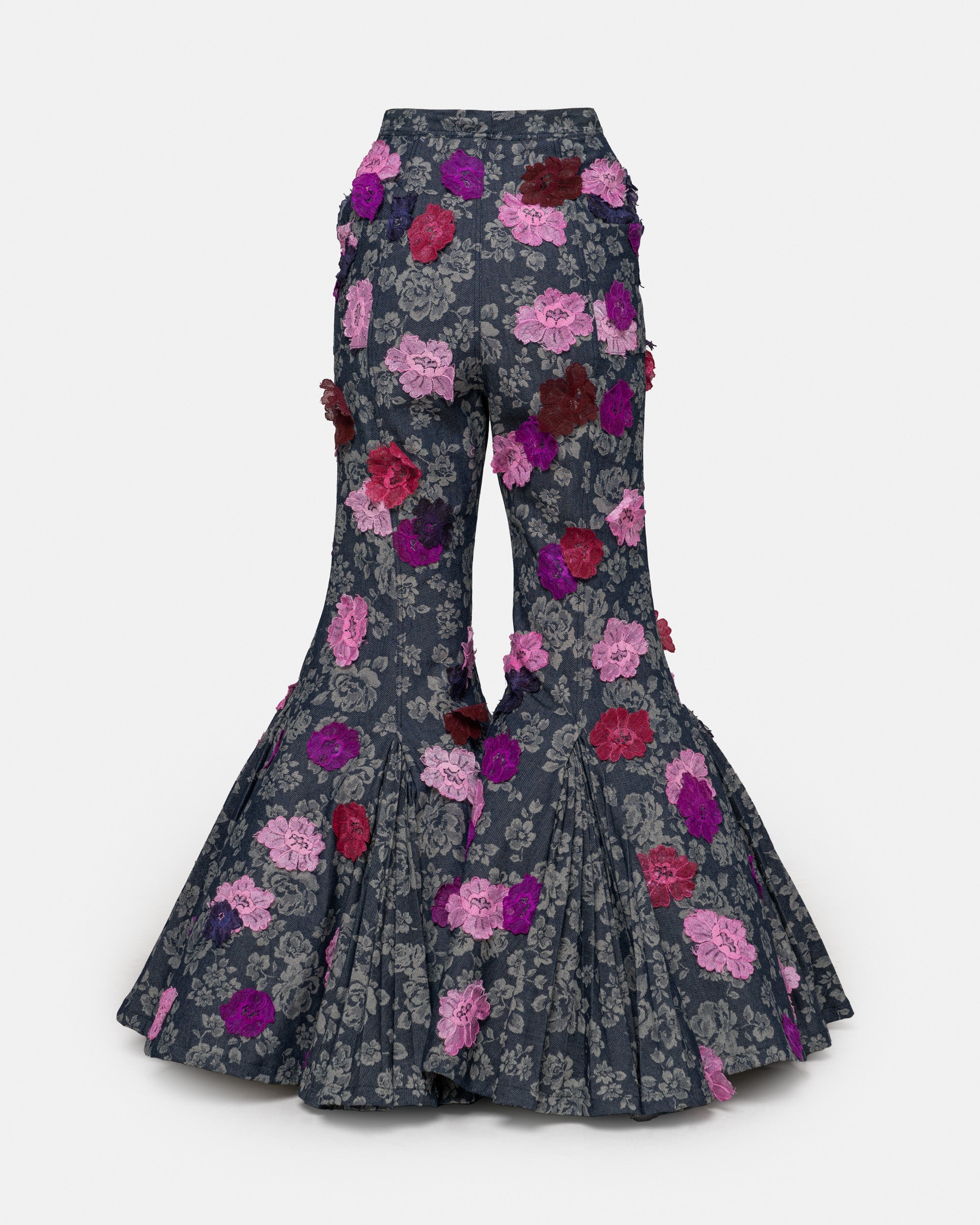 High waisted floral print denim trousers with exaggerated flared leg structured by layer of tulle.