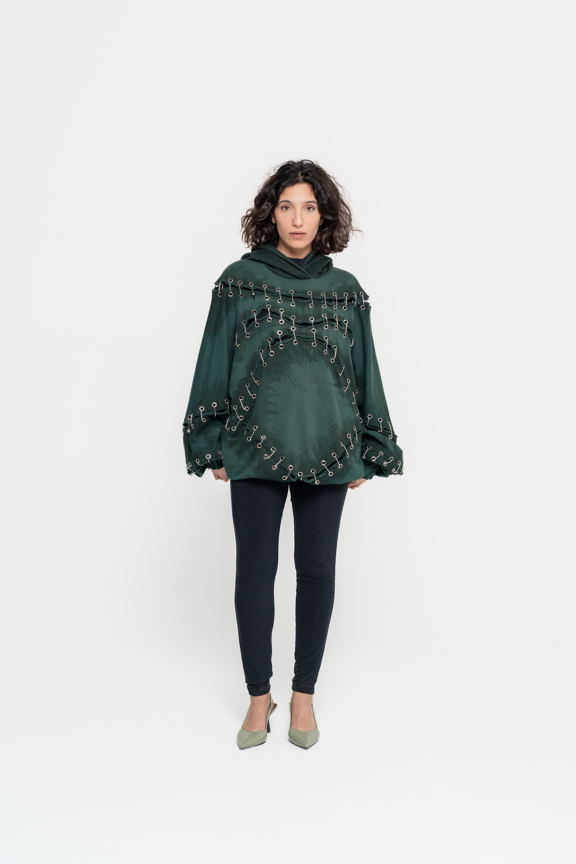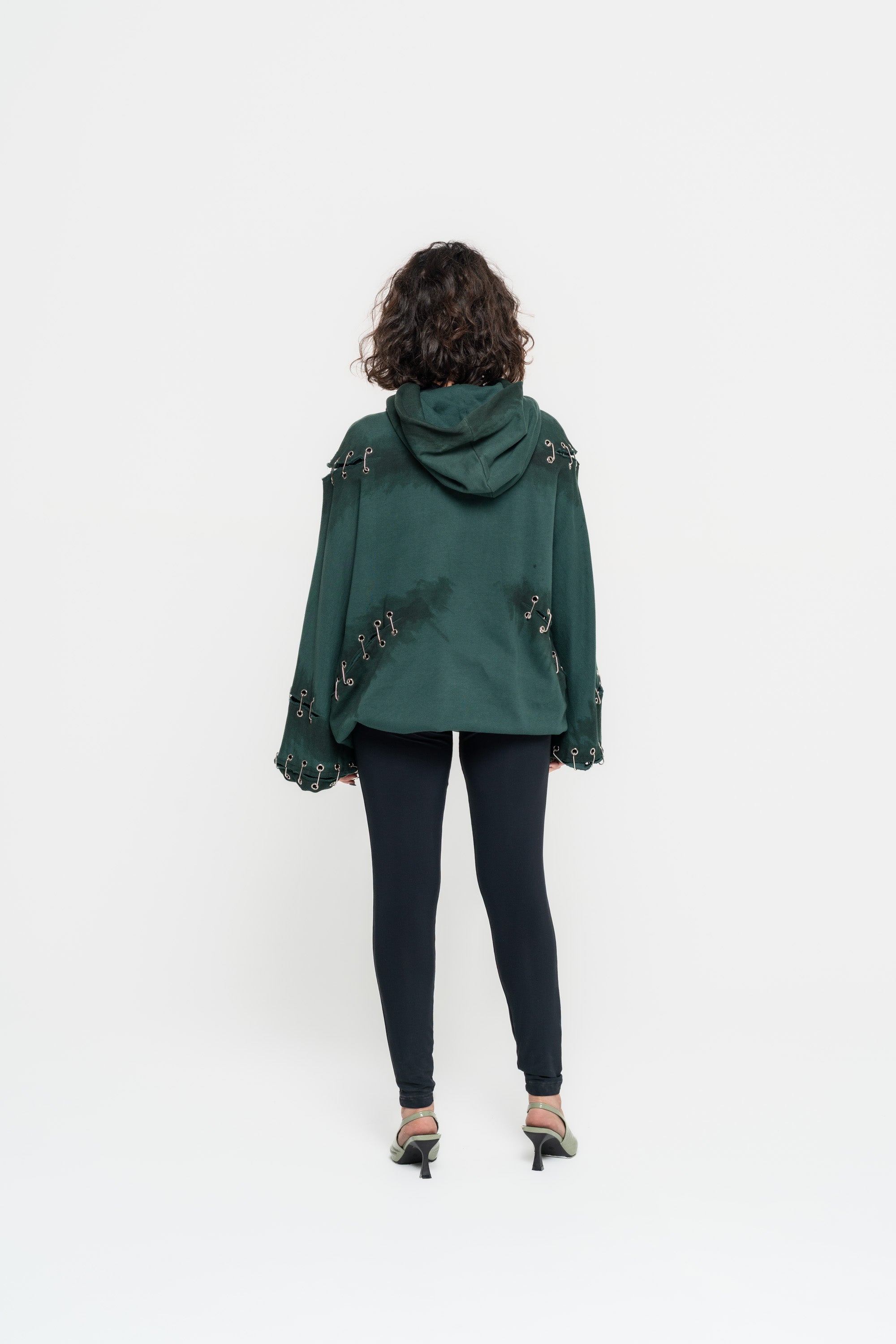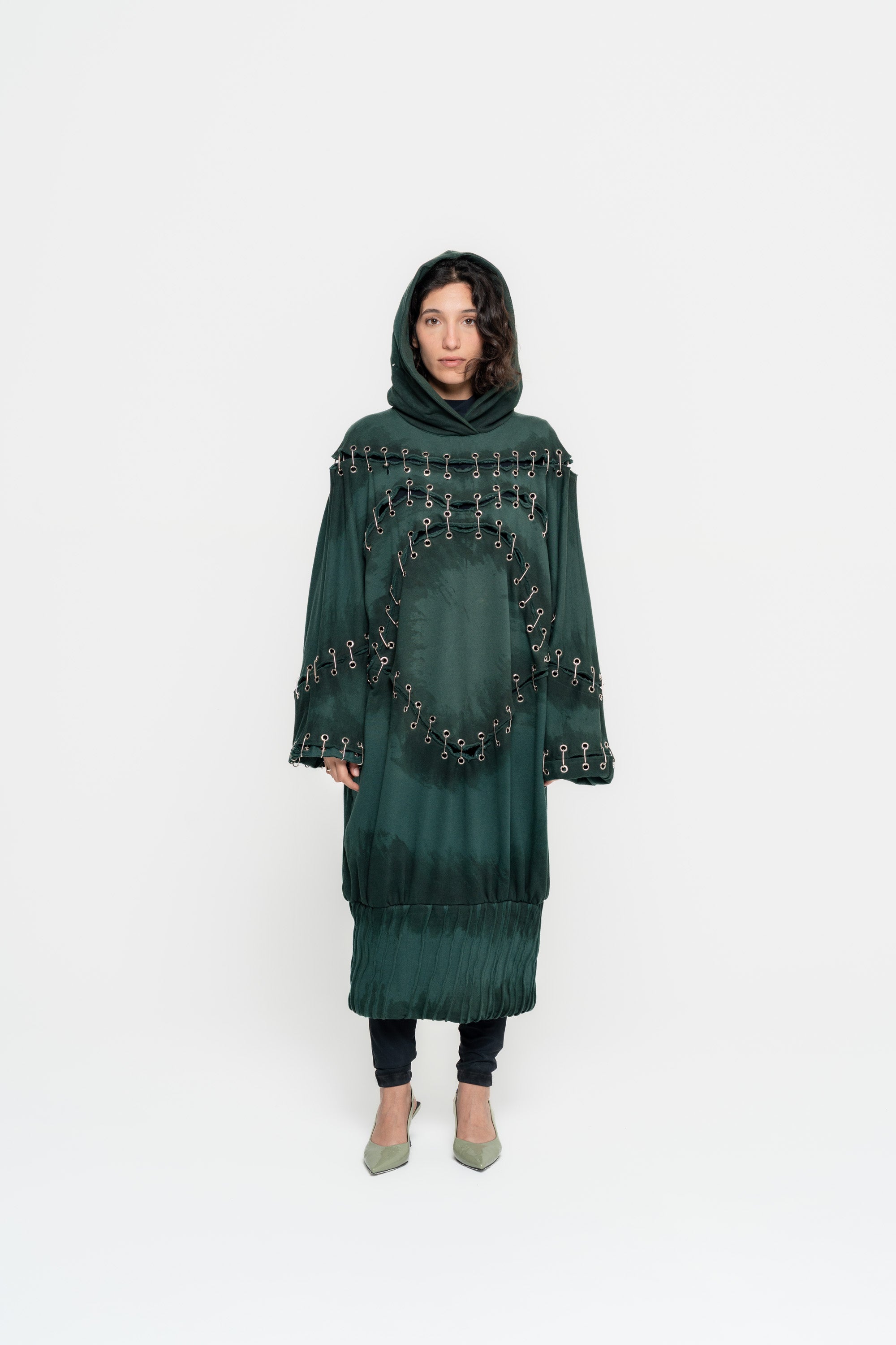 Long sleeved mini hoodie dress with cut-outs attached with hoops. Featuring large rib miniskirt at the hip.