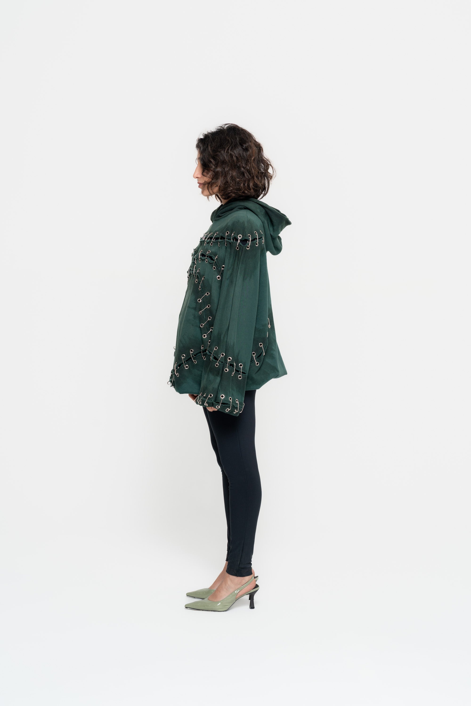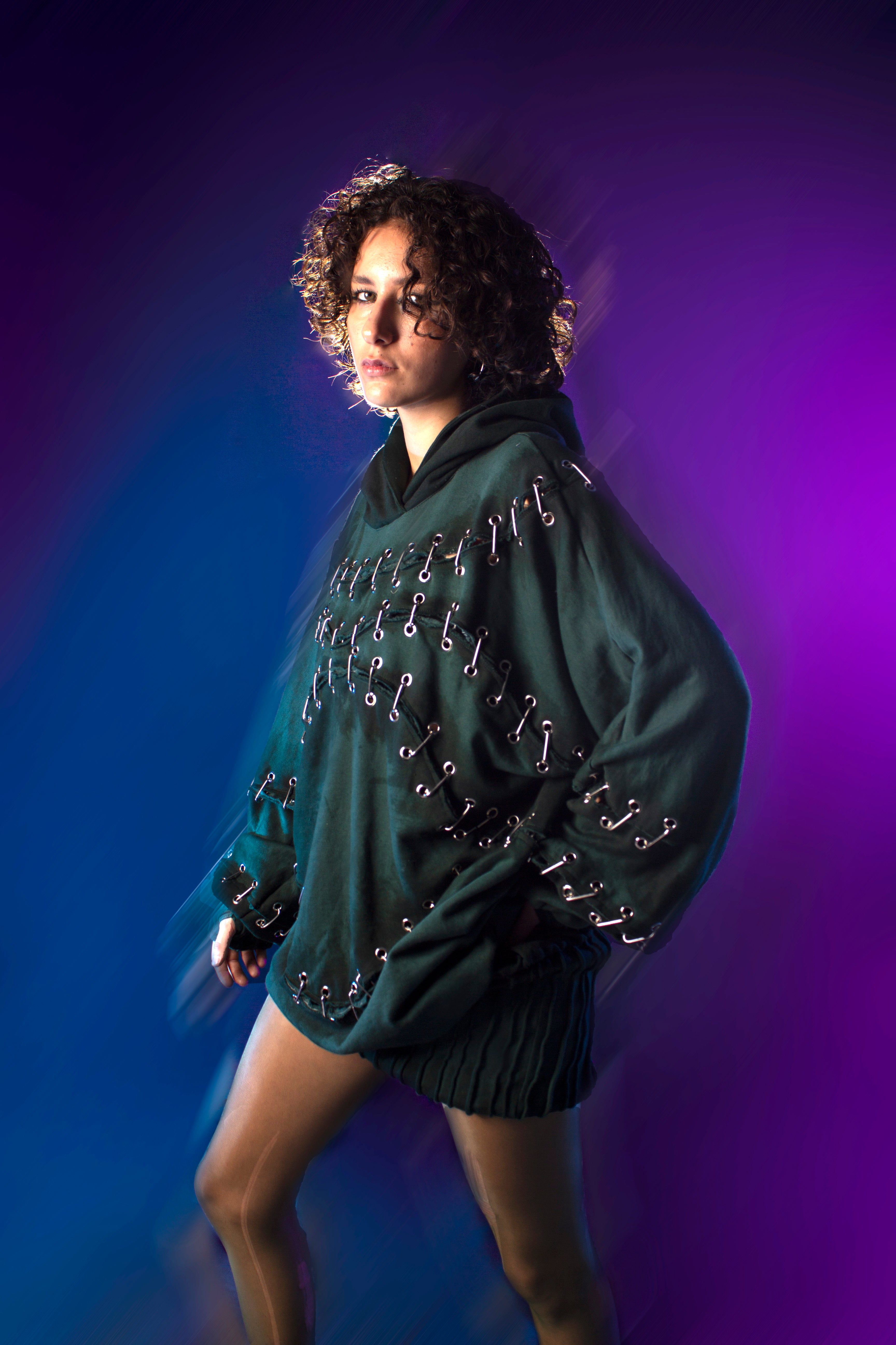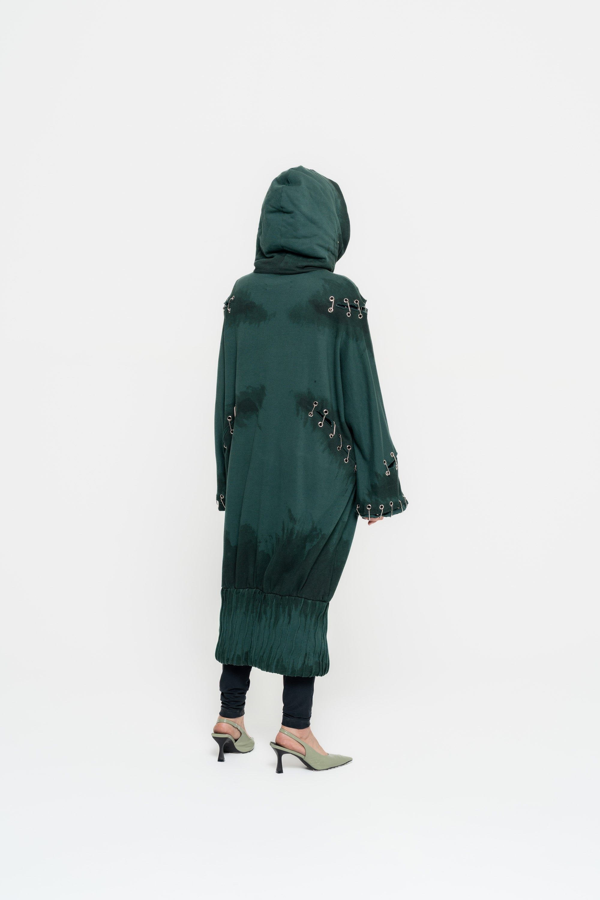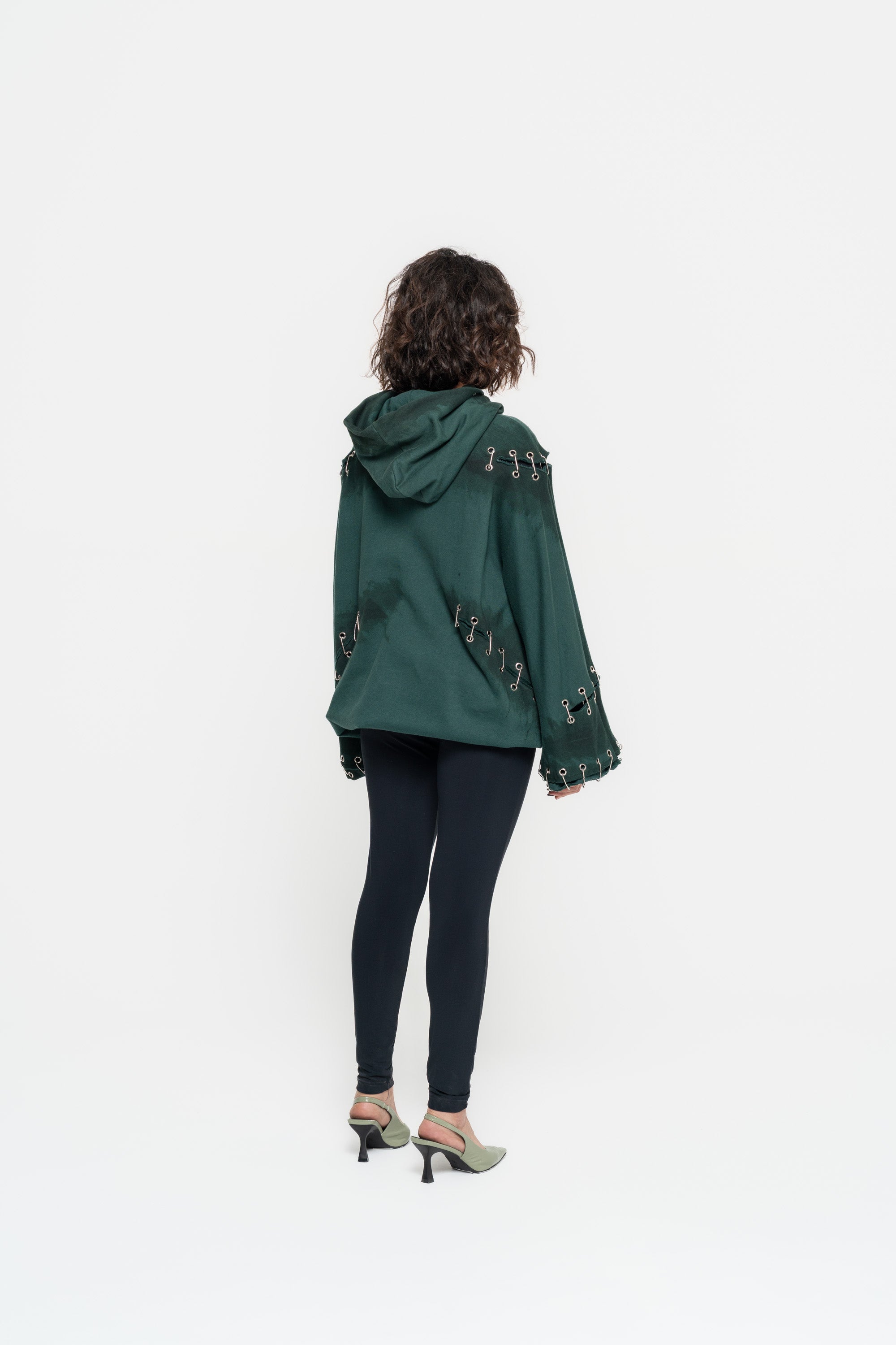 Long sleeved mini hoodie dress with cut-outs attached with hoops. Featuring large rib miniskirt at the hip.