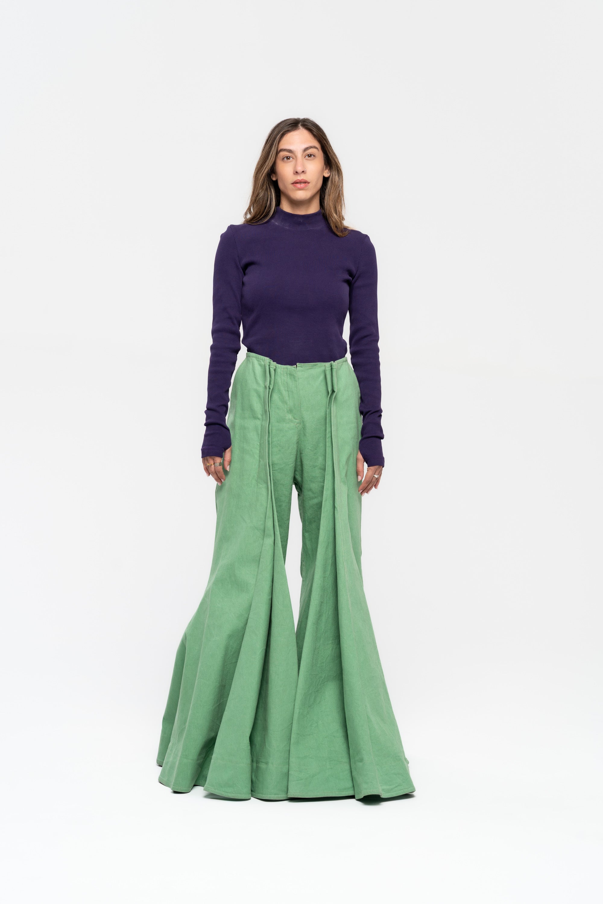 Tight fitting long sleeved turtleneck with thumb holes.