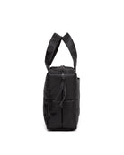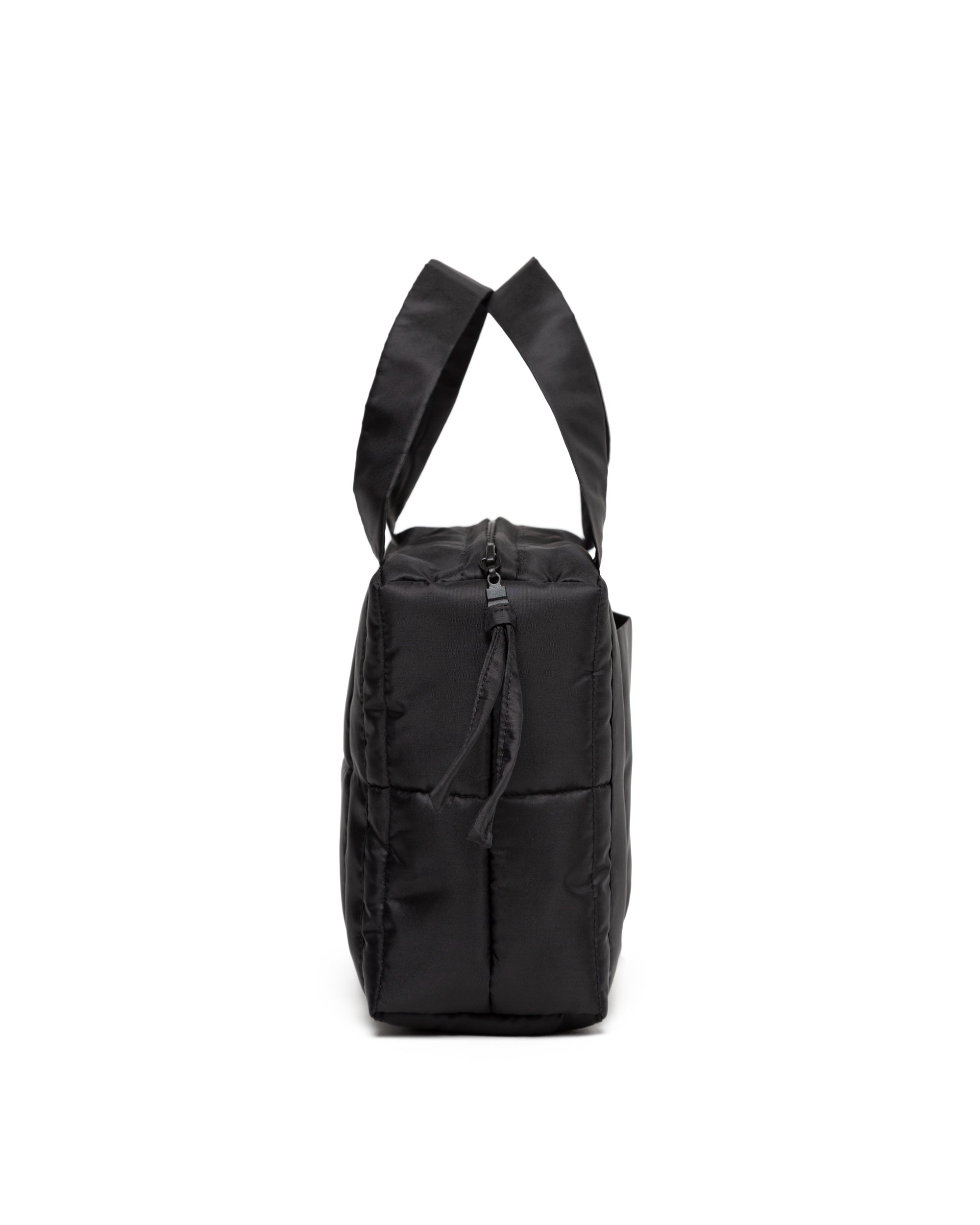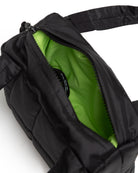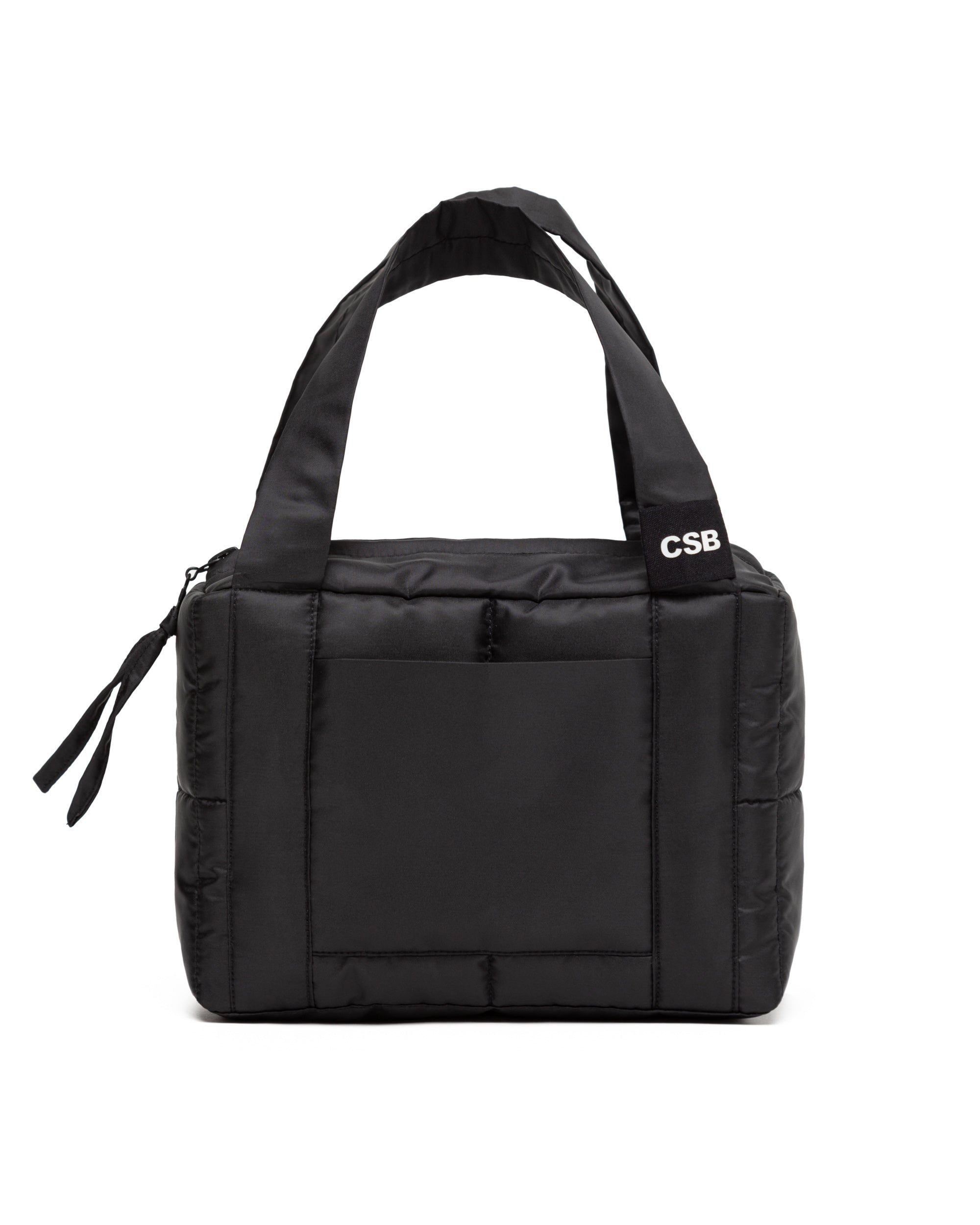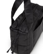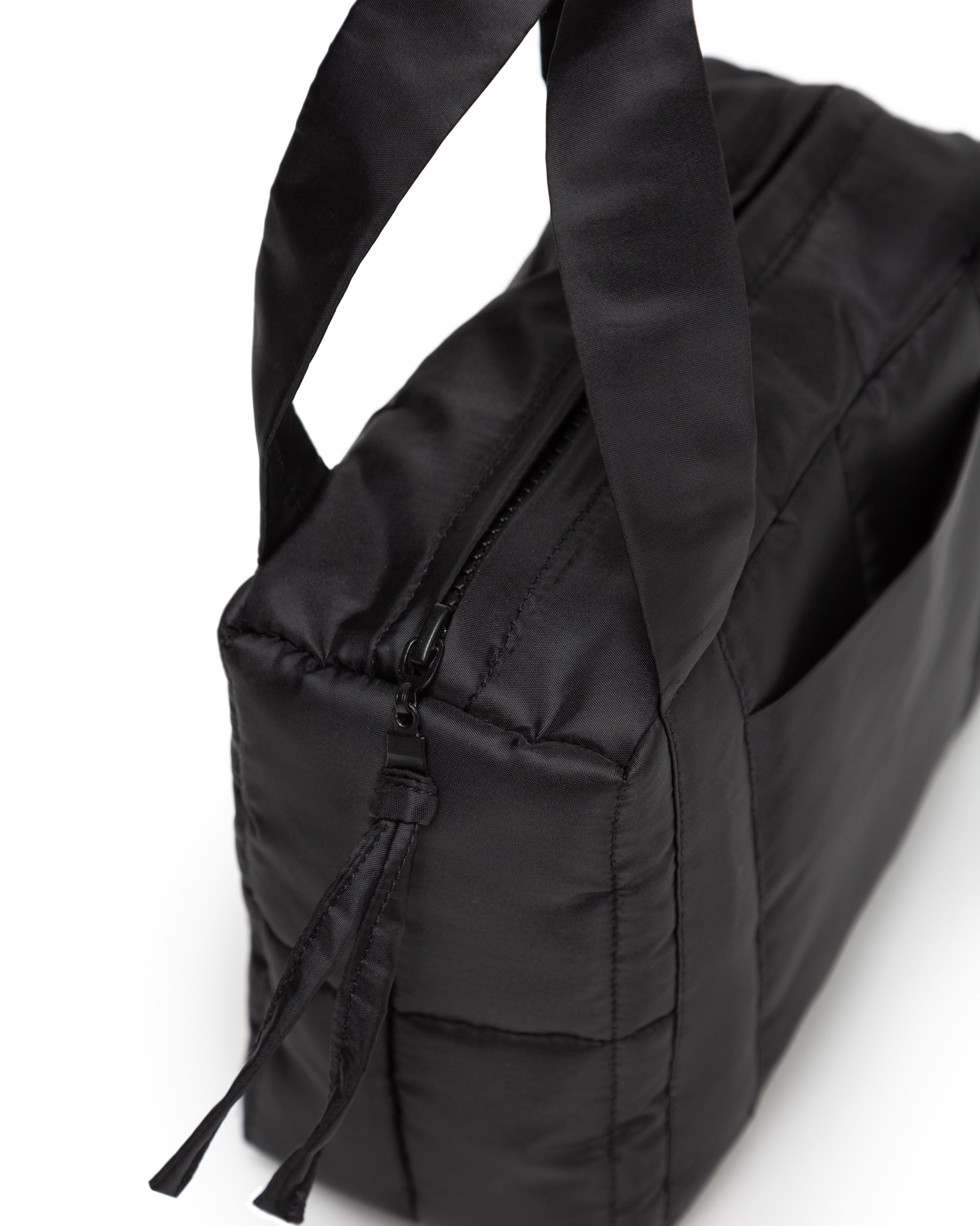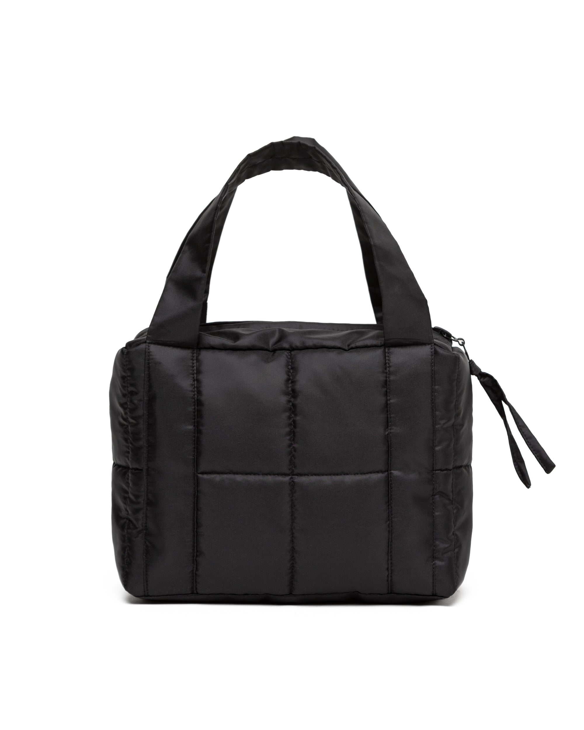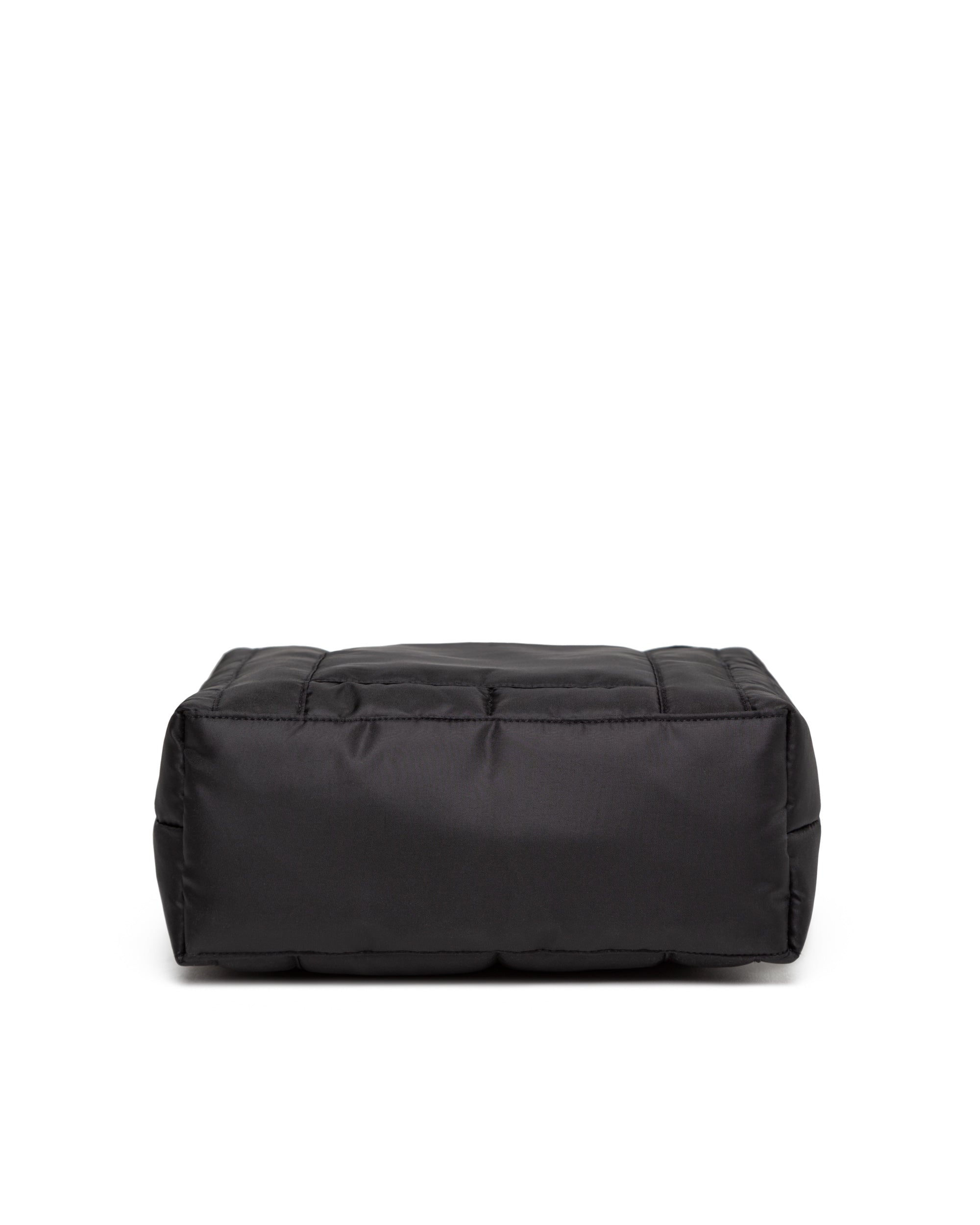 A mini rectangular puffer bag in black nylon. Featuring an outside pocket.