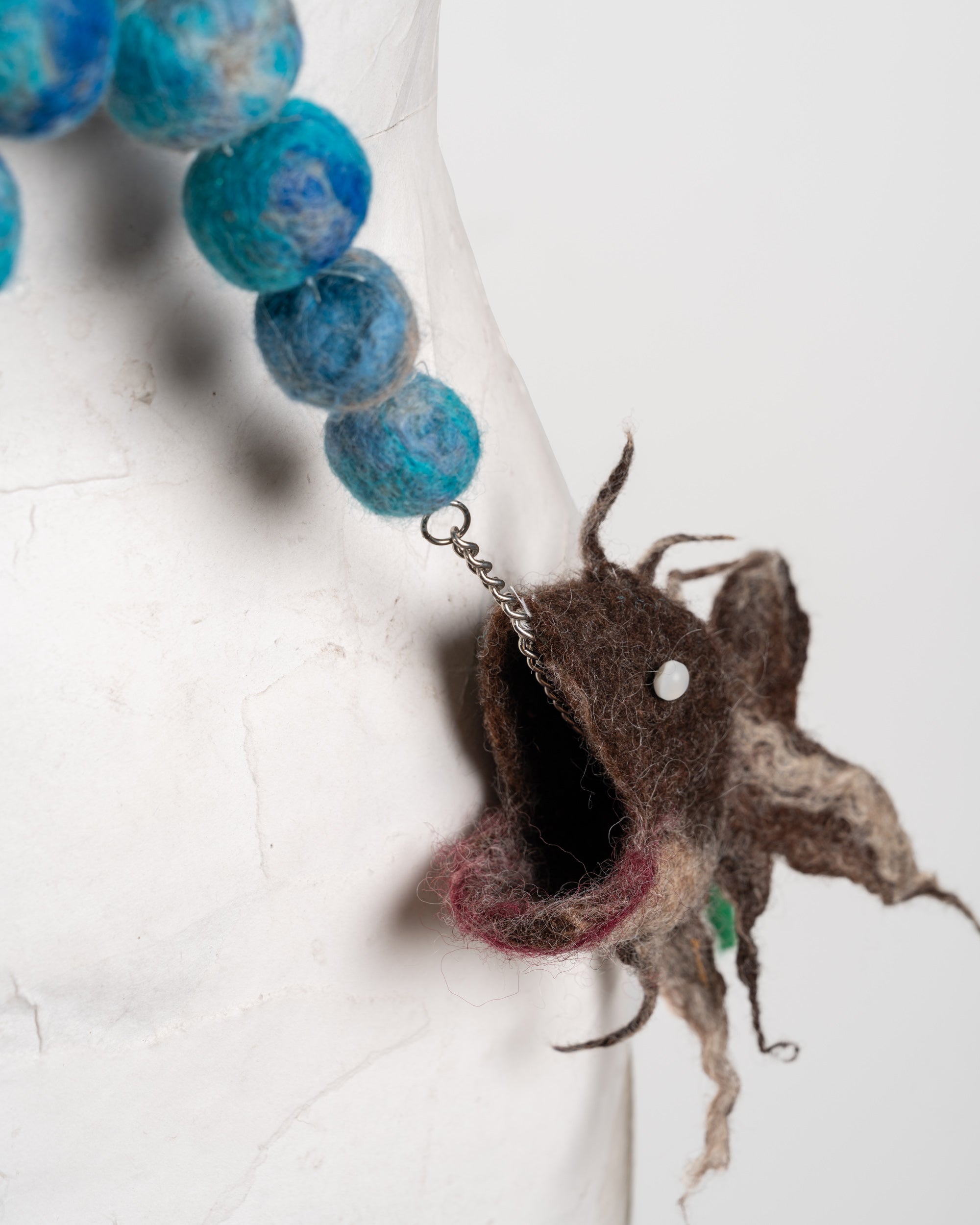 Made from felted wool and metal chains, Creature Comforts are 3D sea creature accessories that can be worn across the body in various ways.