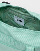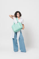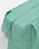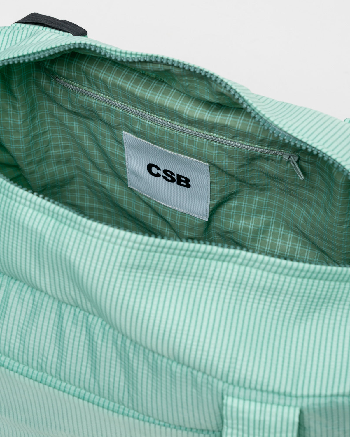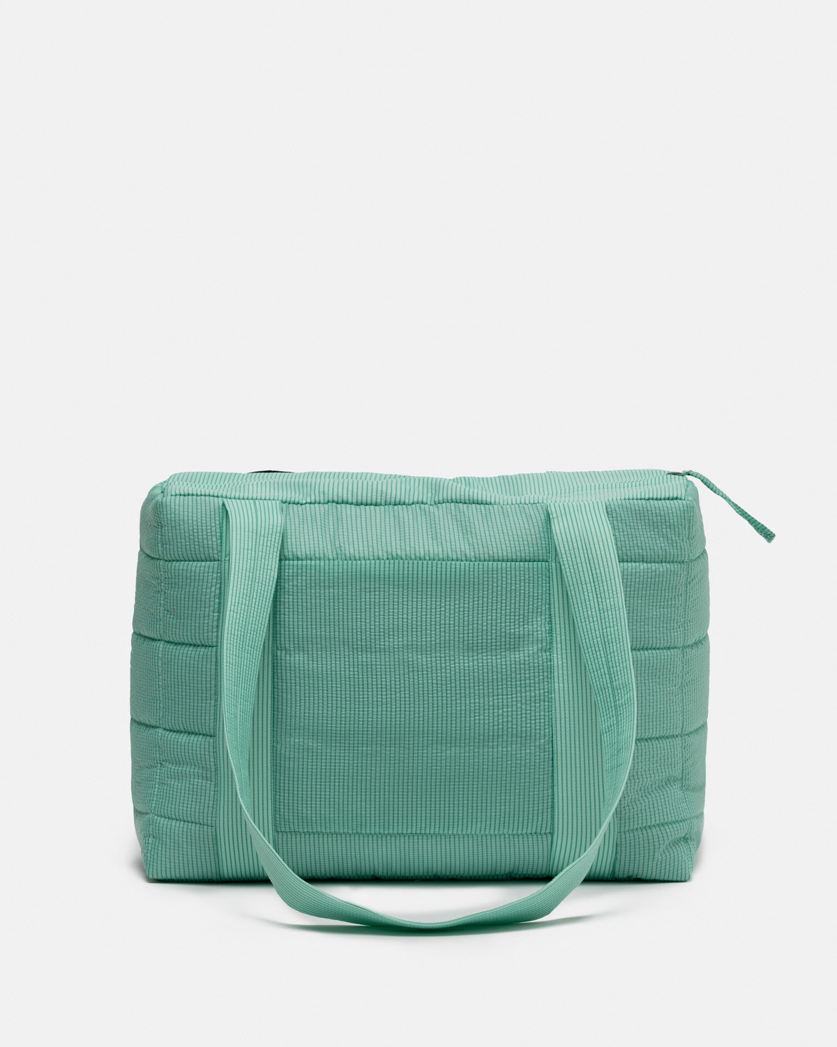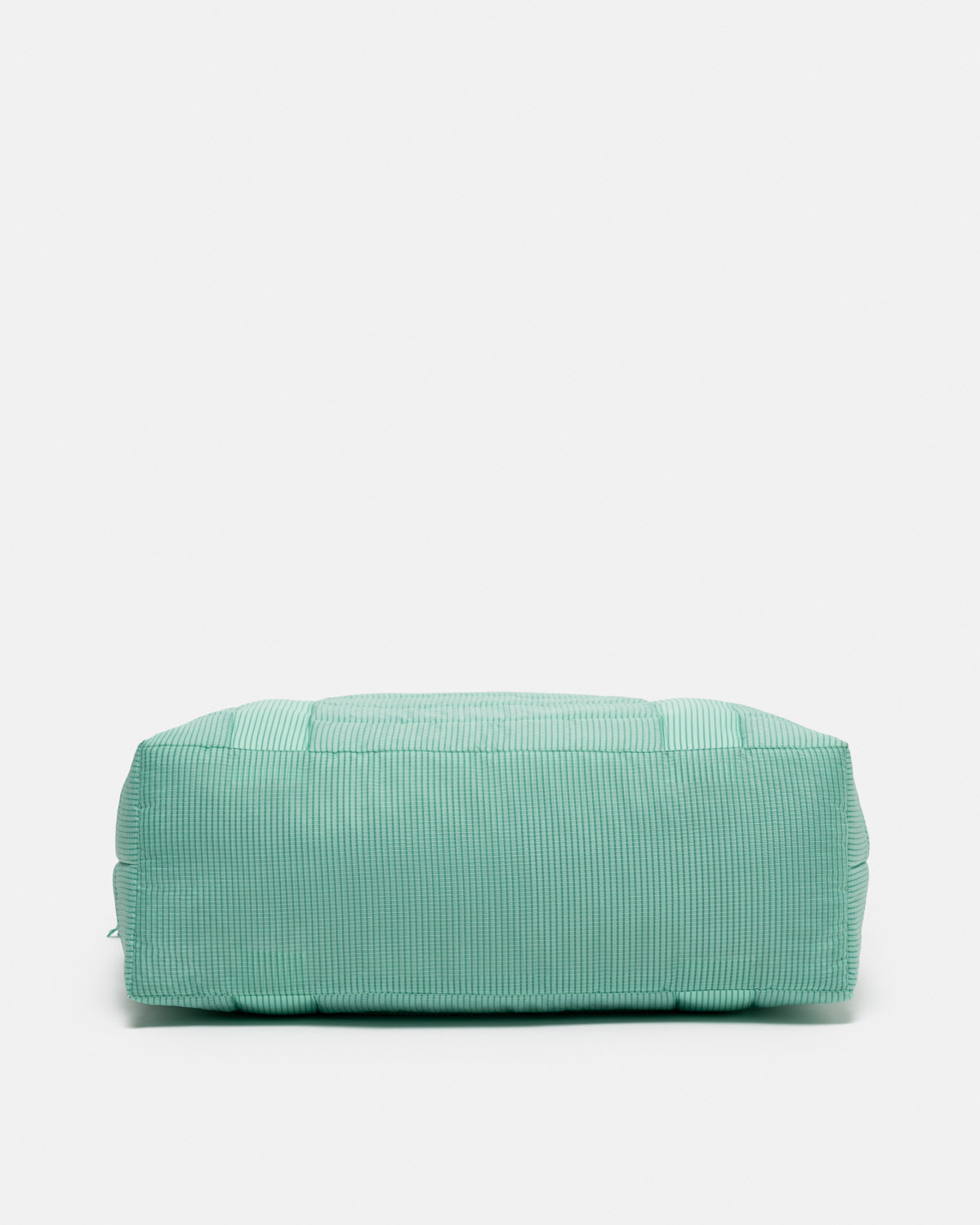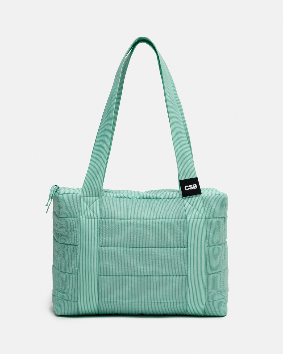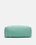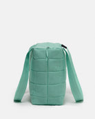 Medium rectangular puffer bag in light green. Featuring a pocket on the outside and a zipper pocket on the inside.
