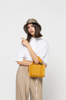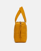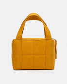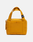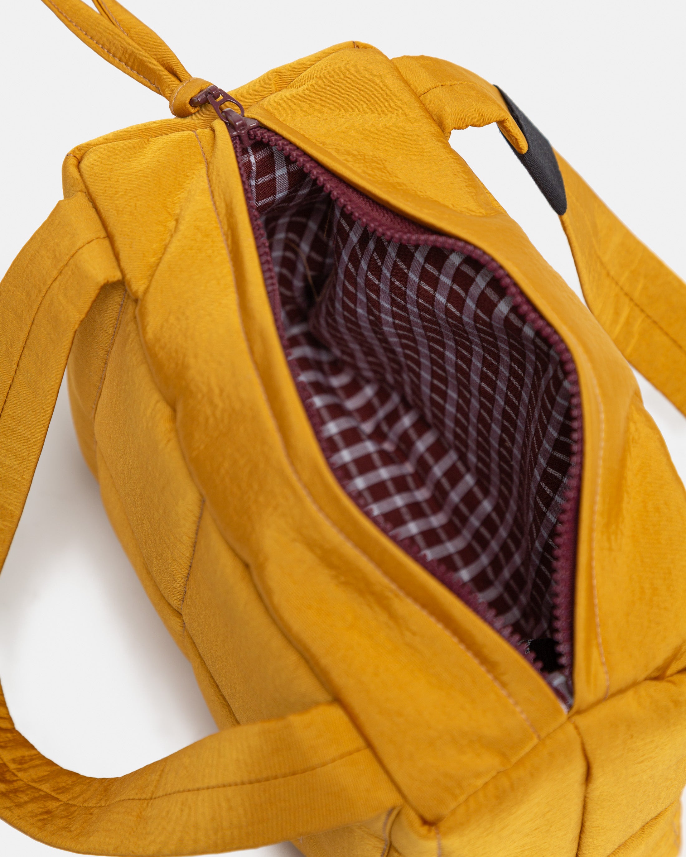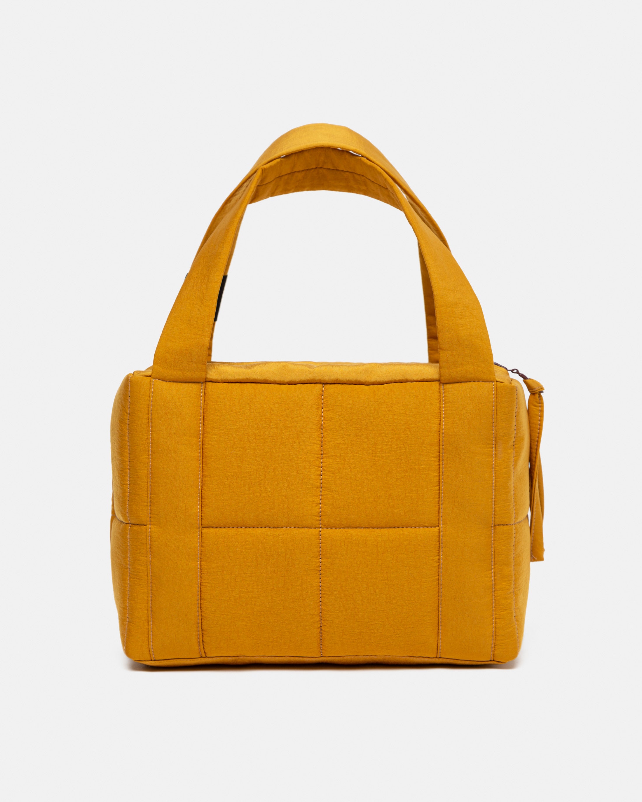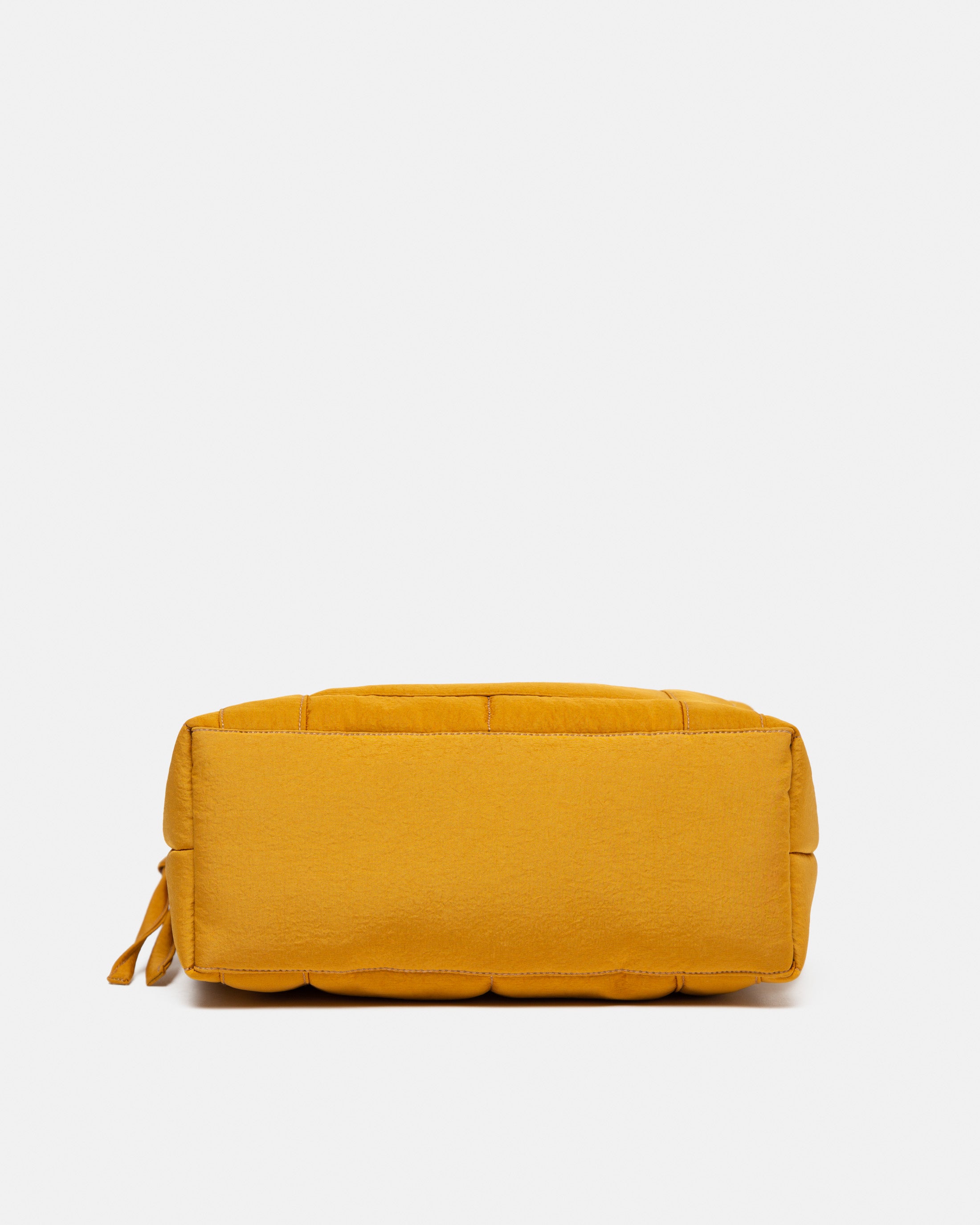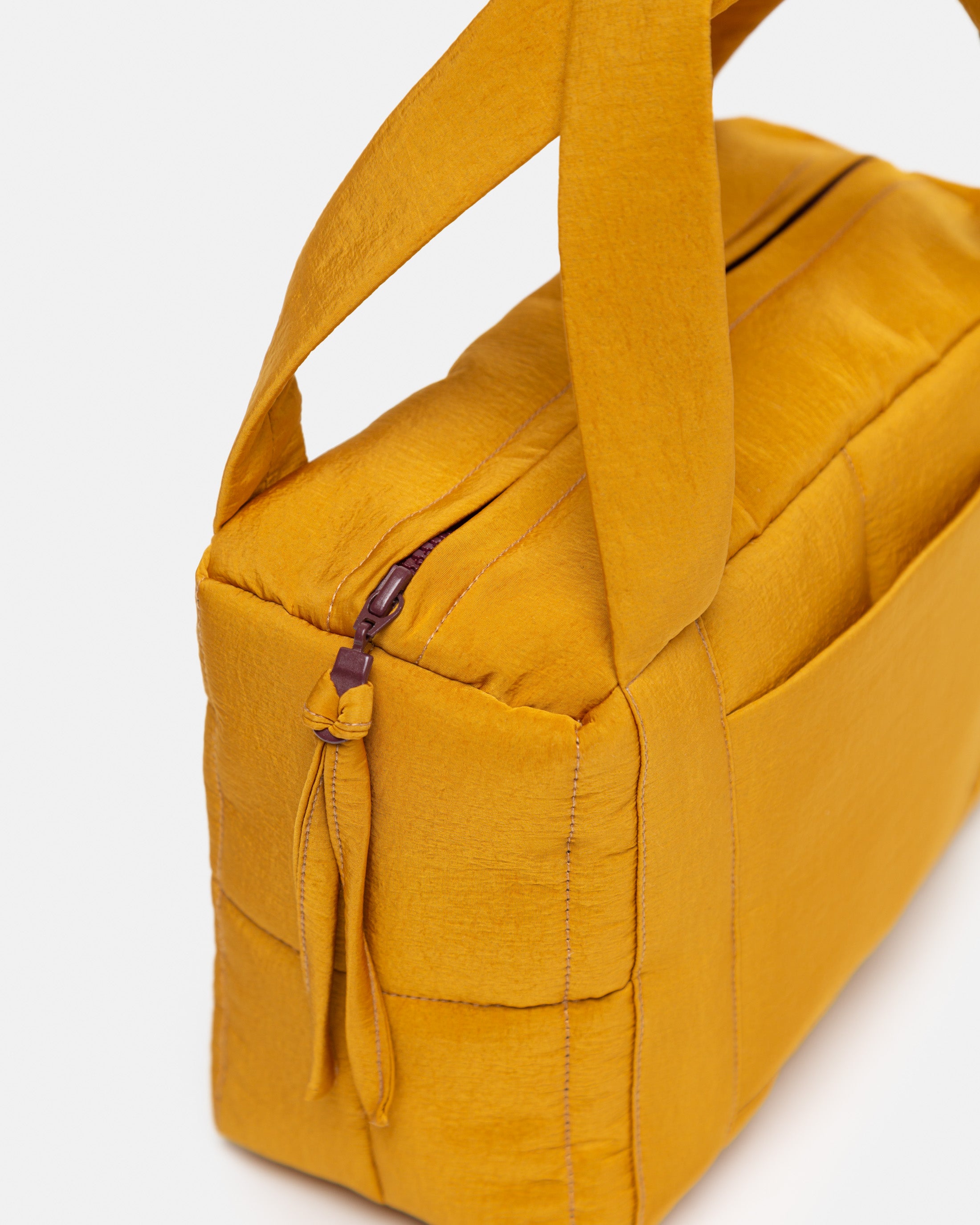 A mini rectangular puffer bag in mustard nylon. Featuring an outside pocket.
