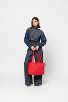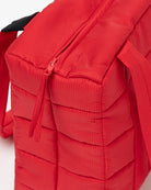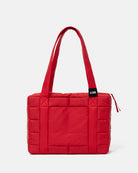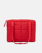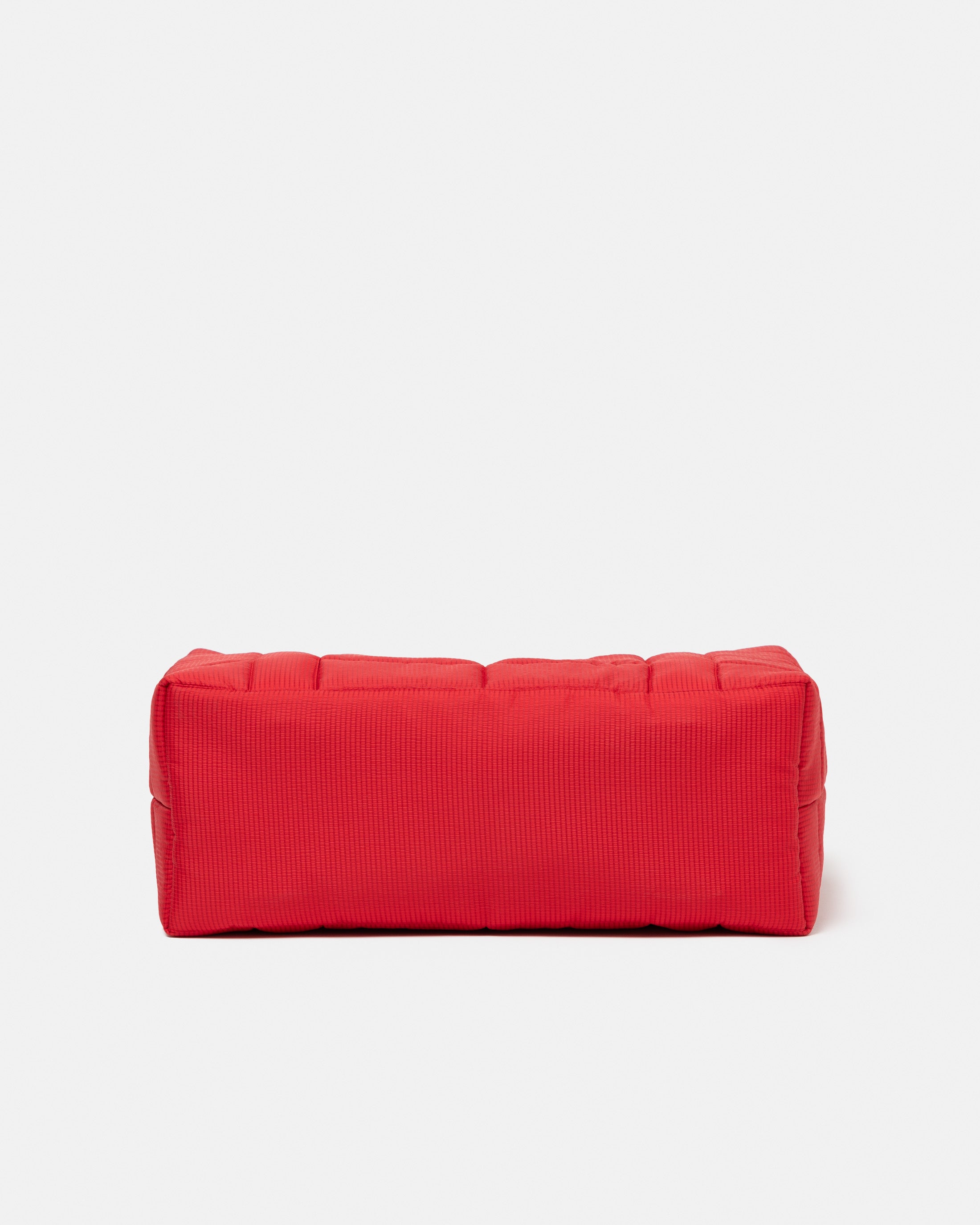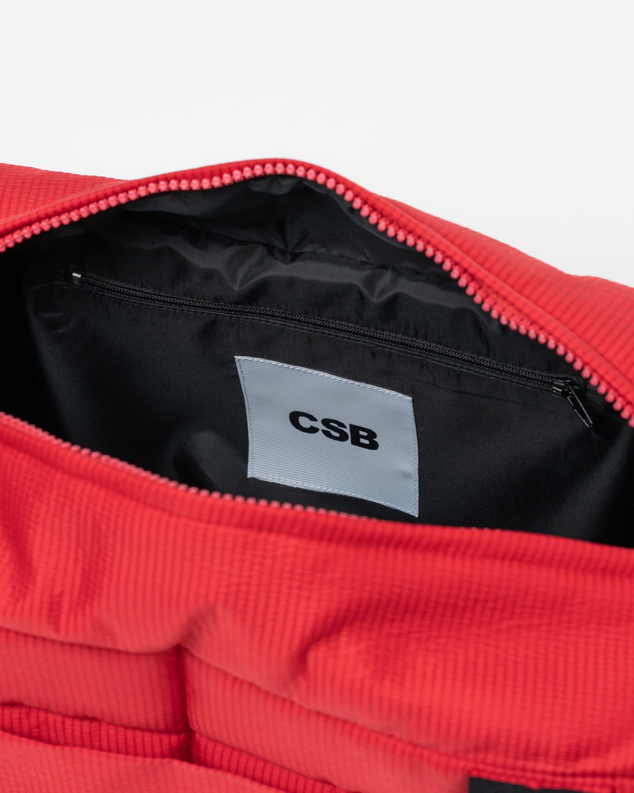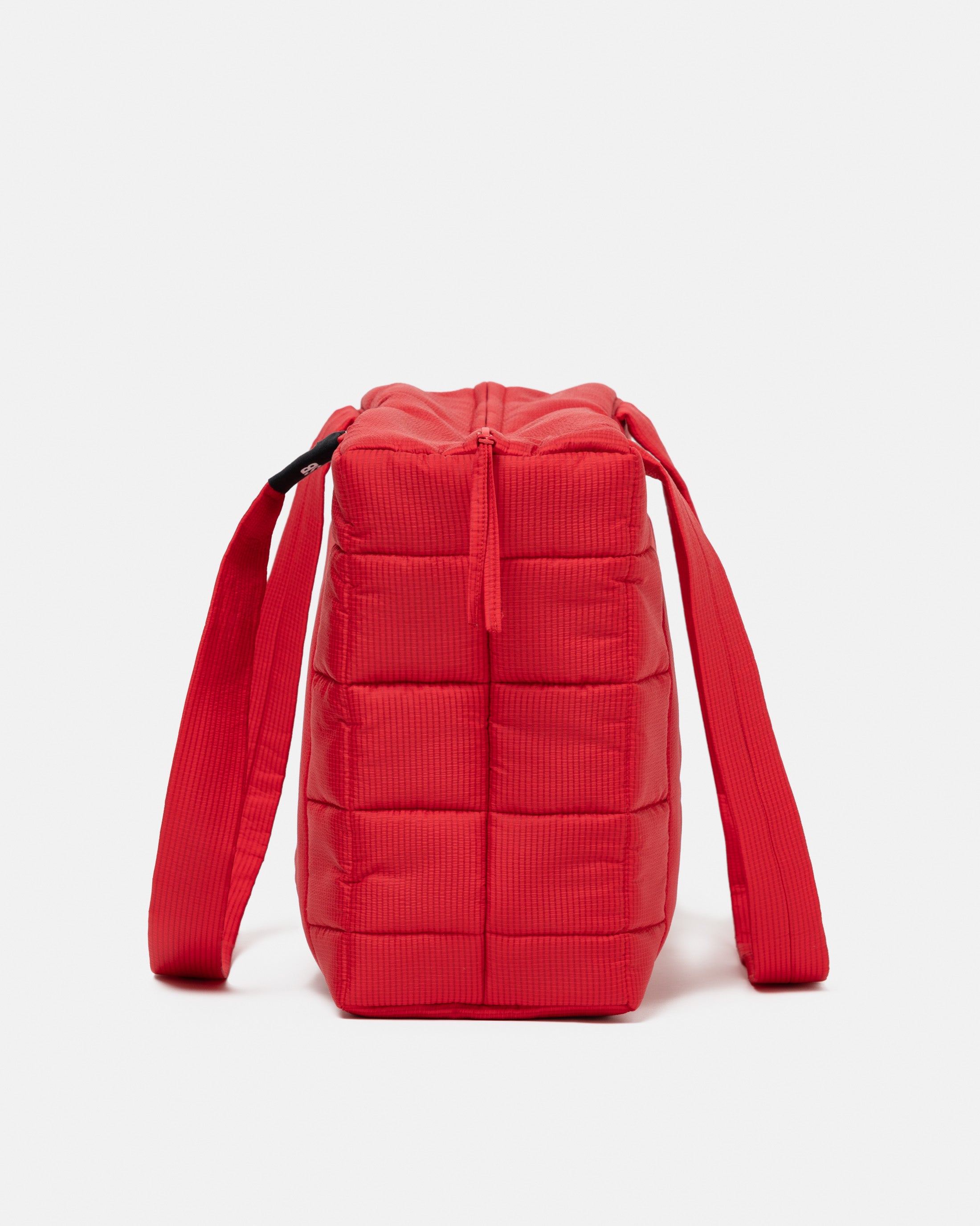 Medium rectangular puffer bag in bright red. Featuring a pocket on the outside and a zipper pocket on the inside.