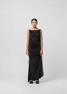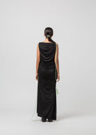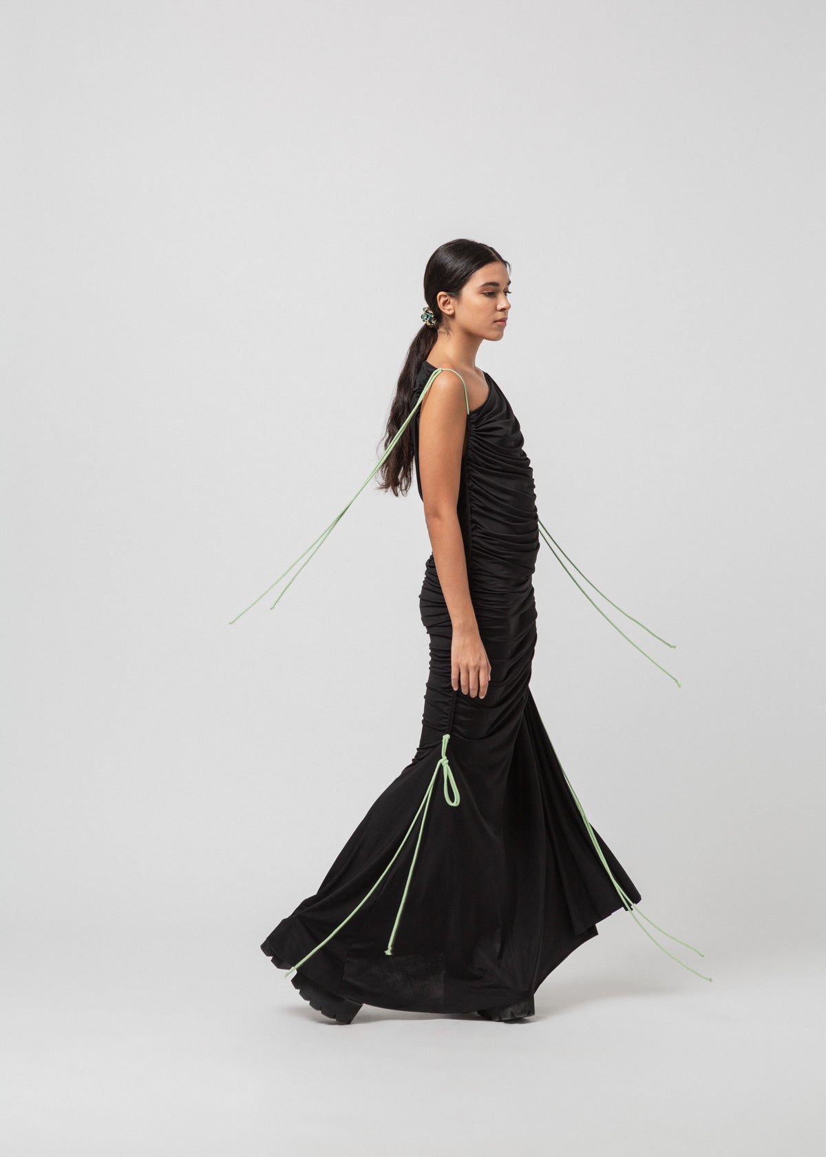 The body-hugging one-size-fits-most full-length dress includes knots on the straps and a gathered tunnel with sliding ropes on both sides allowing for size malleability.