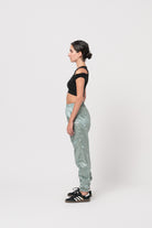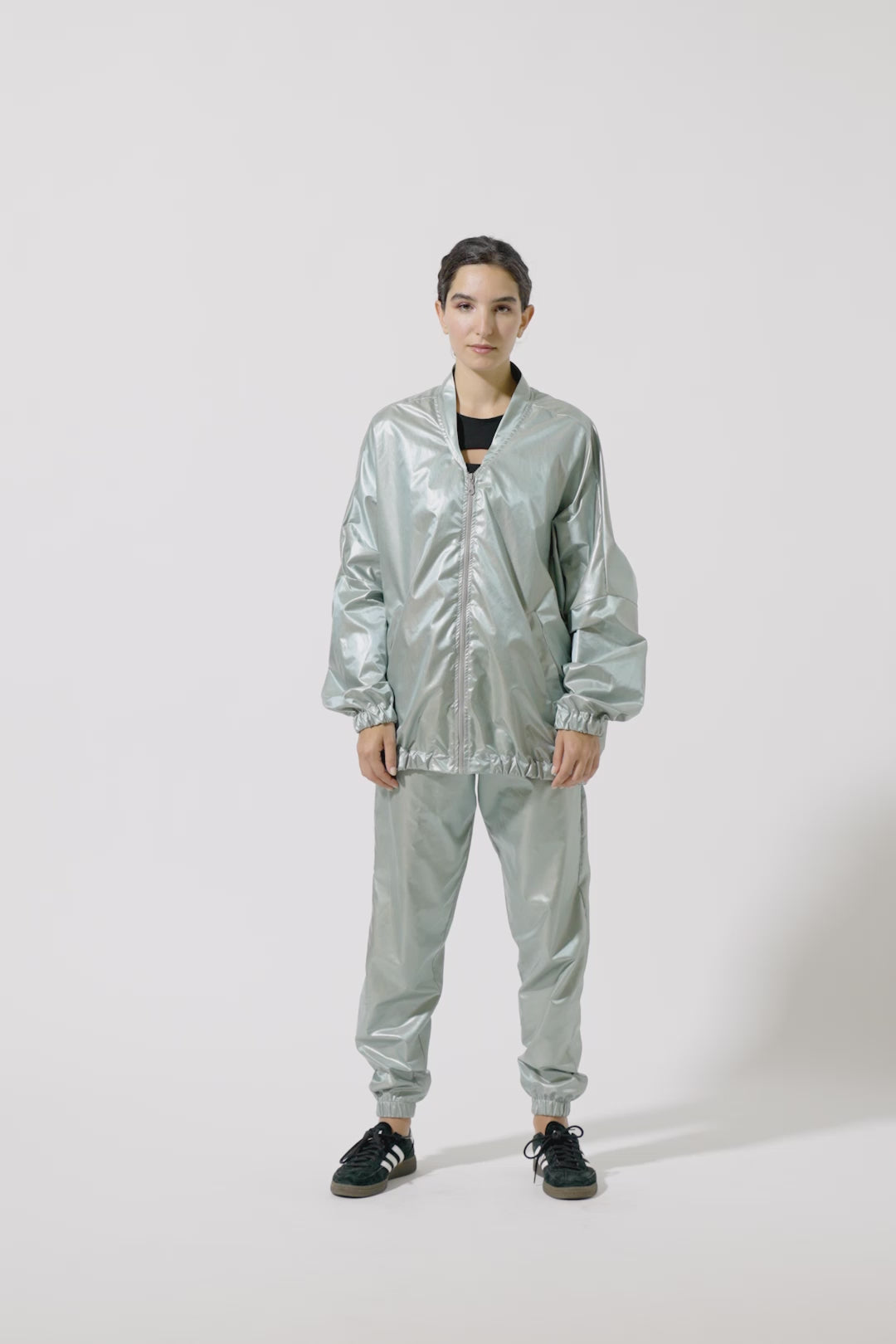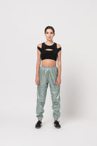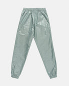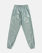 Elastic, high waisted nylon pants in metallic blue nylon with cuffed, gathered ankles.
