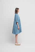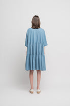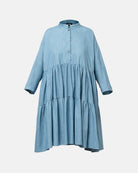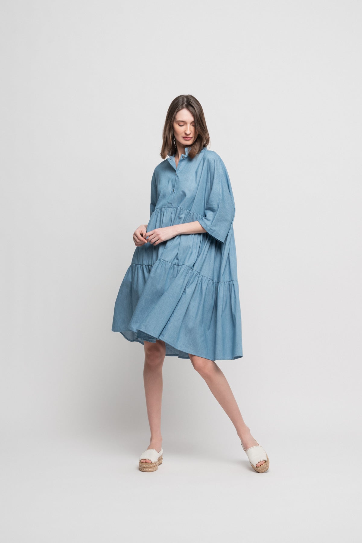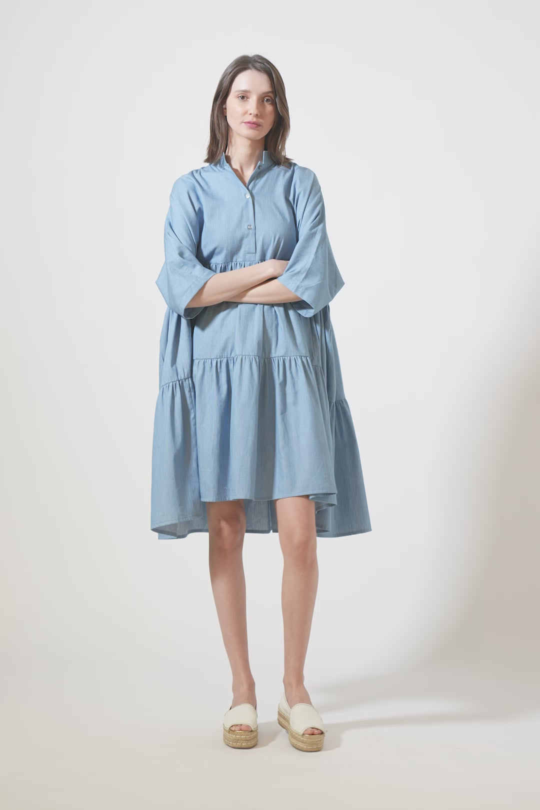 A shortsleeved, loose, knee length dress in sky blue washed denim. Features two tiers of ruffles and a mandarin collar.