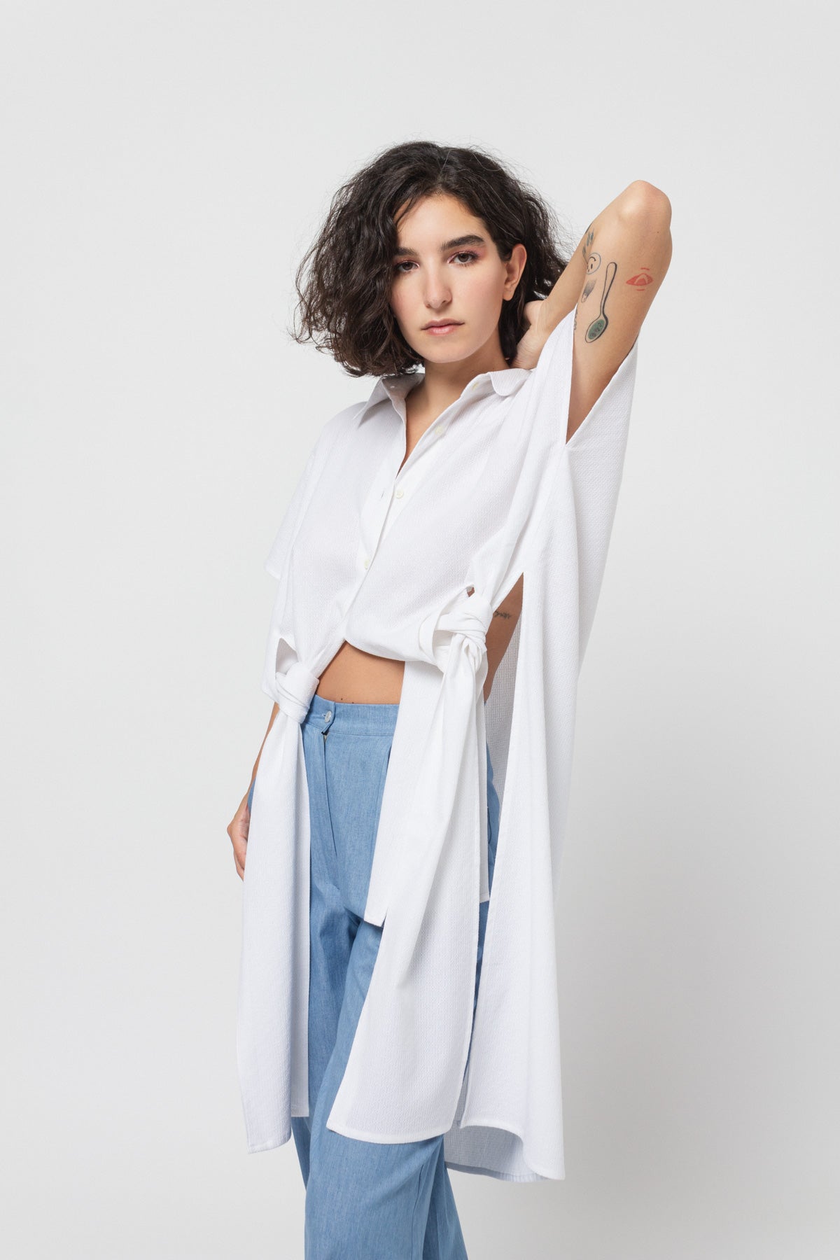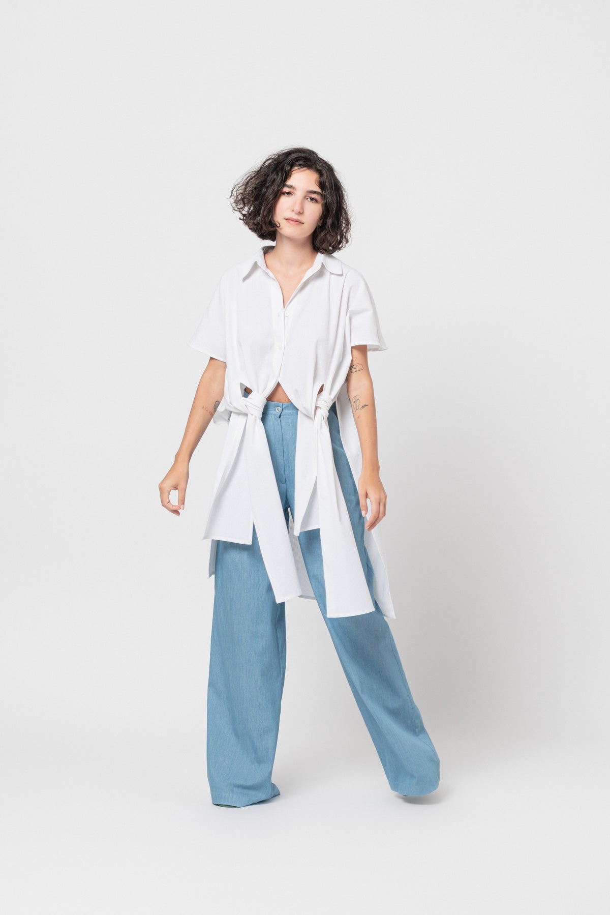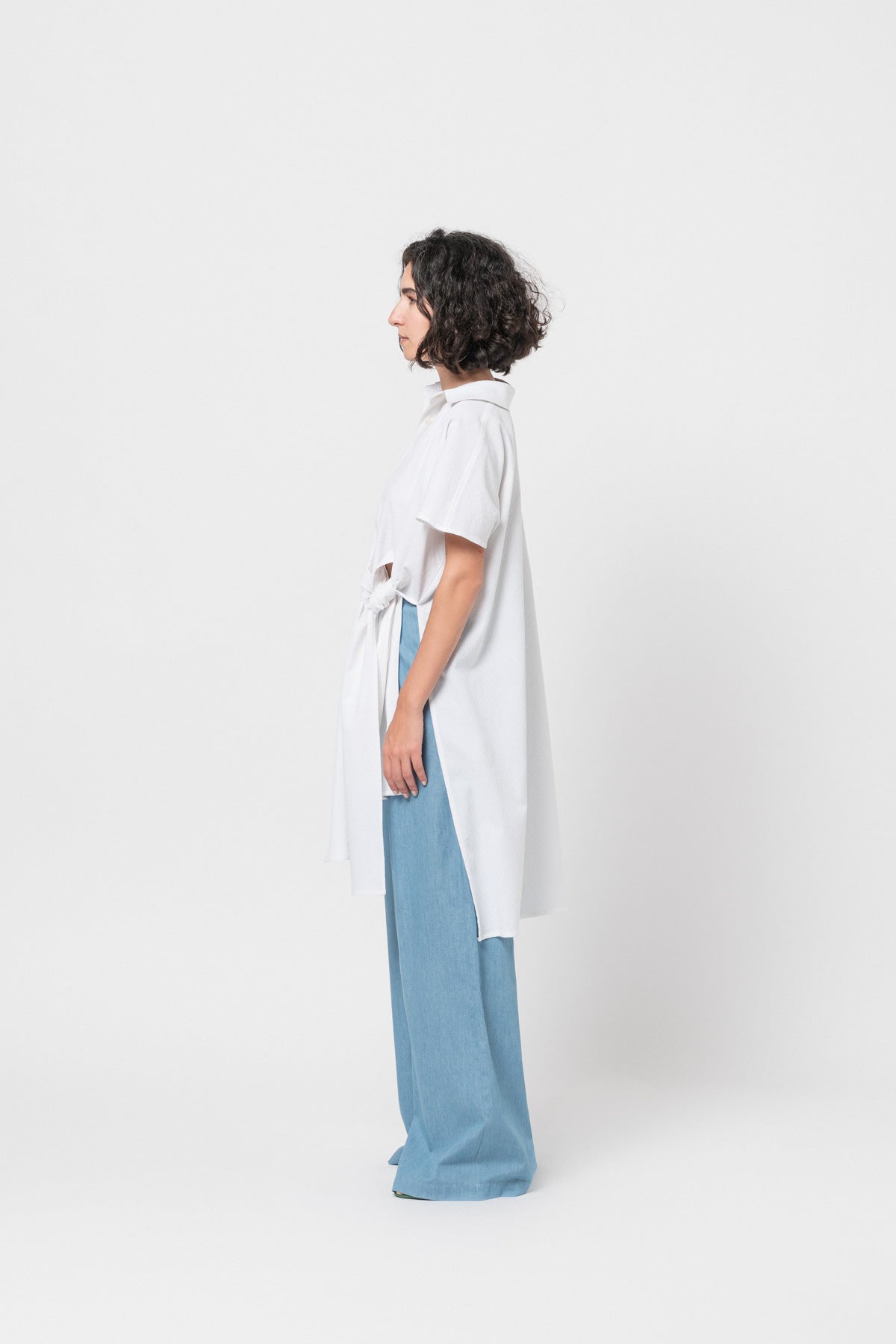 Longer in the back, this crisp white cotton shirt features dangling panels in the front to tie up or let hang.
