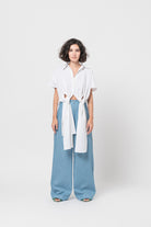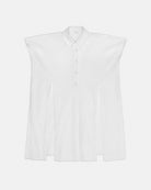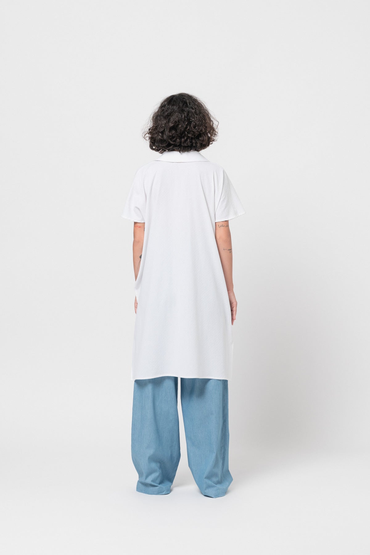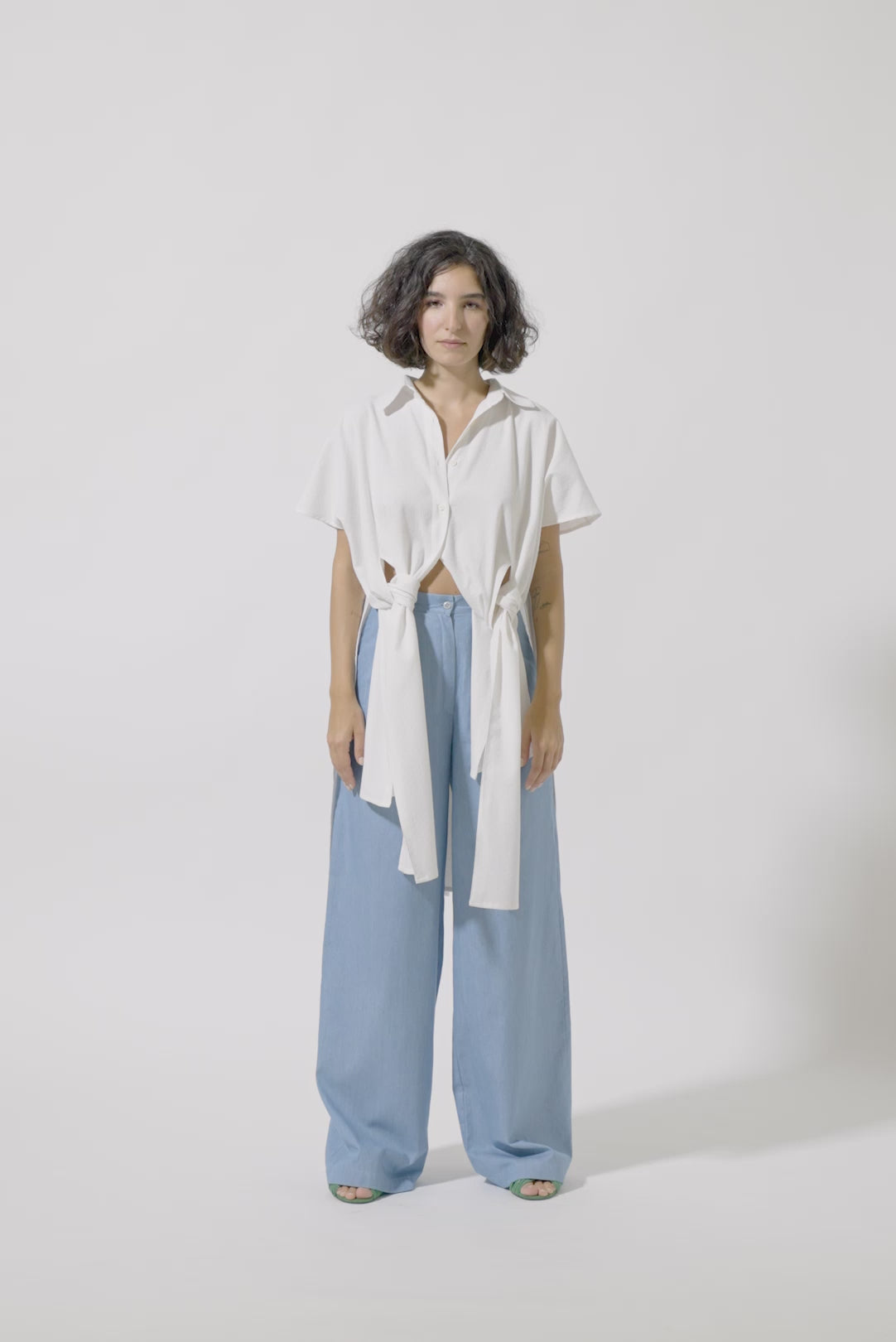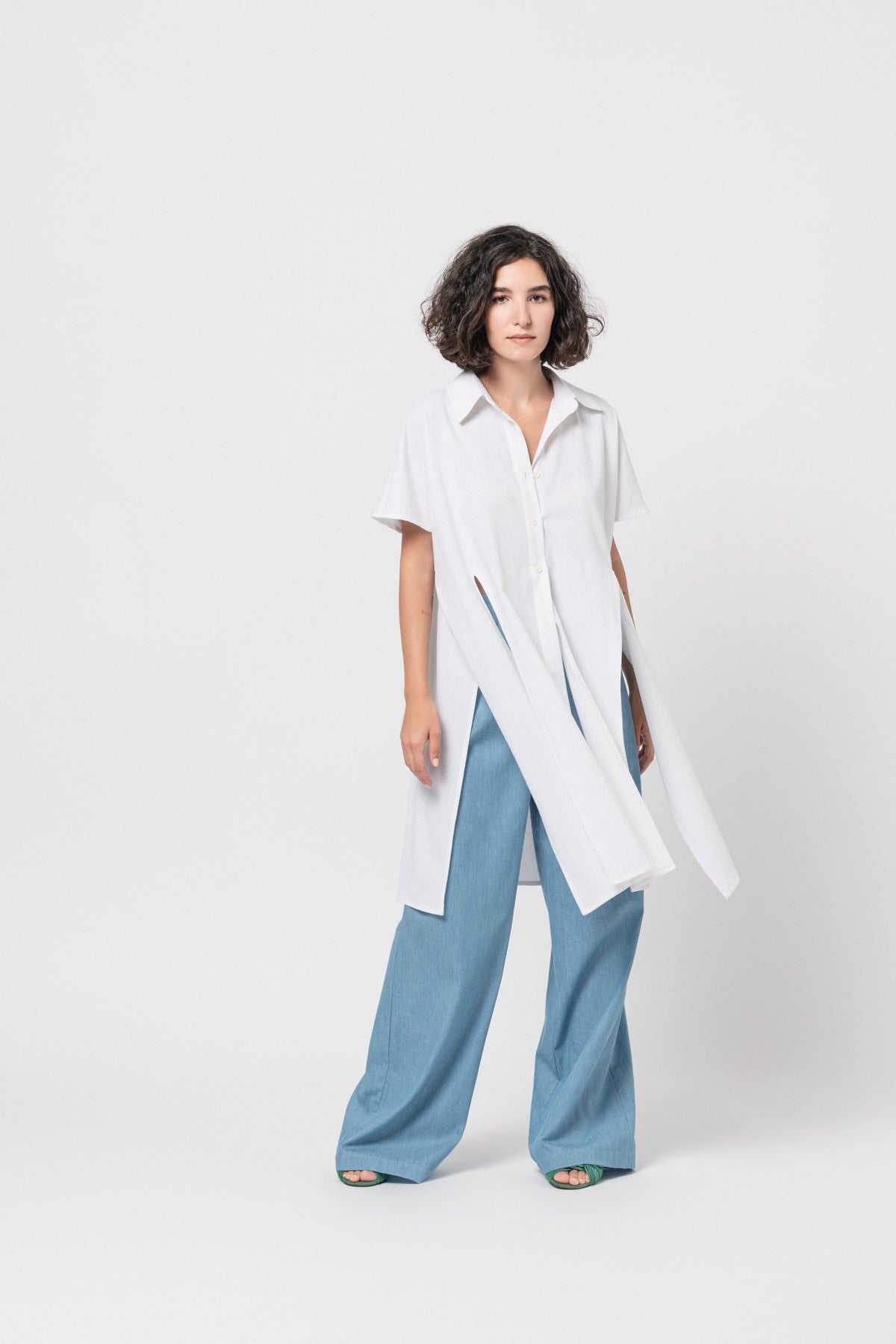 Longer in the back, this crisp white cotton shirt features dangling panels in the front to tie up or let hang.