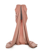 A dress made of eight meters of crepe satin, inspired by bedsheets. It features invisible finishing and a suspended inner corset made of faux leather. The corset is constructed in a way that covers the intimate area.