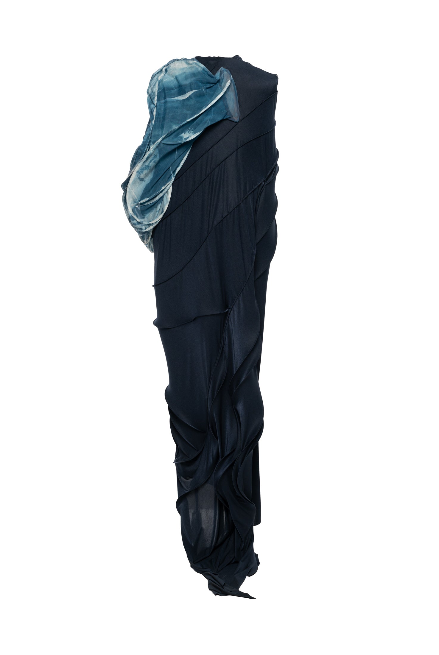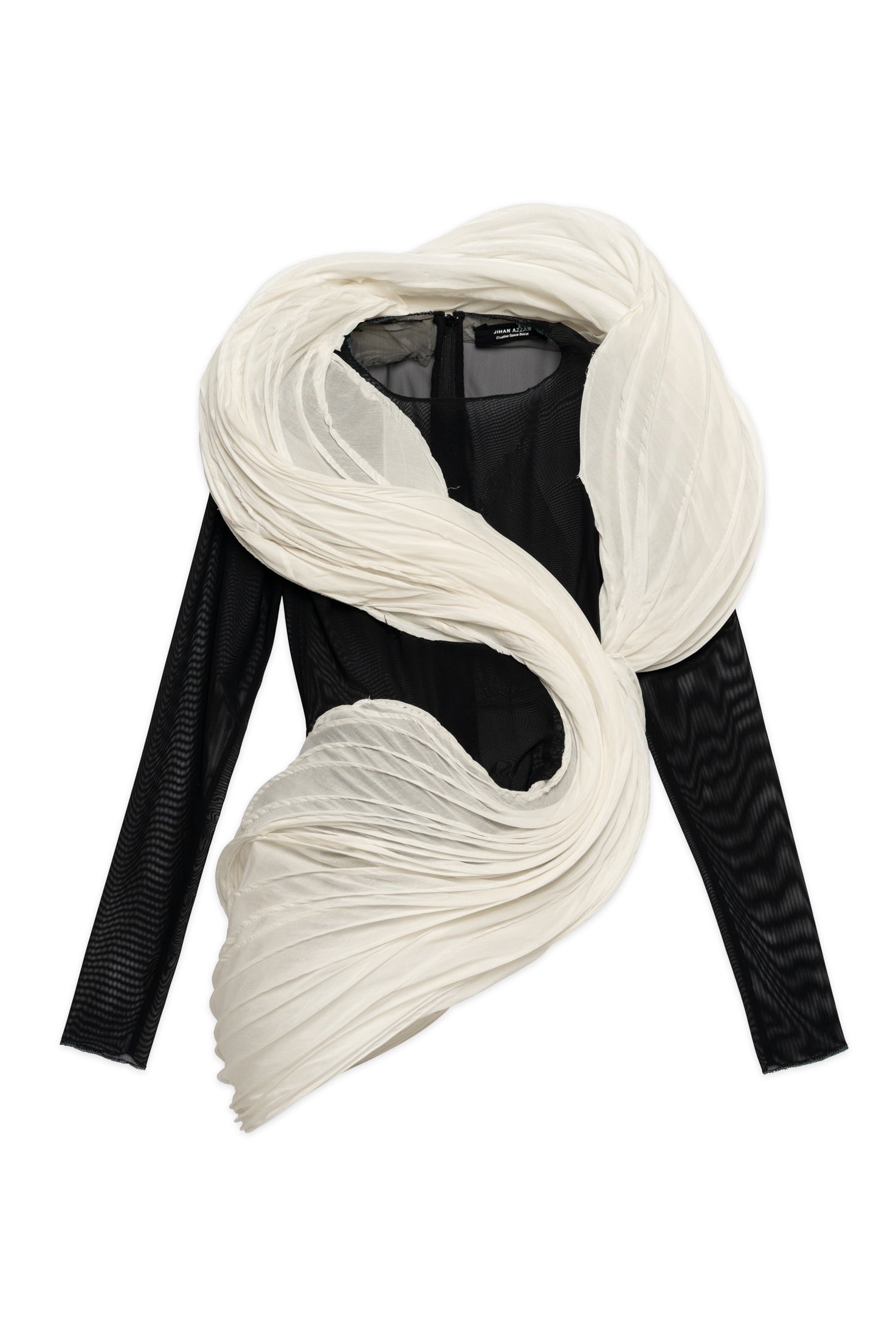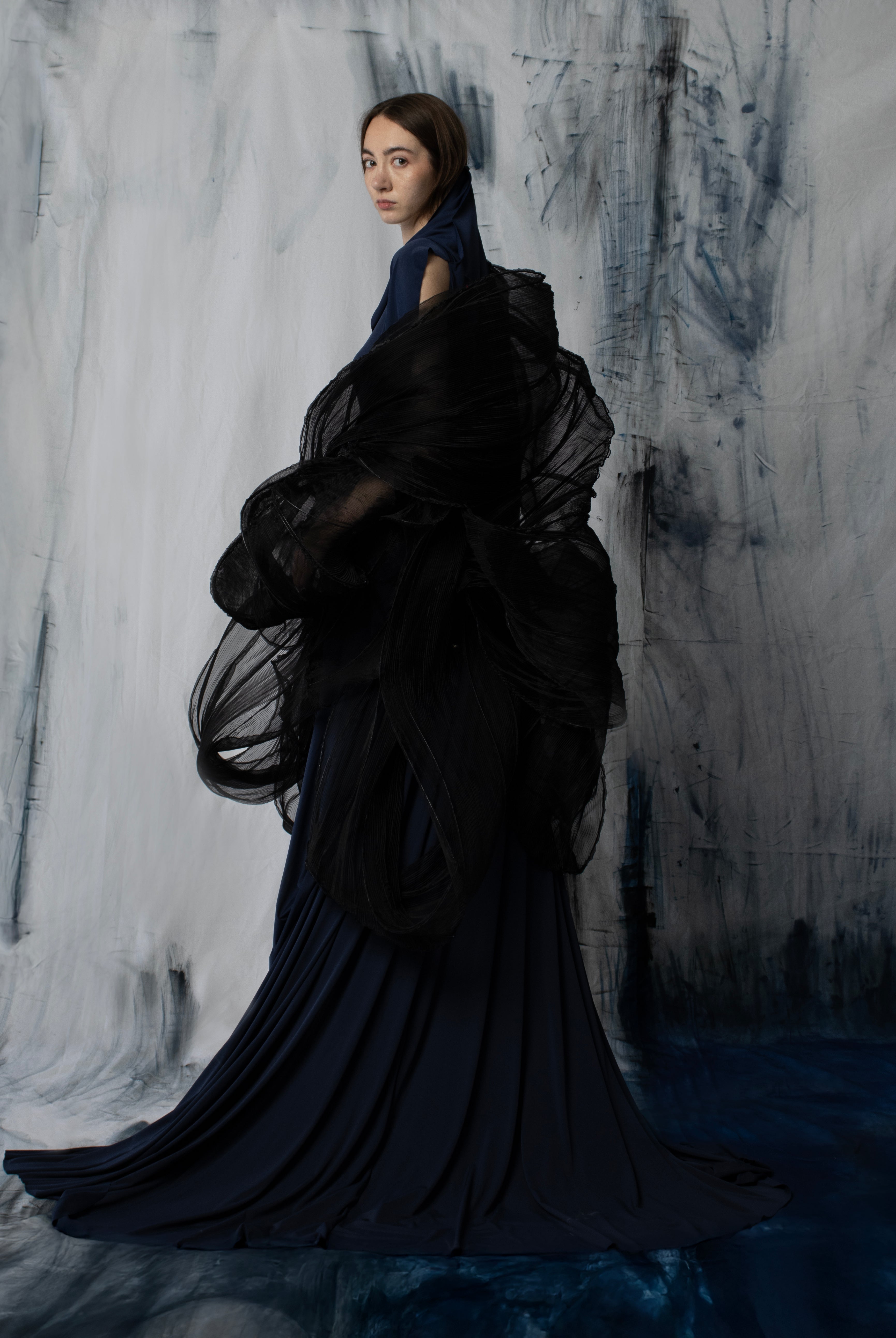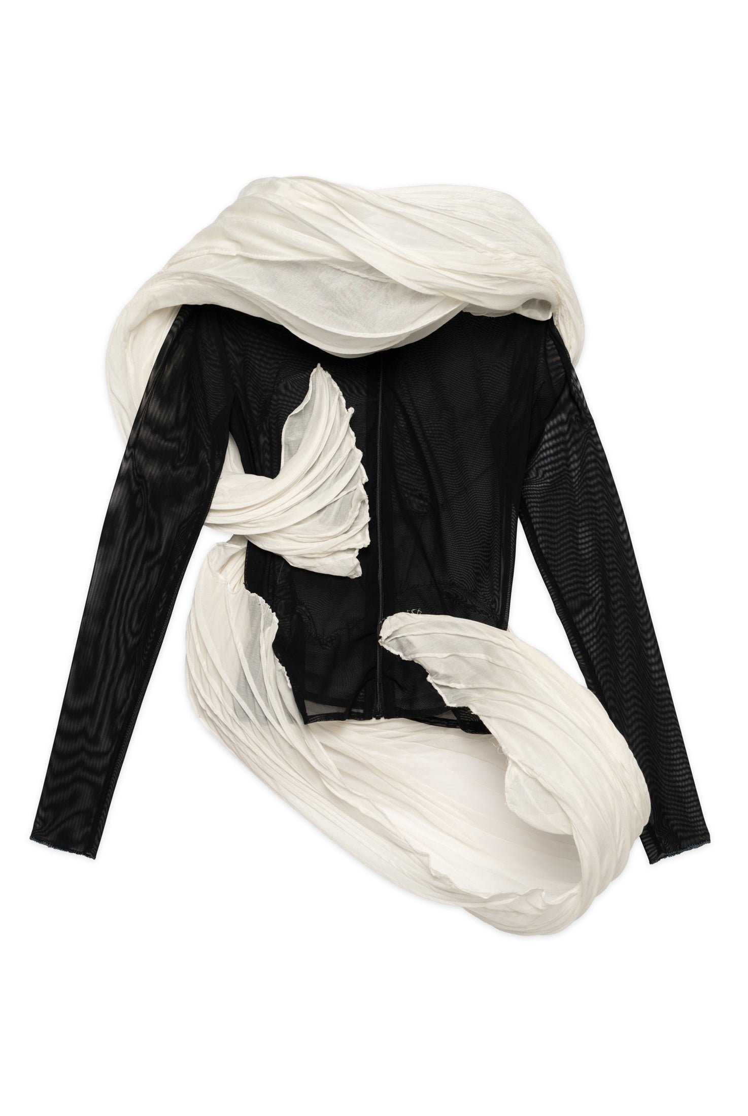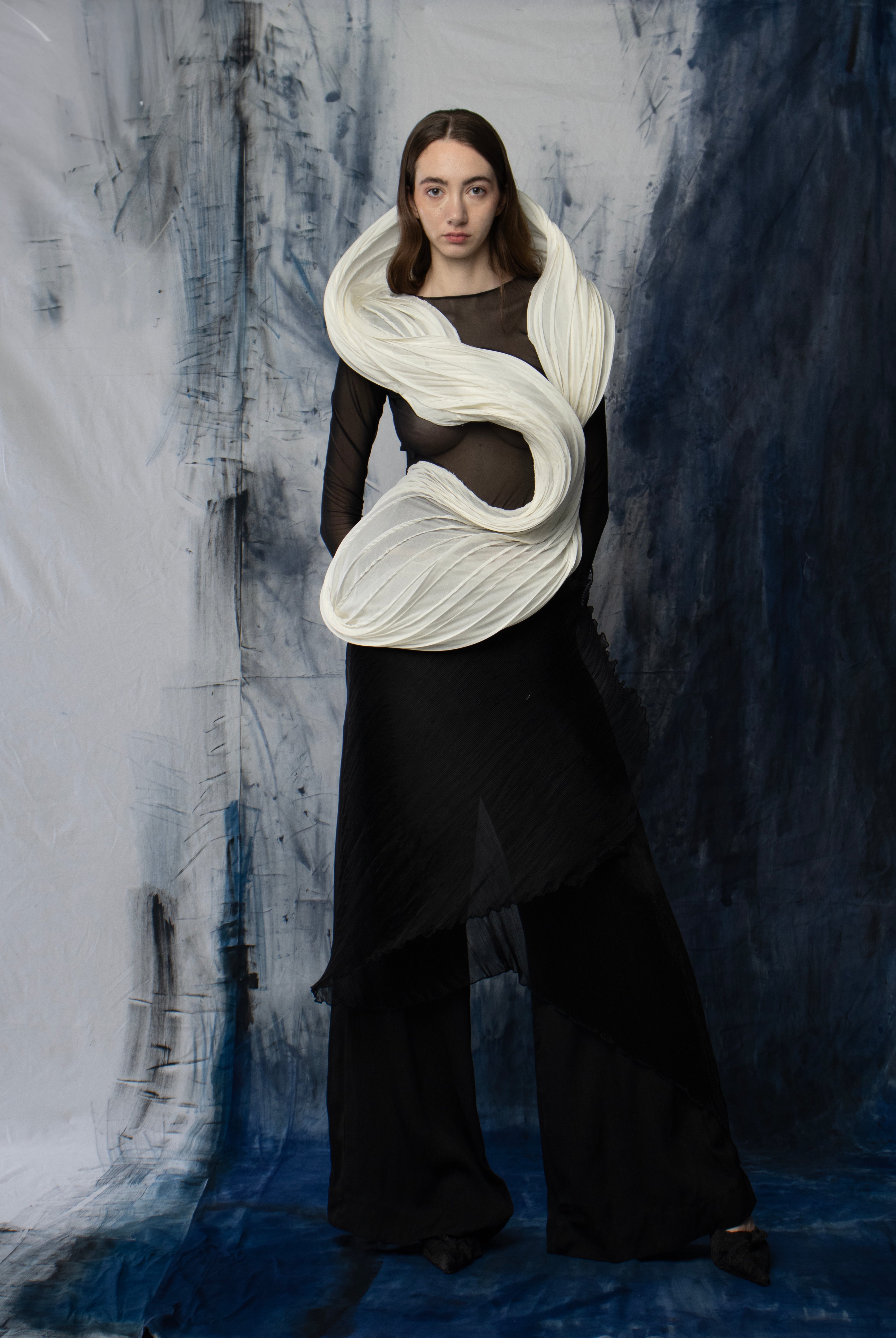A voluminous coat in pleated black organza, structured with internal boning and wire to create undulating, shell-like forms. The sheer polyester fabric floats around the body in waves, forming an exaggerated cocoon silhouette from all angles.
