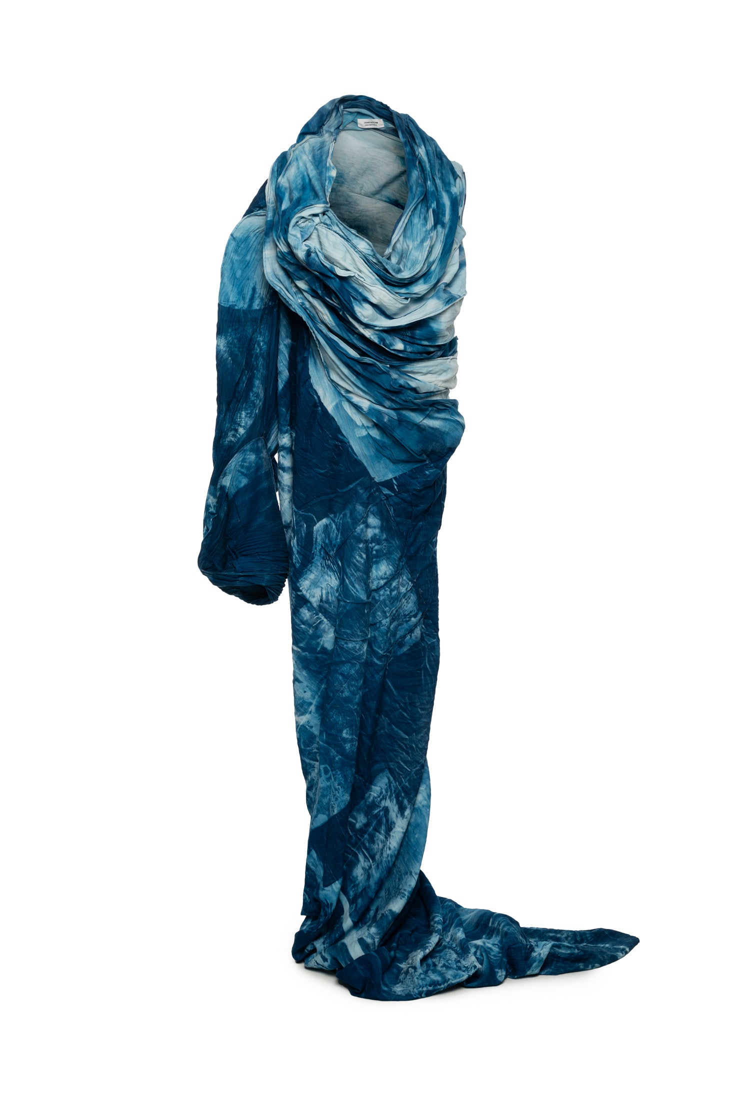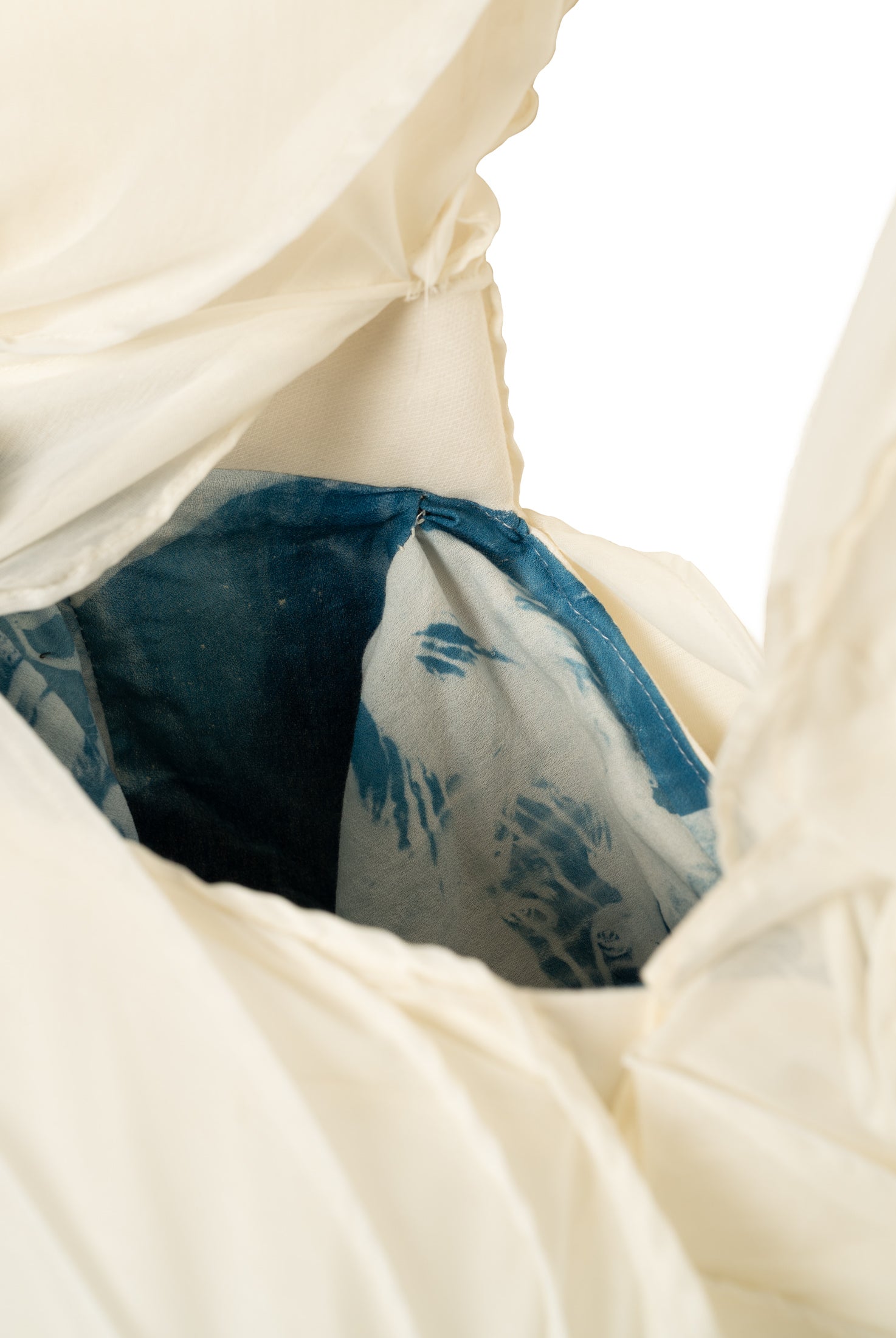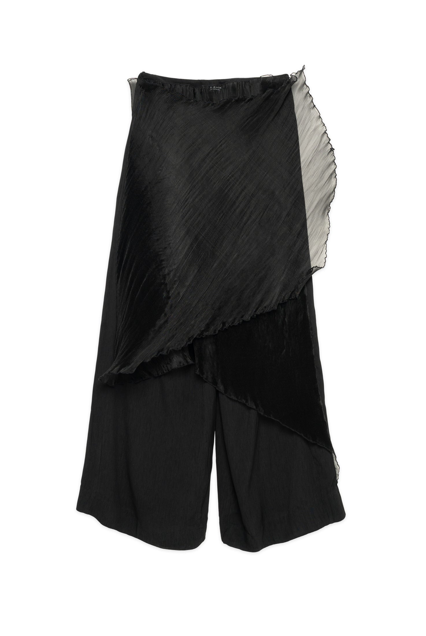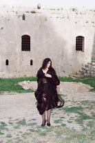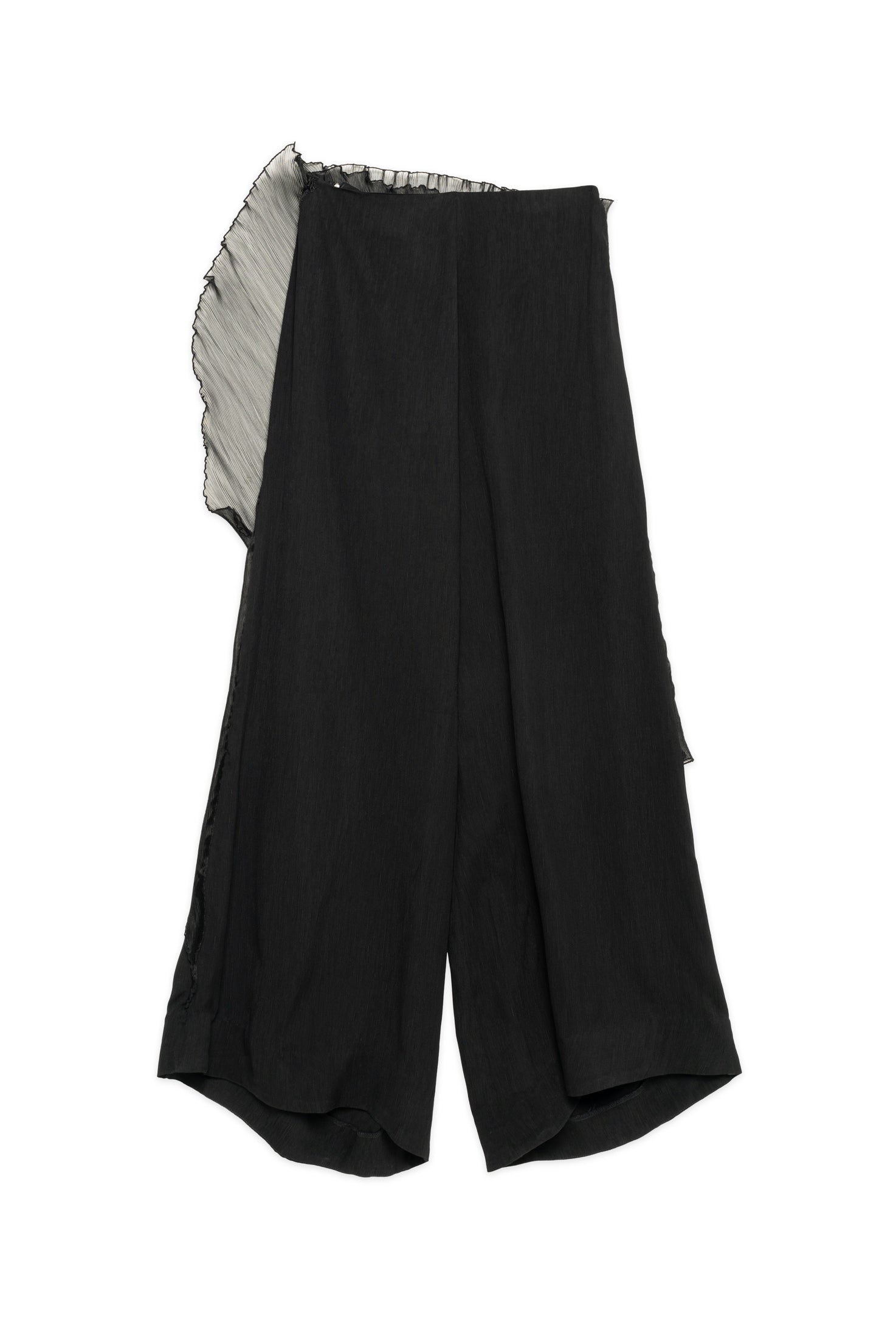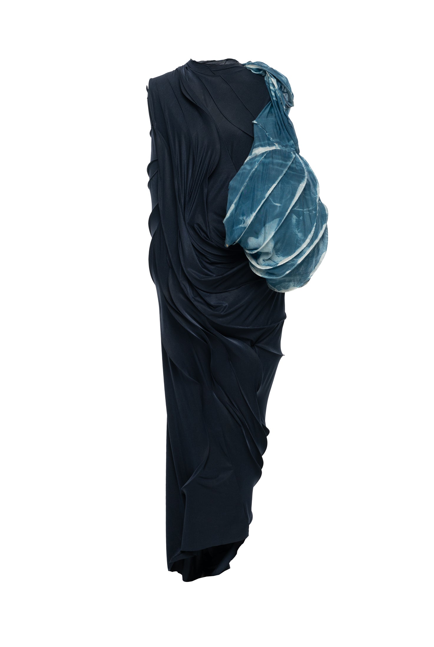 A voluminous coat in pleated black organza, structured with internal boning and wire to create undulating, shell-like forms. The sheer polyester fabric floats around the body in waves, forming an exaggerated cocoon silhouette from all angles.