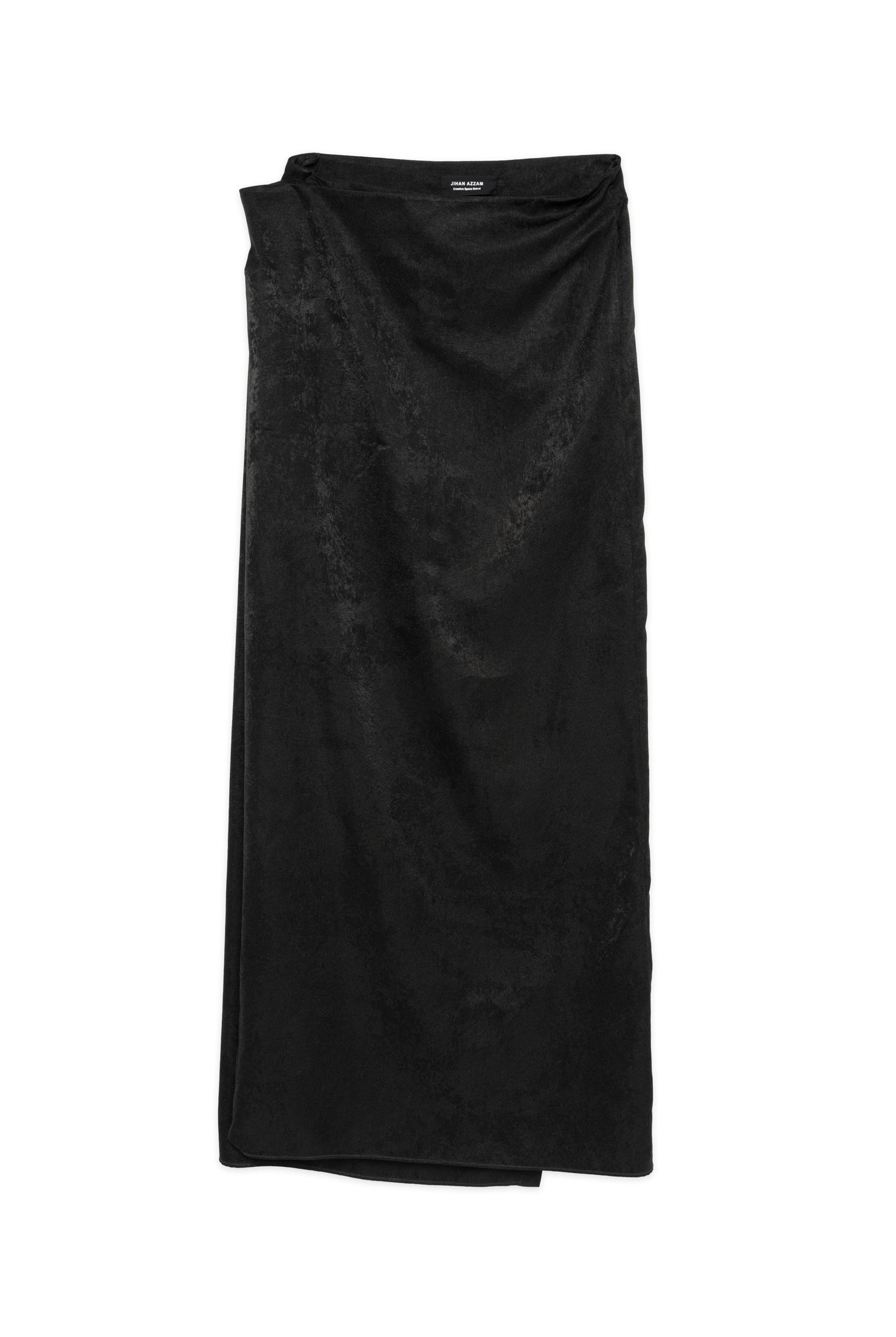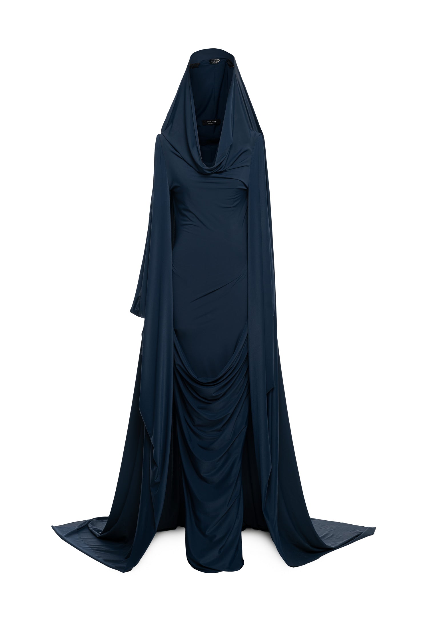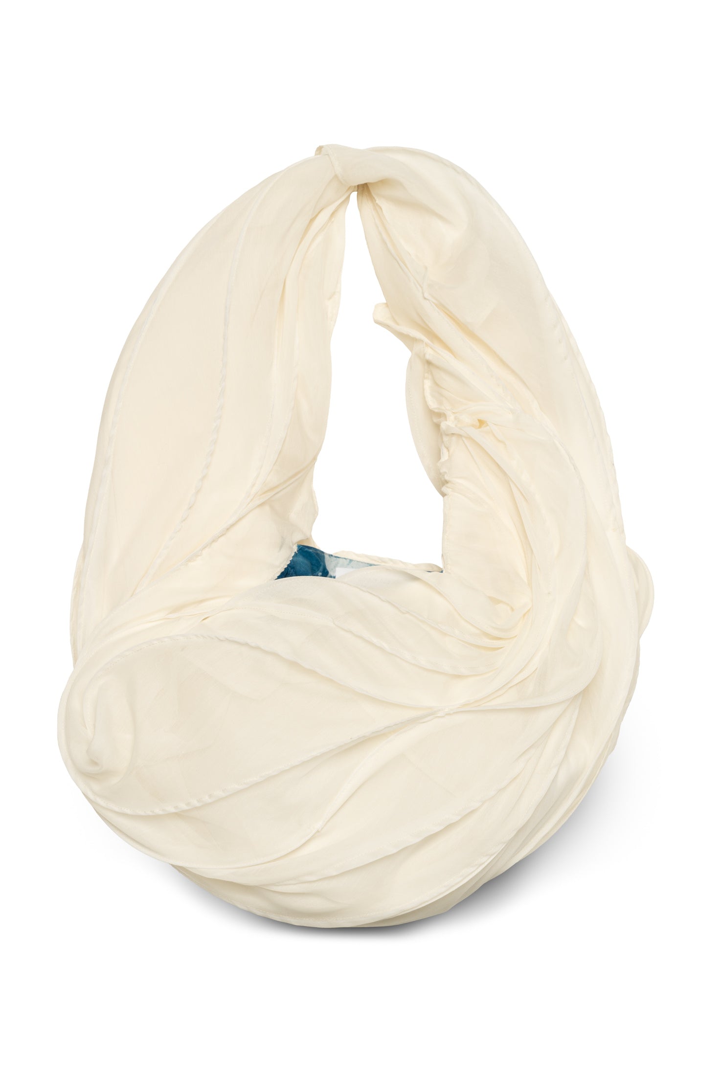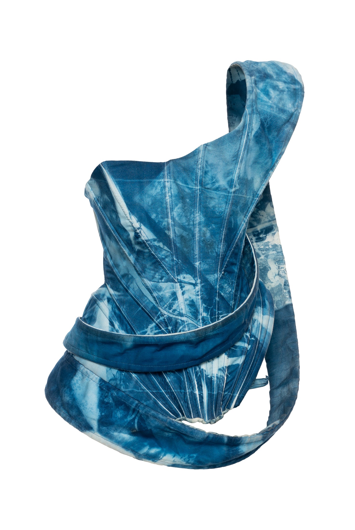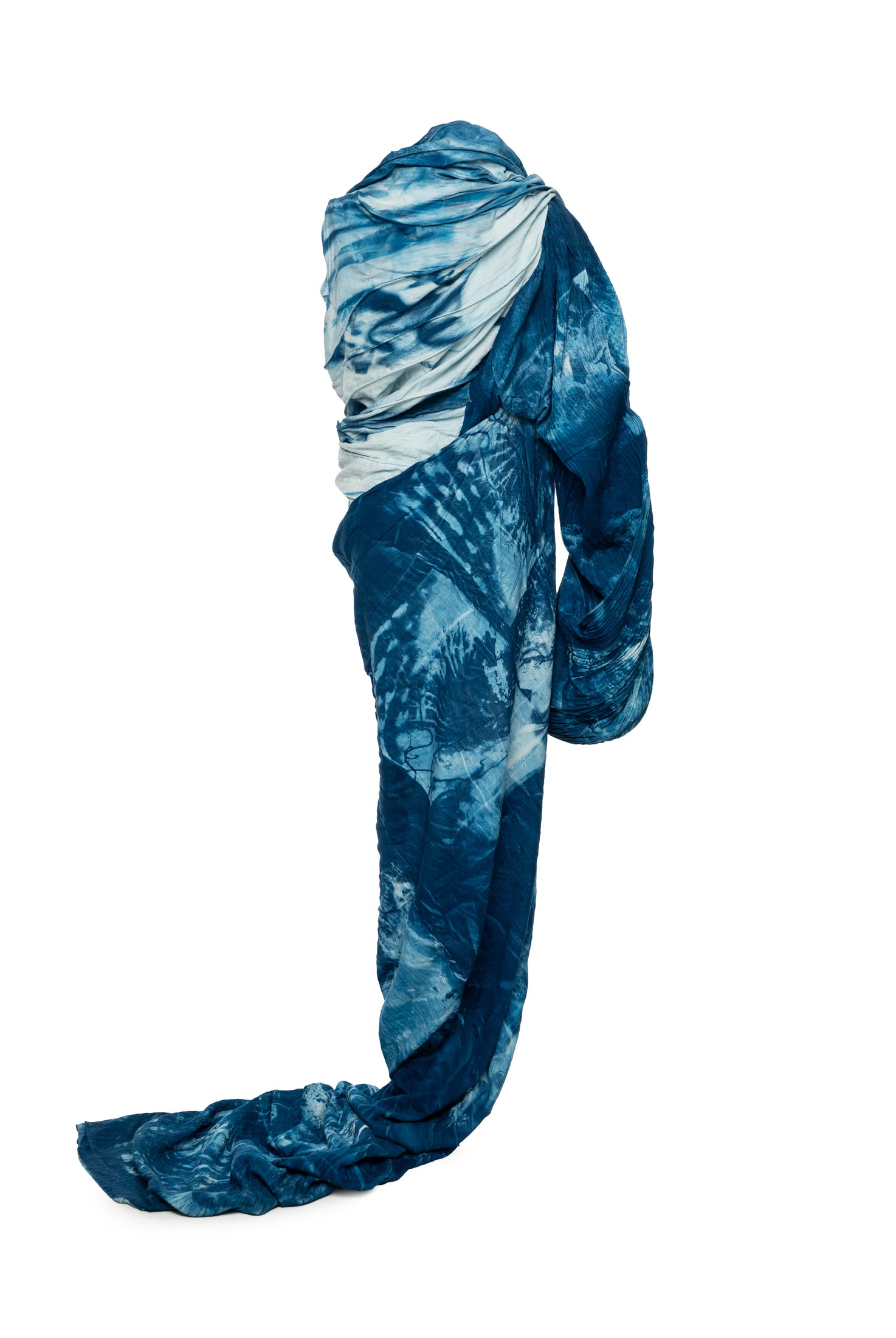 A voluminous coat in pleated black organza, structured with internal boning and wire to create undulating, shell-like forms. The sheer polyester fabric floats around the body in waves, forming an exaggerated cocoon silhouette from all angles.