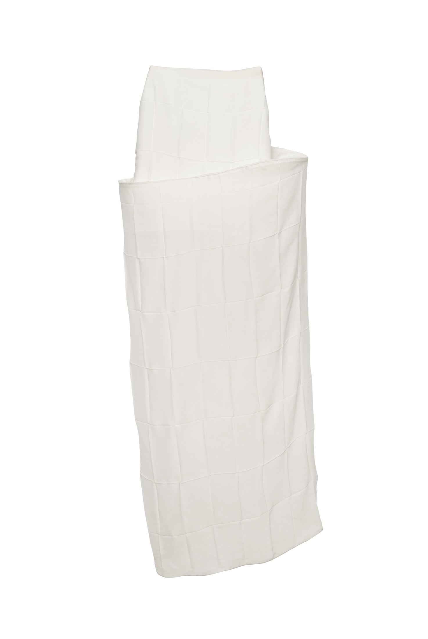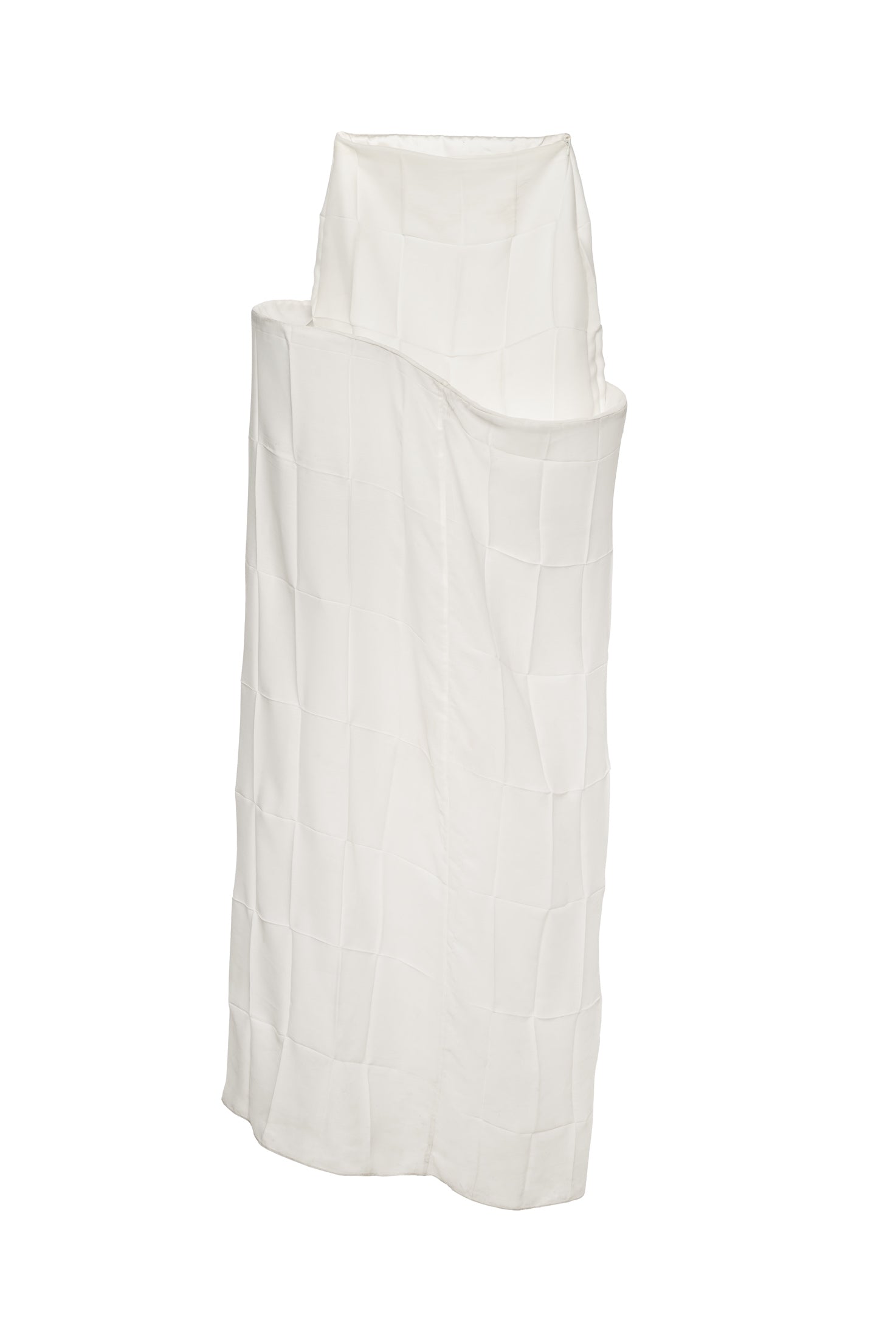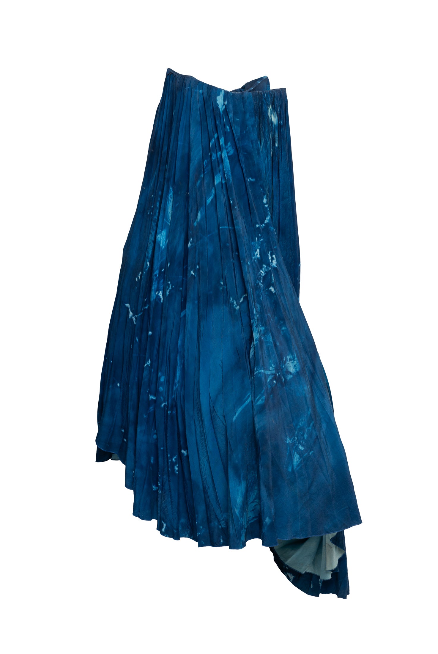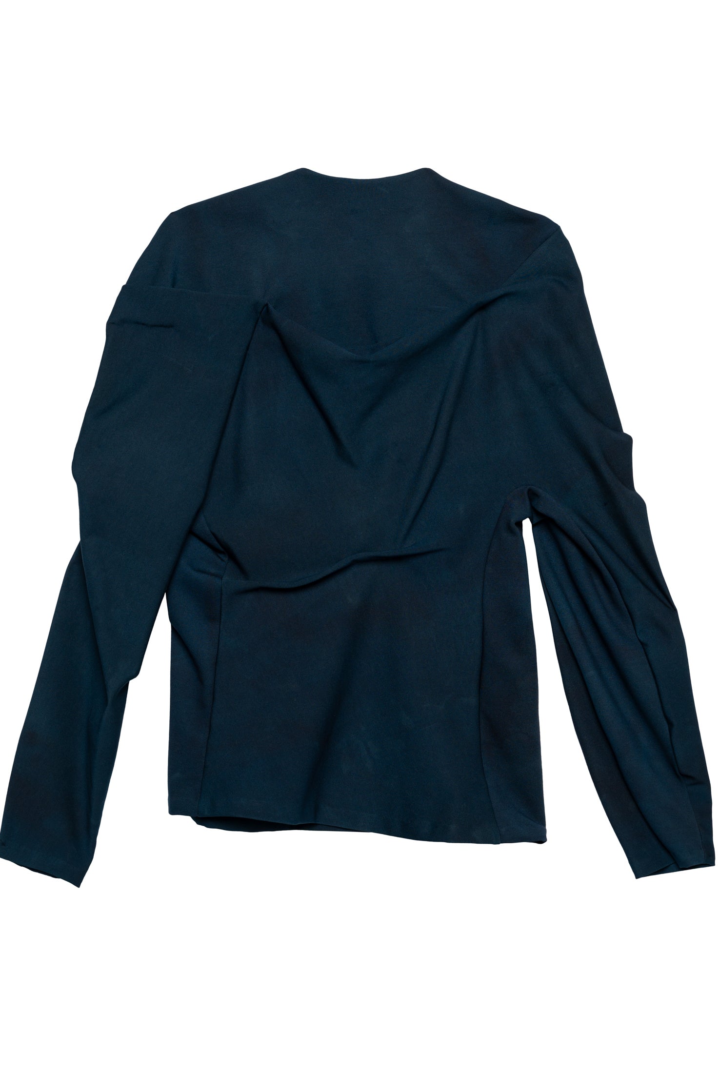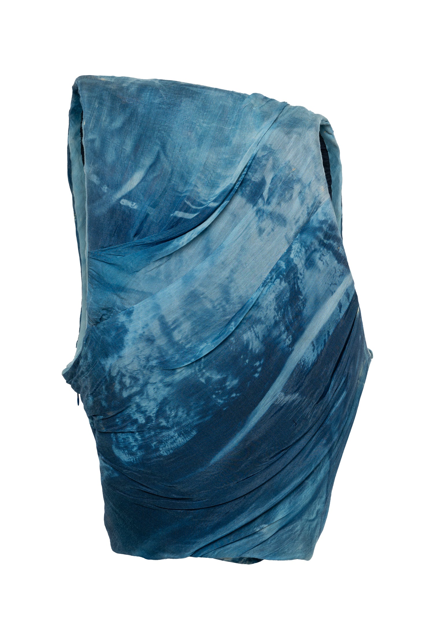 A voluminous coat in pleated black organza, structured with internal boning and wire to create undulating, shell-like forms. The sheer polyester fabric floats around the body in waves, forming an exaggerated cocoon silhouette from all angles.