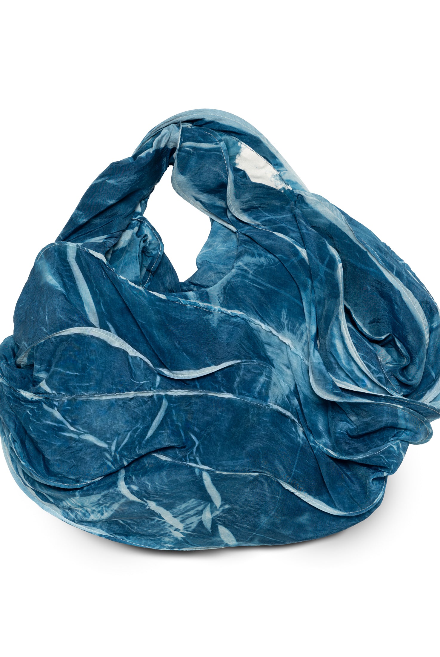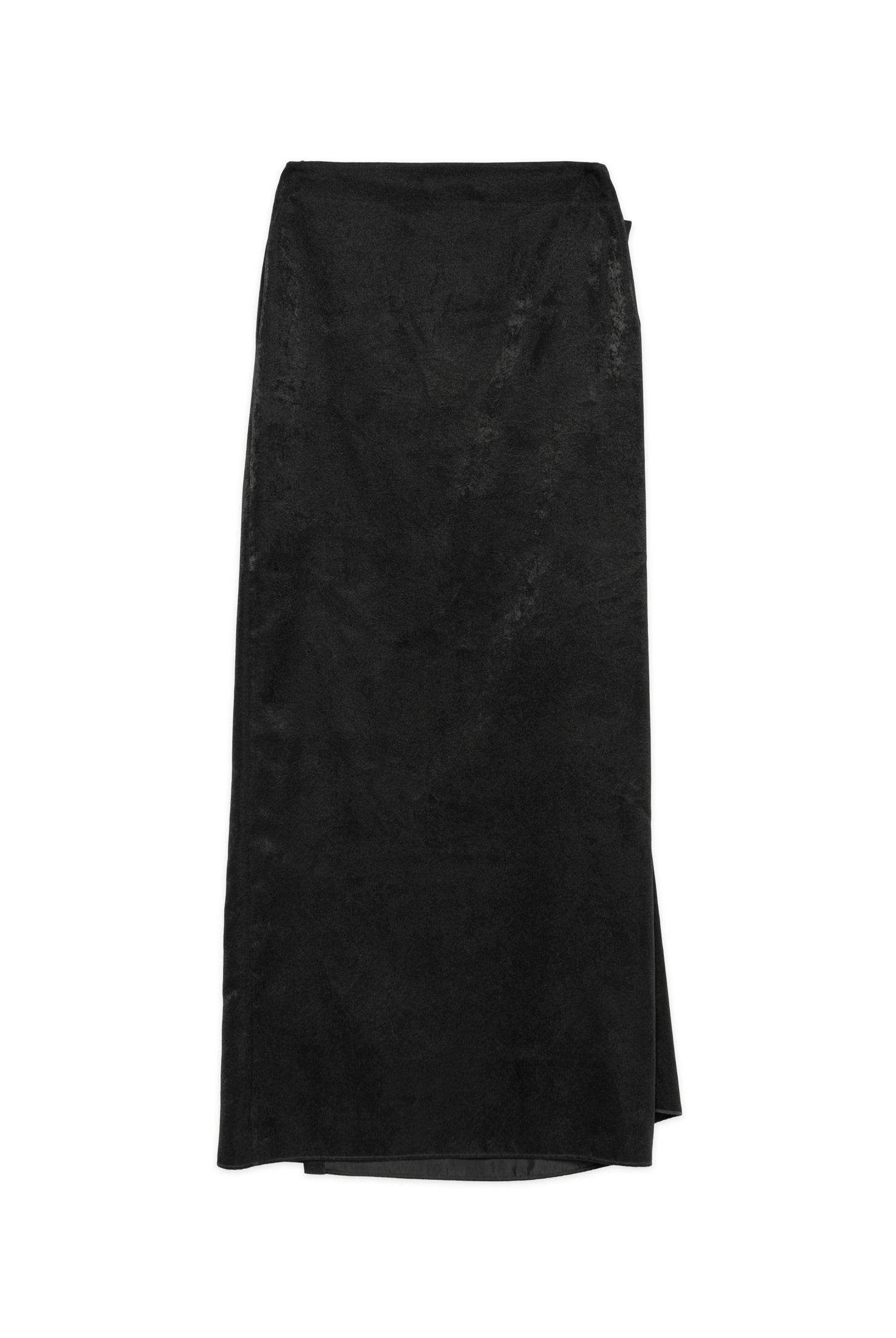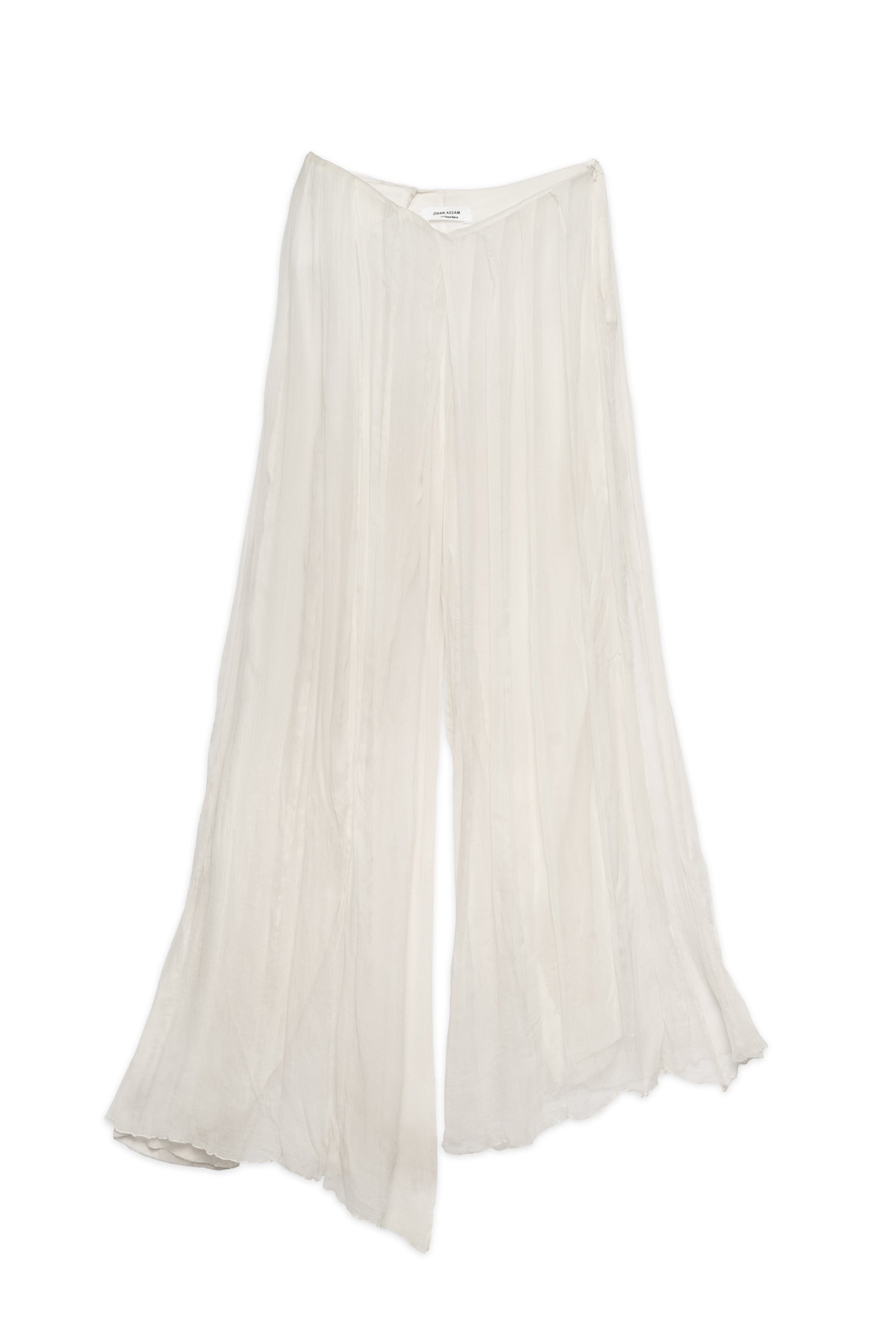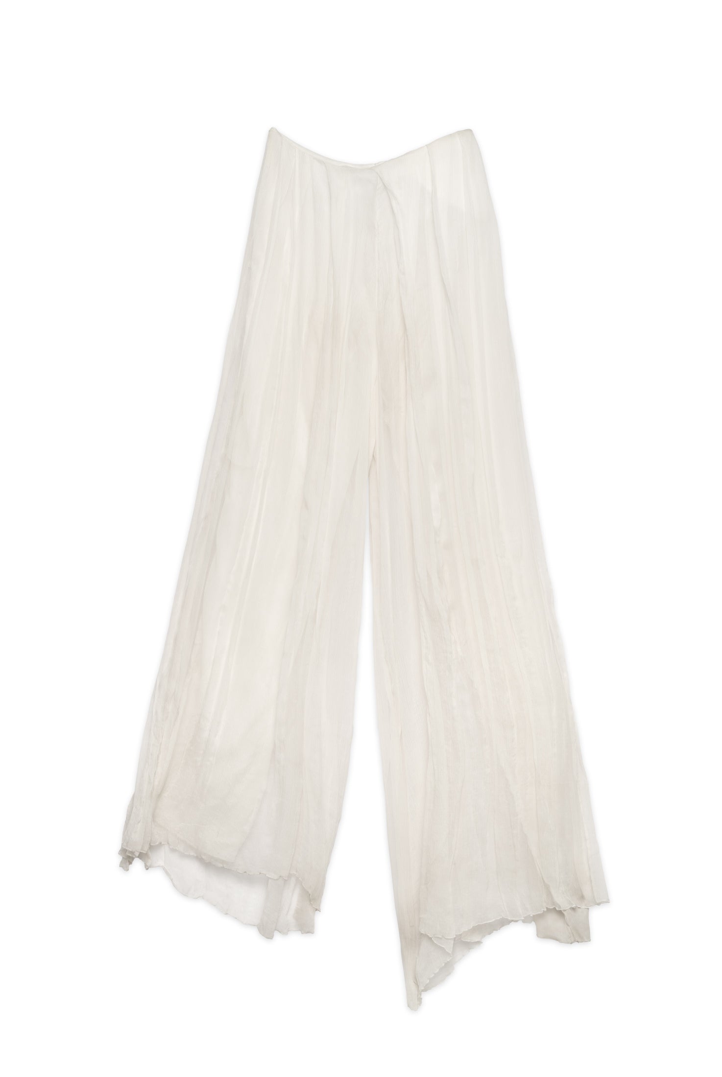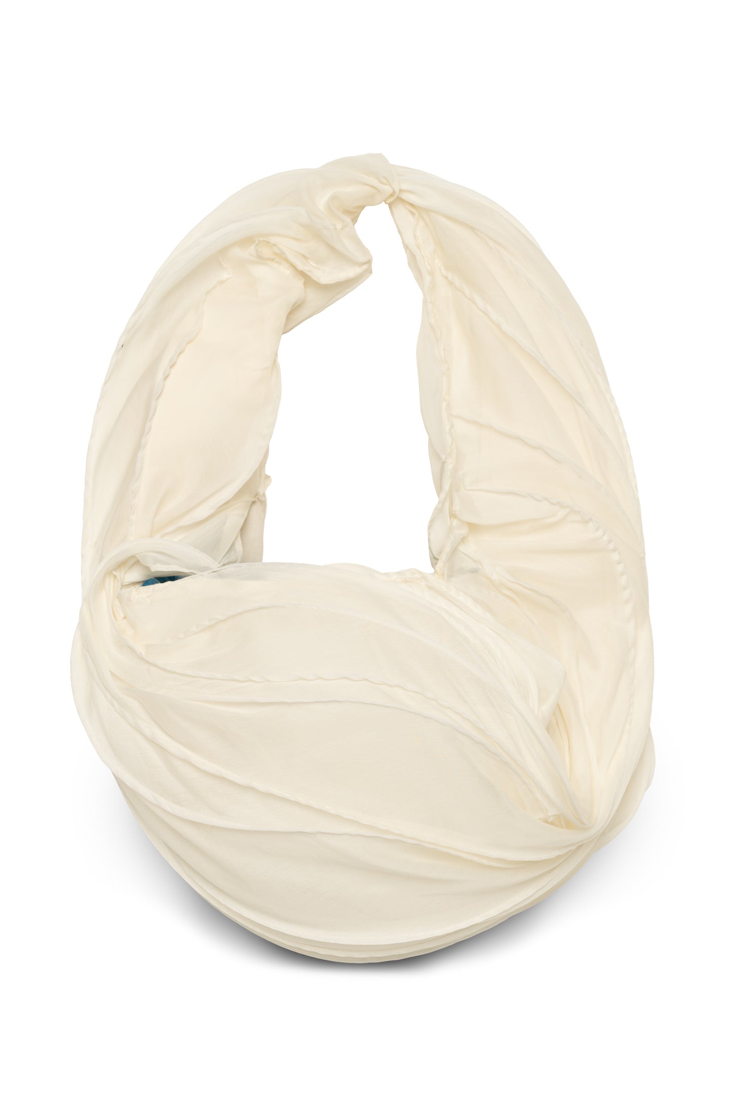 A voluminous coat in pleated black organza, structured with internal boning and wire to create undulating, shell-like forms. The sheer polyester fabric floats around the body in waves, forming an exaggerated cocoon silhouette from all angles.