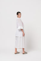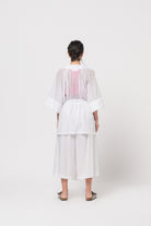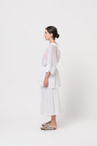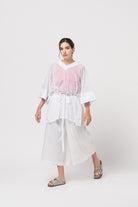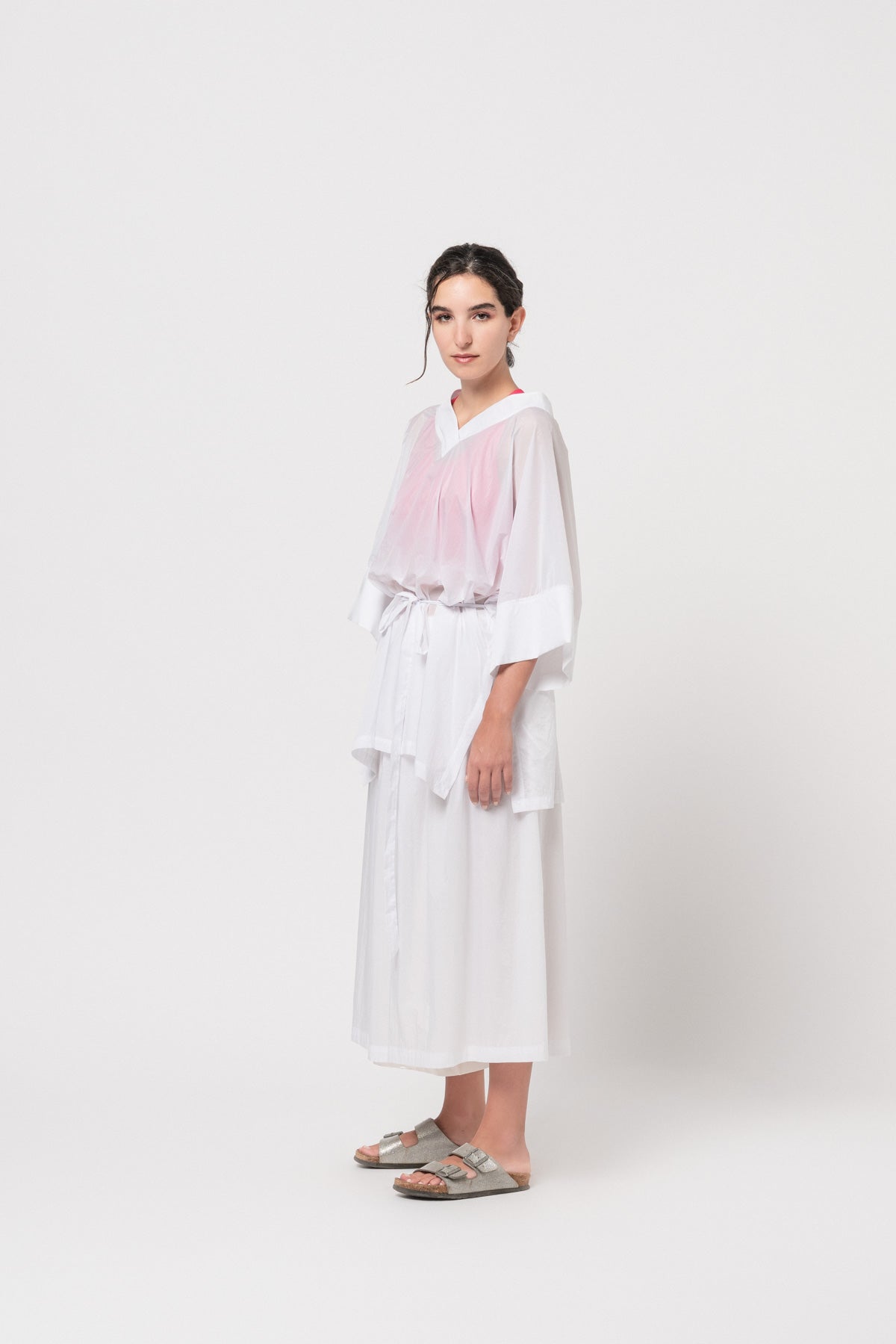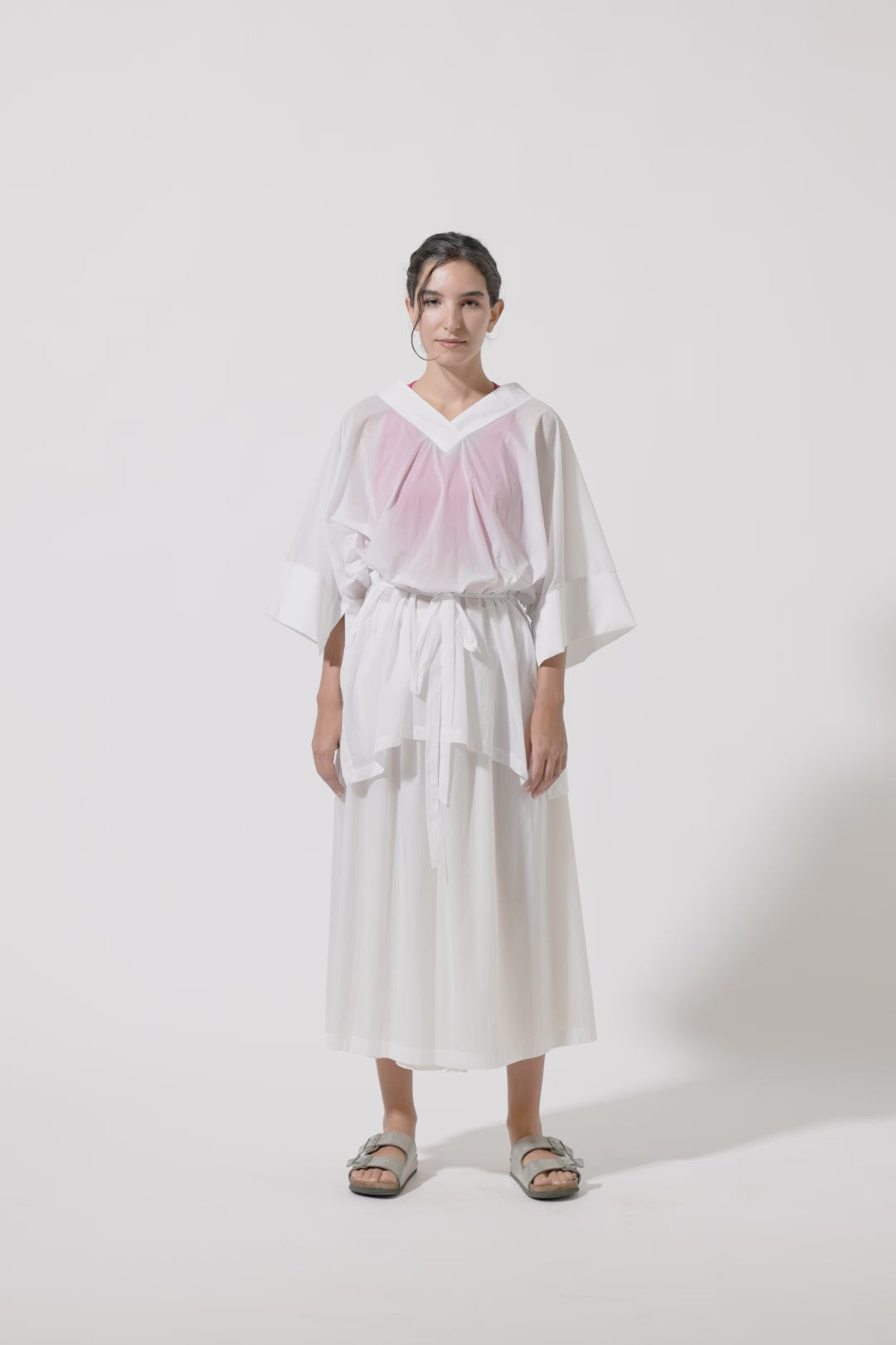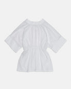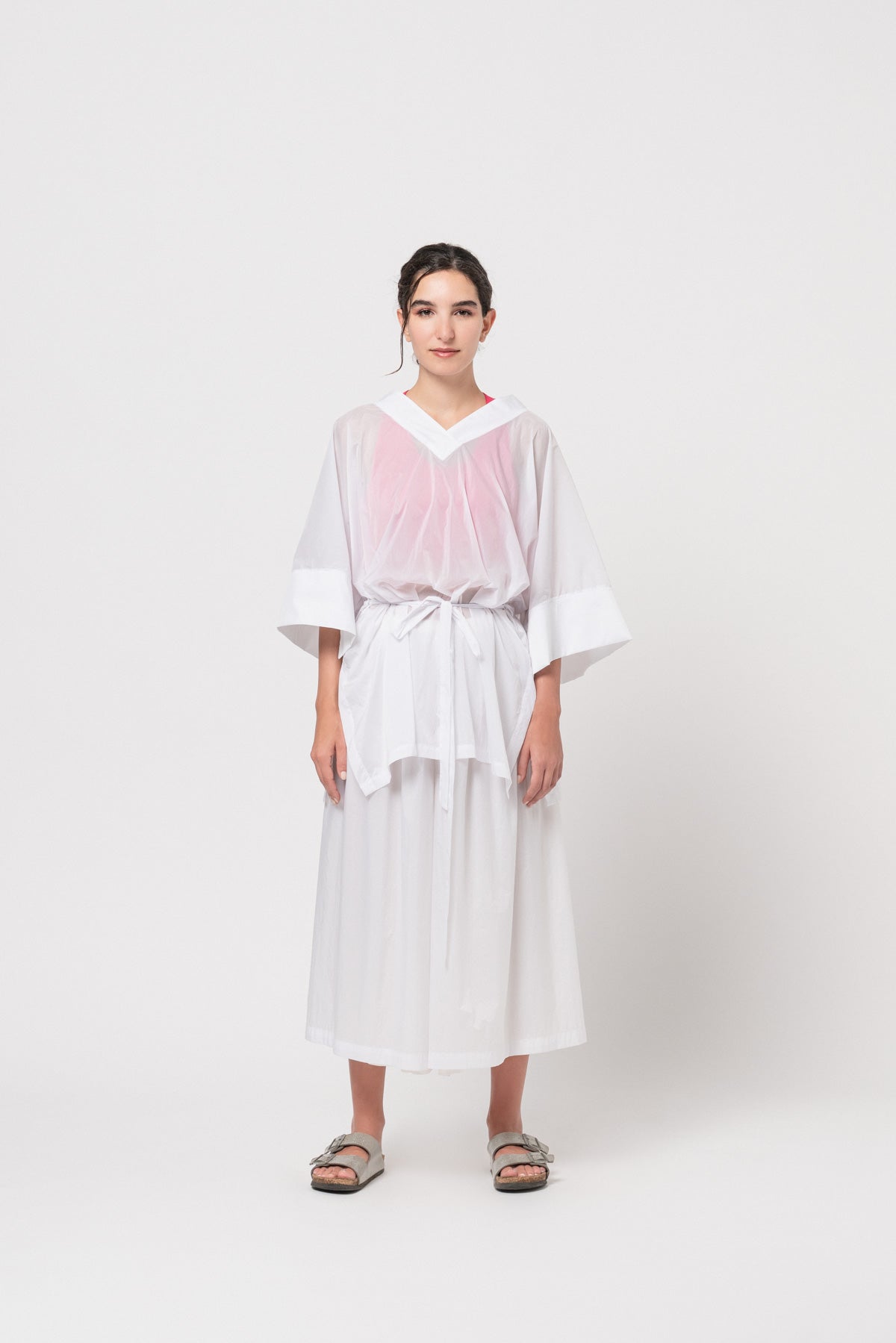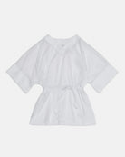 Lightweight v-neck top in white nylon with adjustable drawstring waistline.