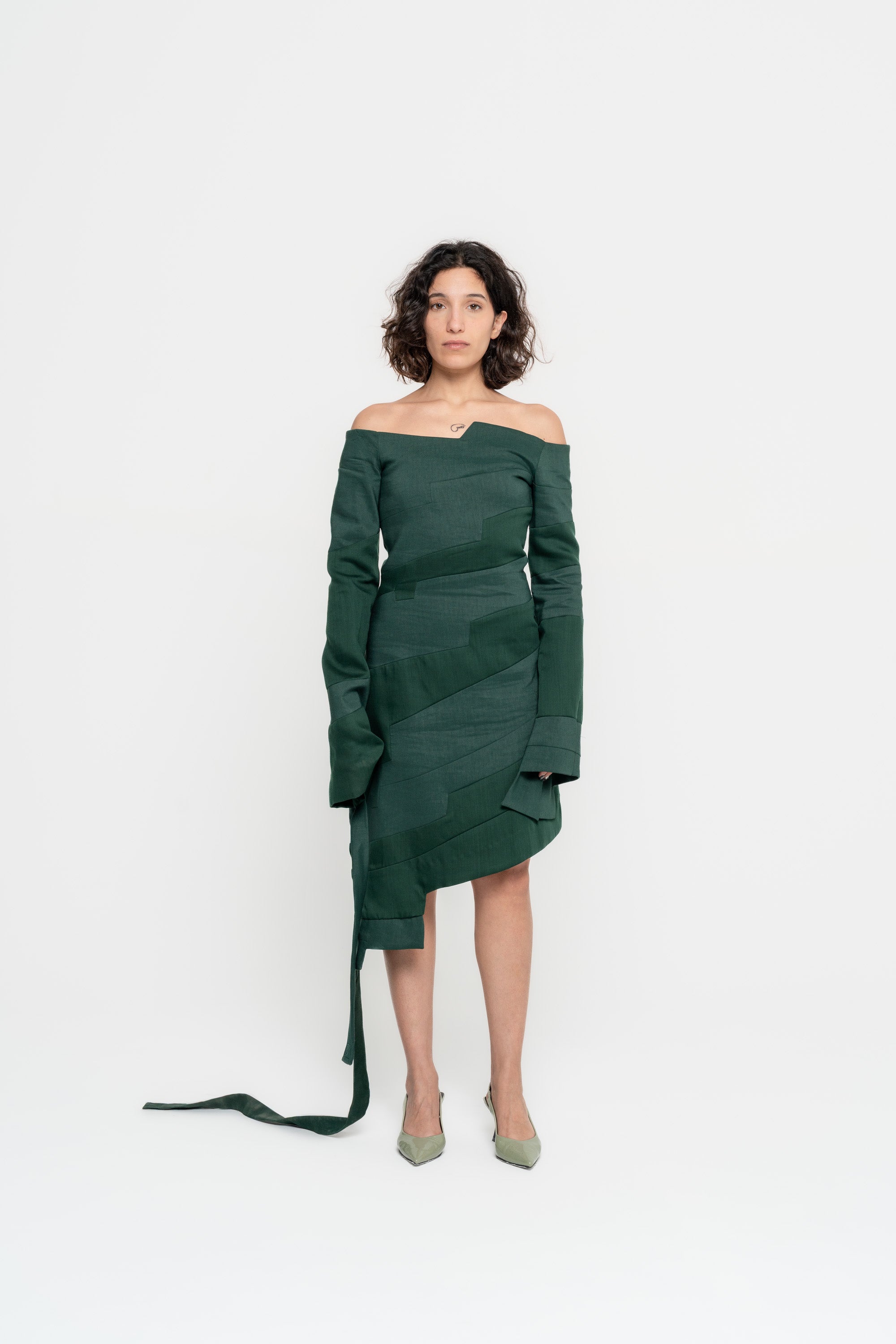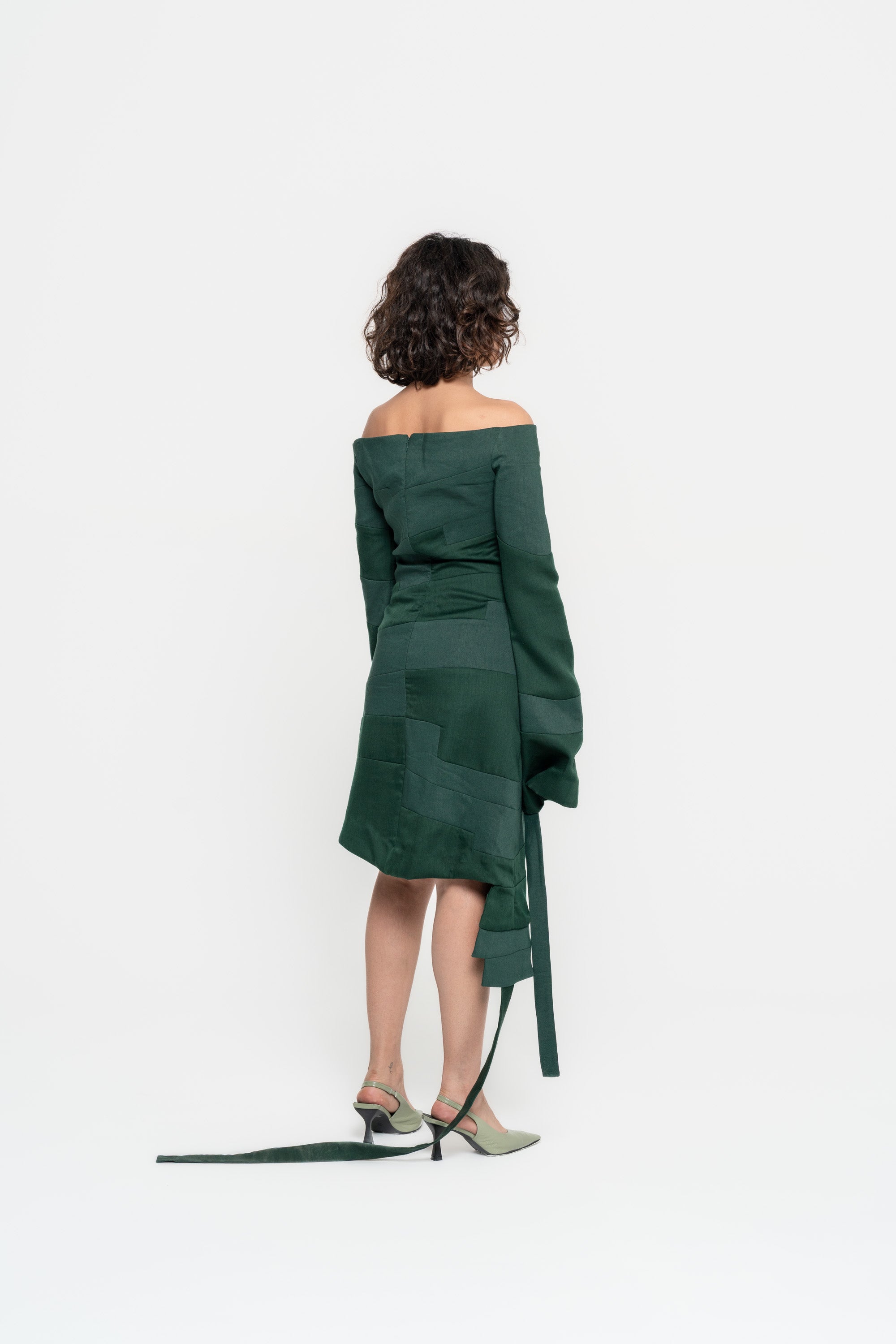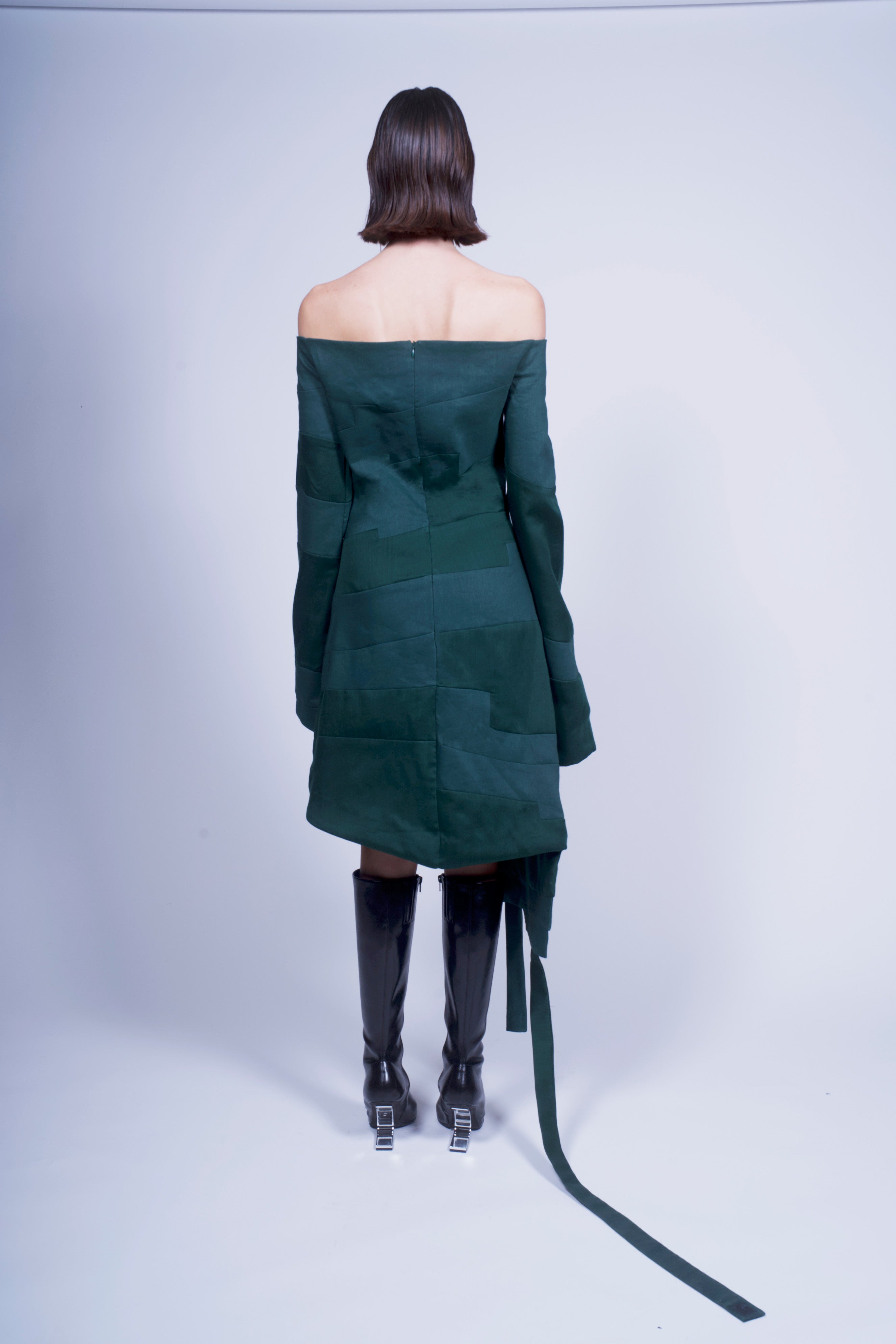 Off-shoulder two-tone midi dress featuring asymmetrical puzzled cuts with strap on right sleeve and right hem.