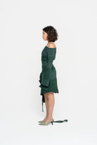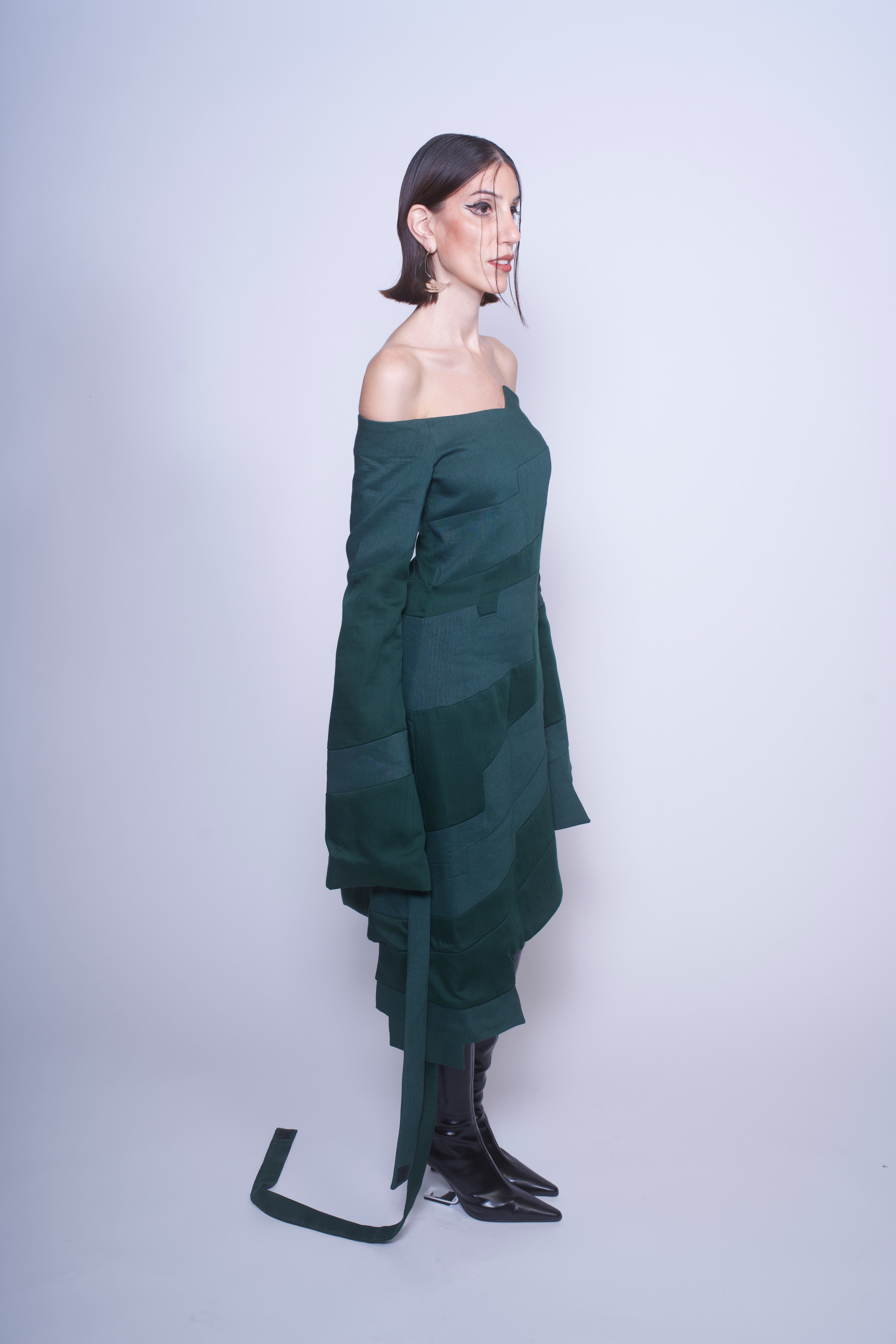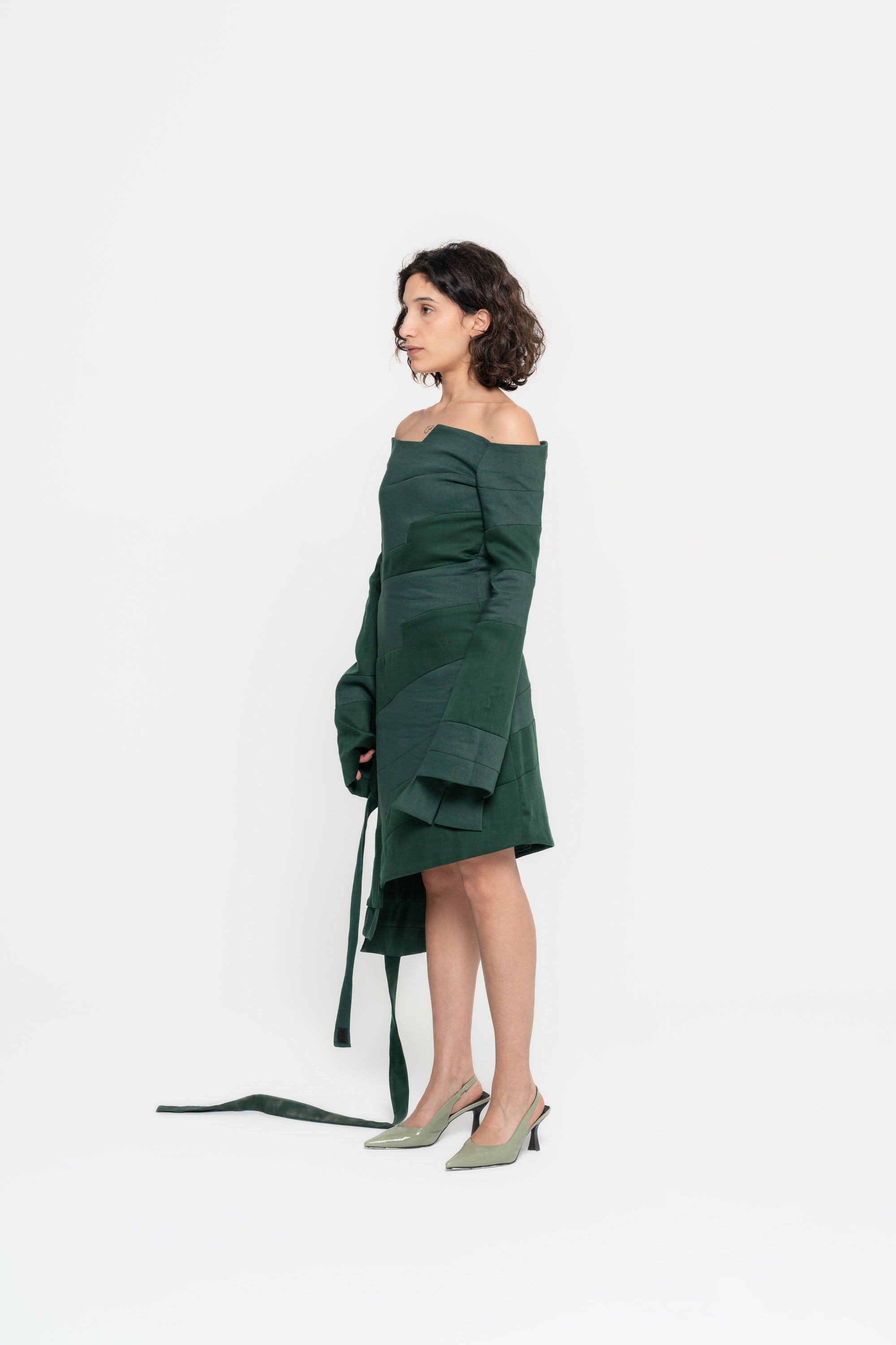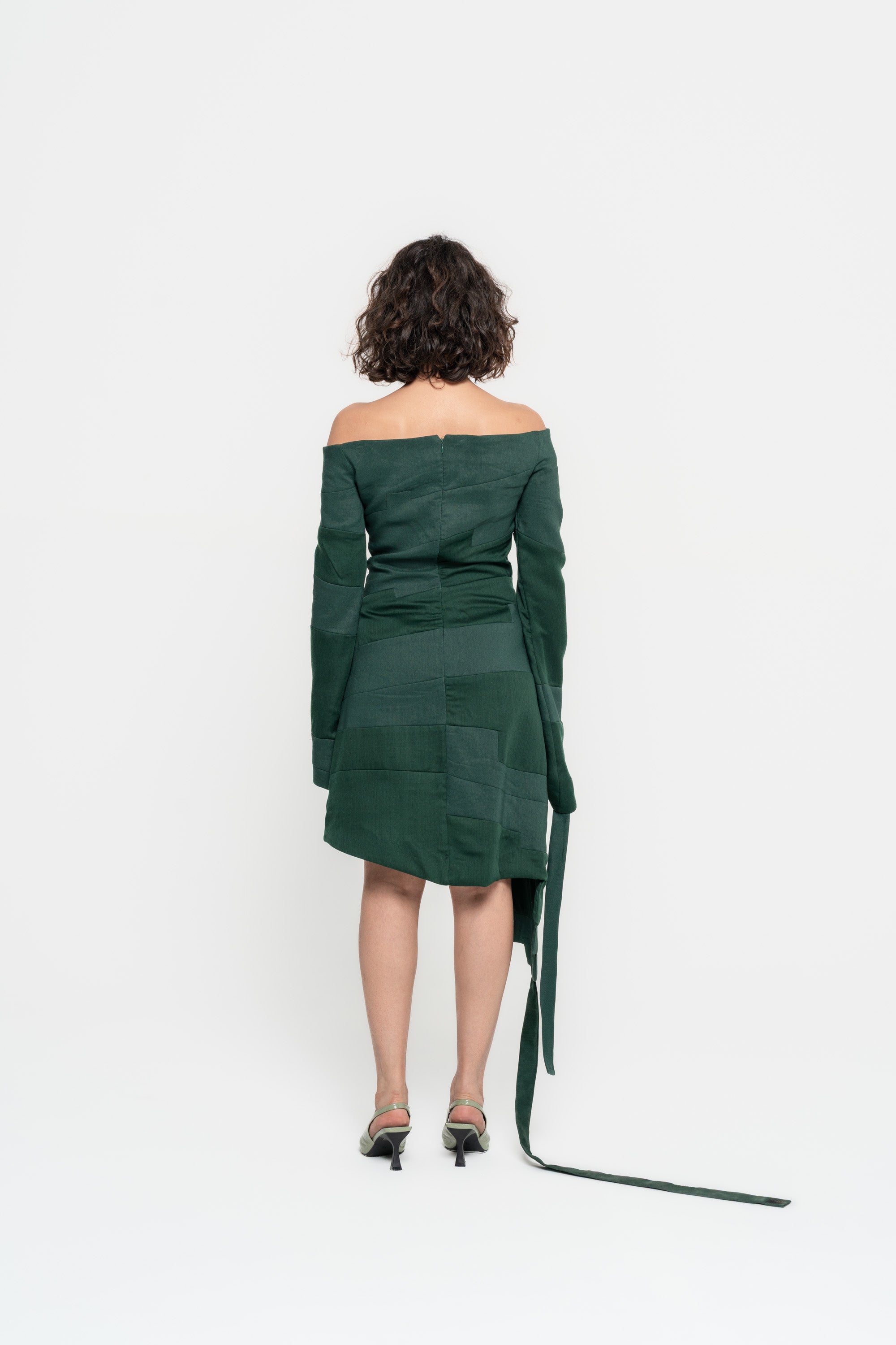 Off-shoulder two-tone midi dress featuring asymmetrical puzzled cuts with strap on right sleeve and right hem.