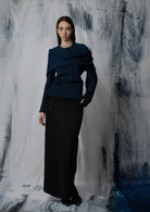 Long black skirt in a structured cotton-silk blend. The minimalist piece wraps around the waist in double layers fastened by hidden buttons. Featuring a front slit and inseam pockets.
