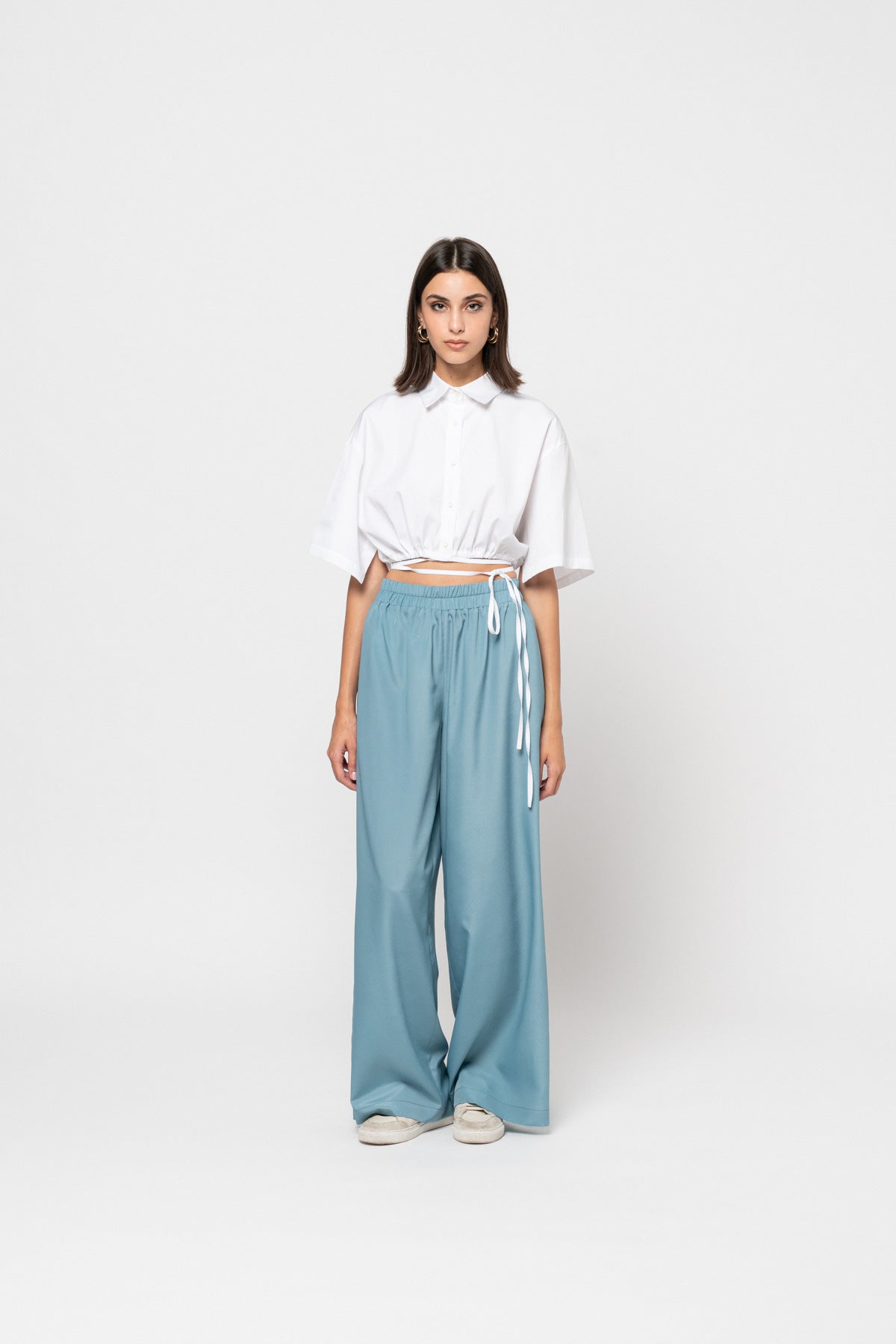 Flowy, ankle-length, semi-wide pants in pastel blue. Featuring an elastic waistband and two slash pockets.