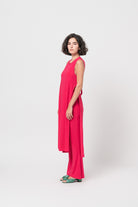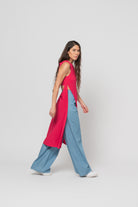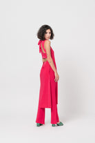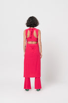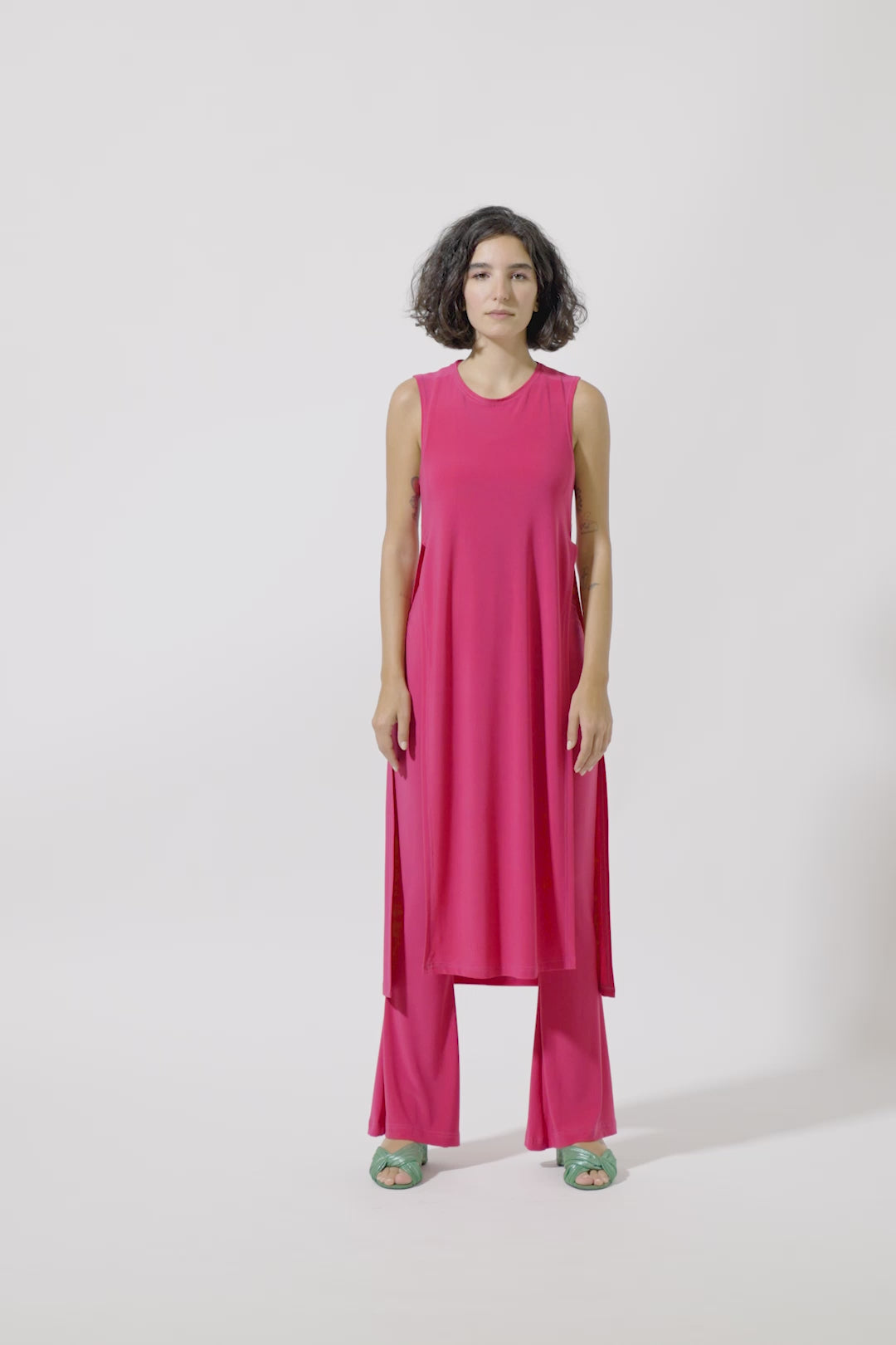 Long, sleeveless top in bright fuscia jersey. Features slit sides and an open back.