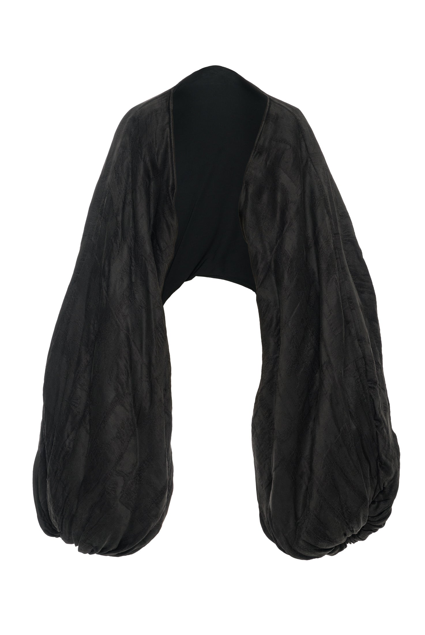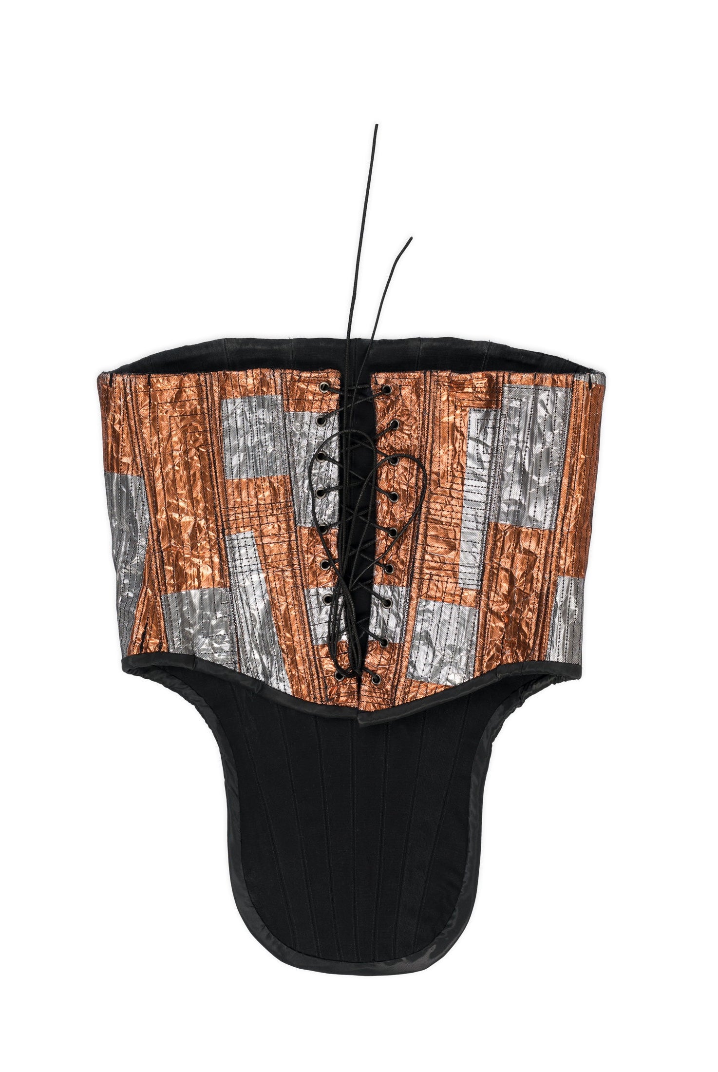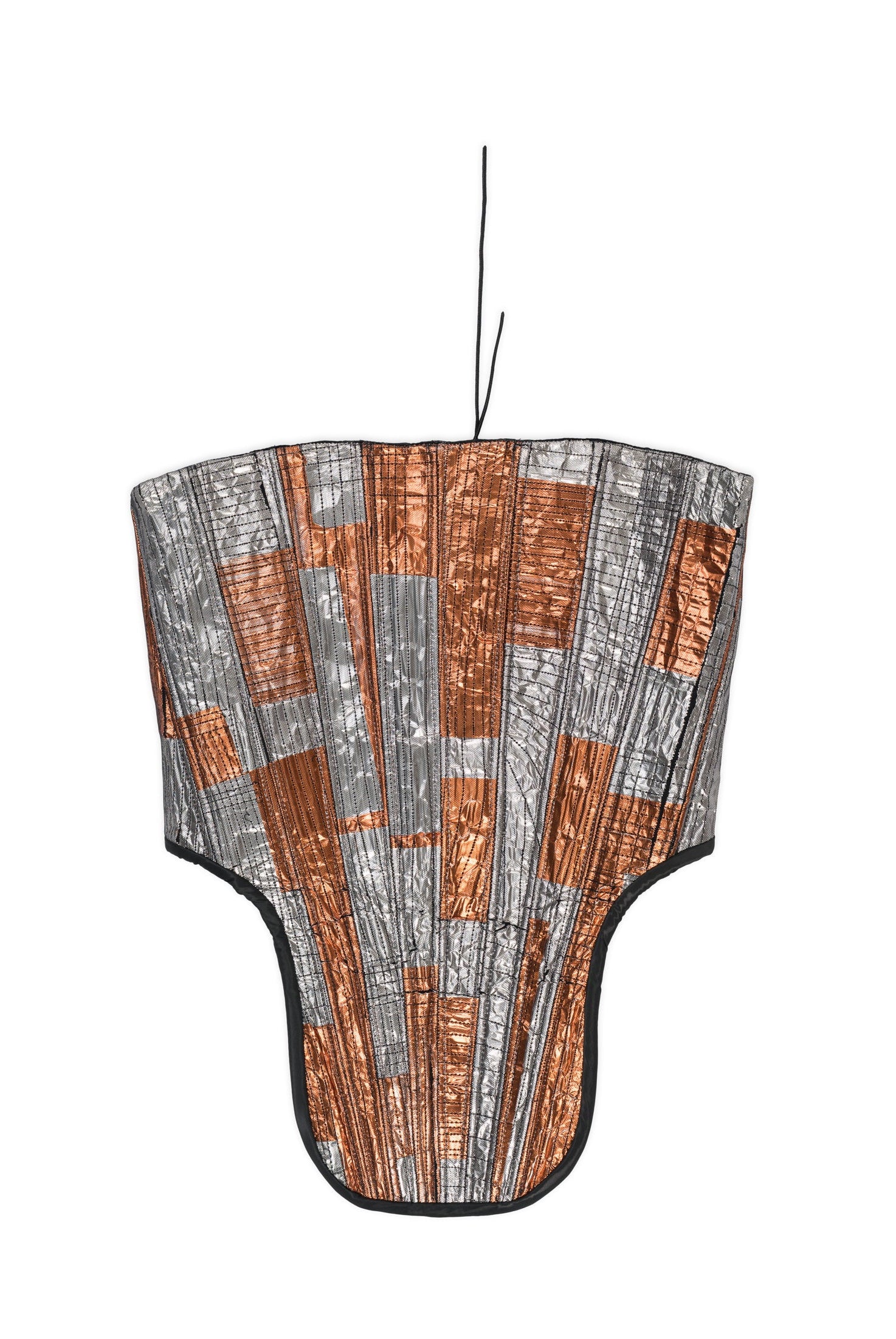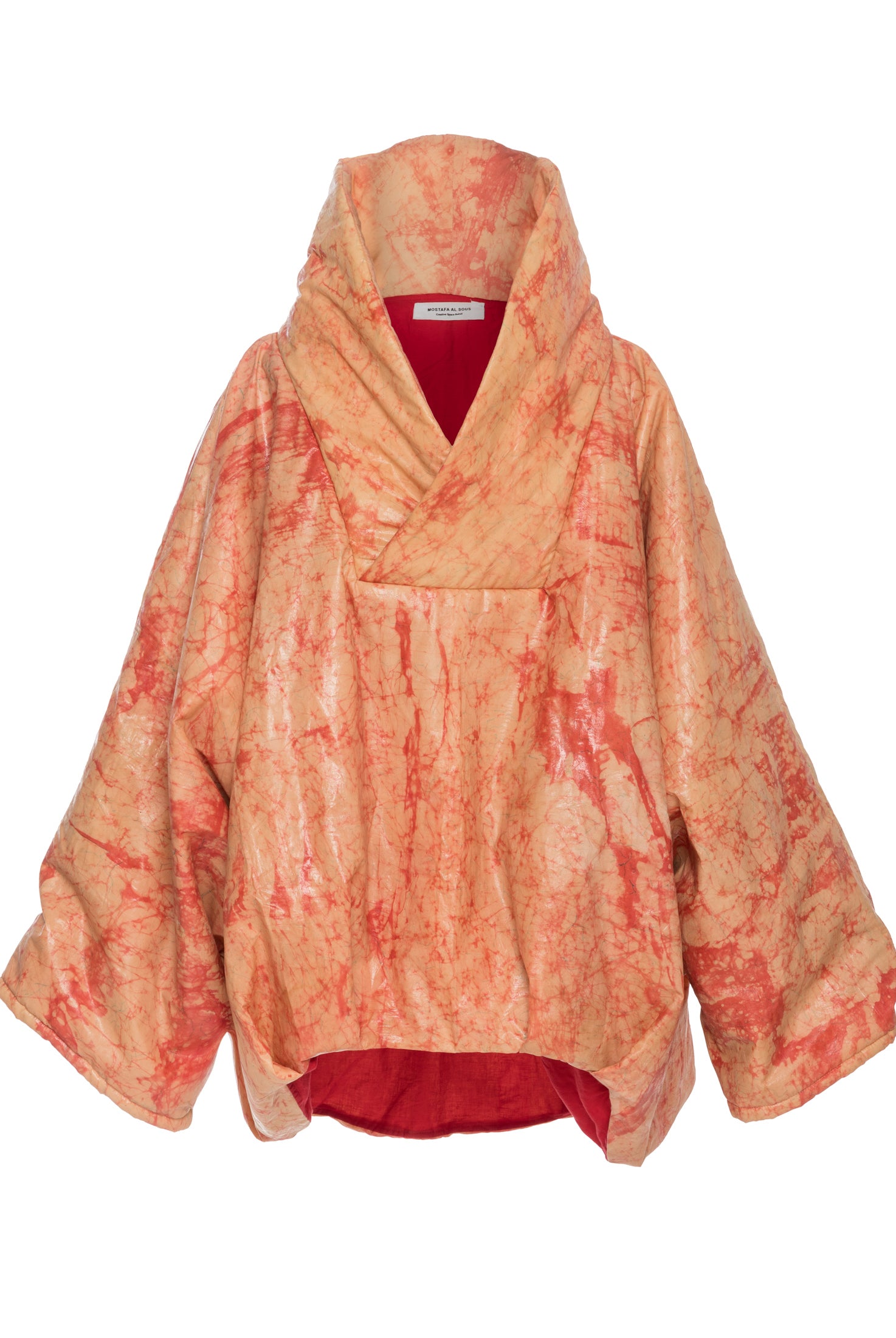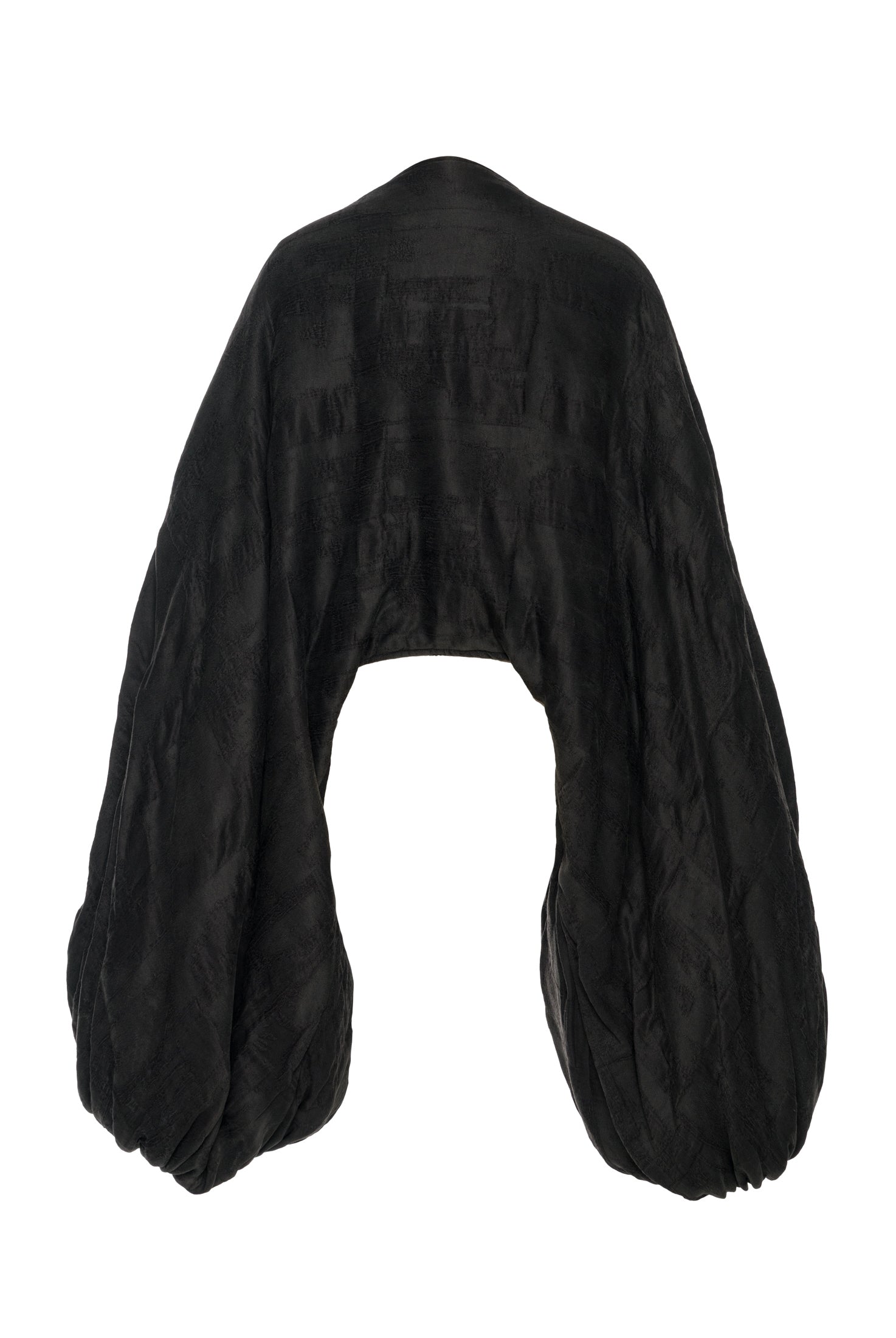 A convertible piece that can be worn as a jacket or displayed as an artwork. Made of crepe, silicone, and a patchwork of leftover fabrics.