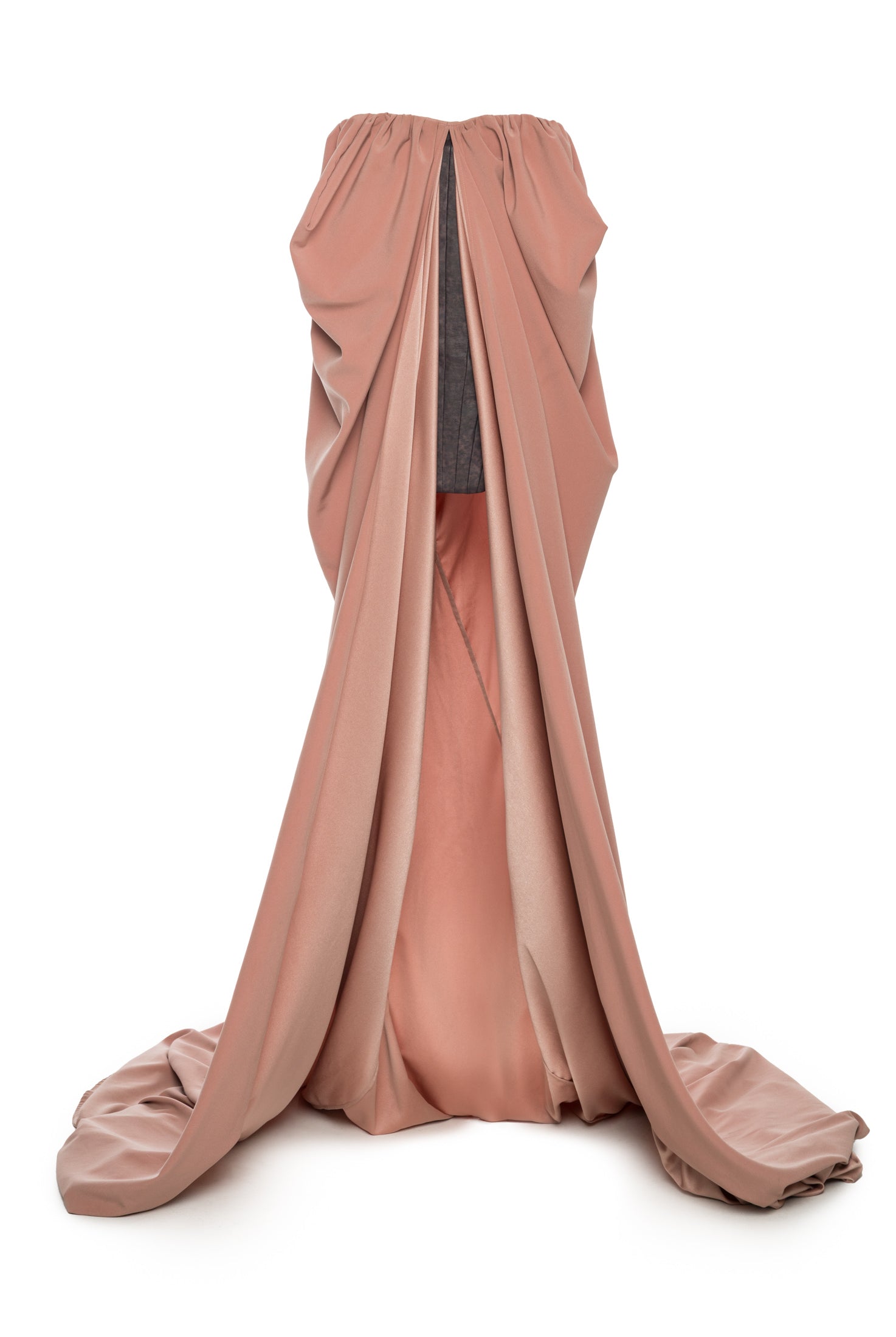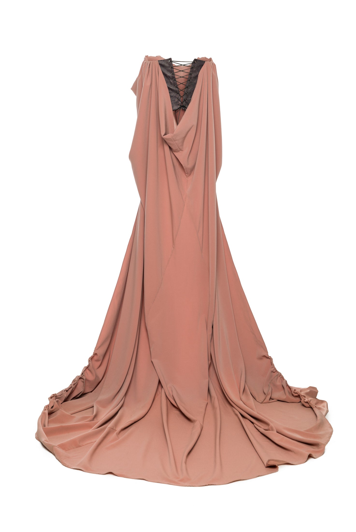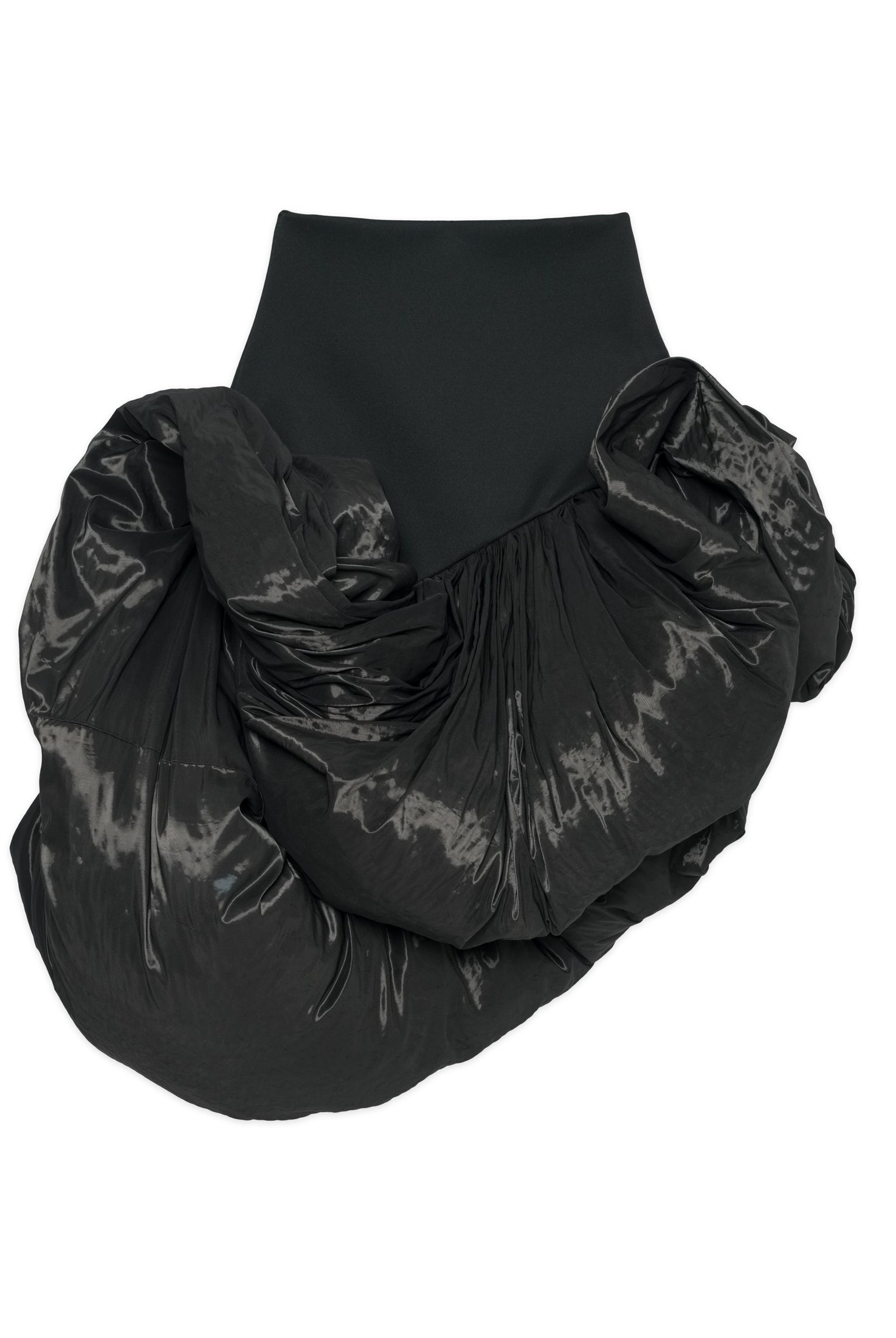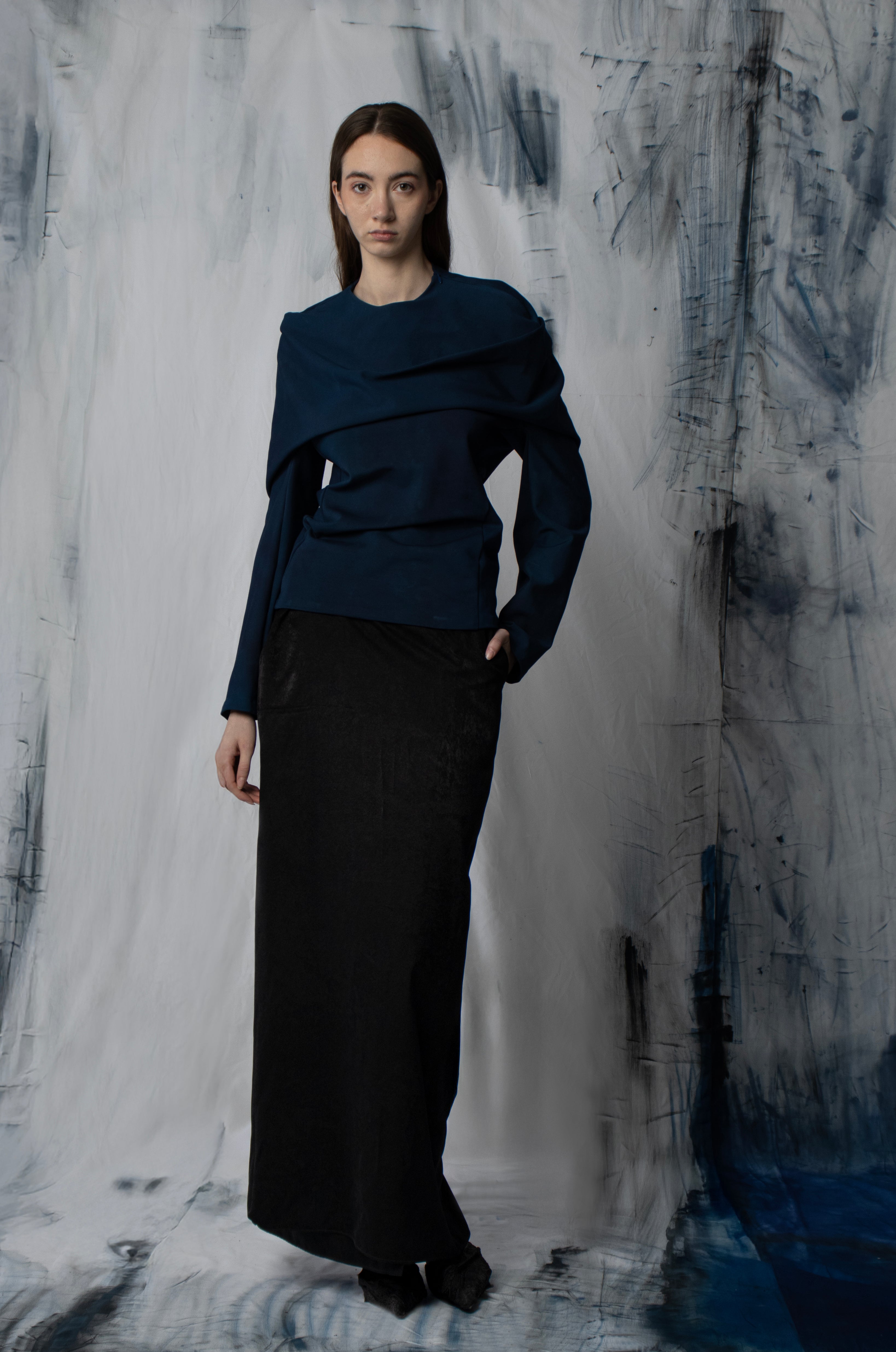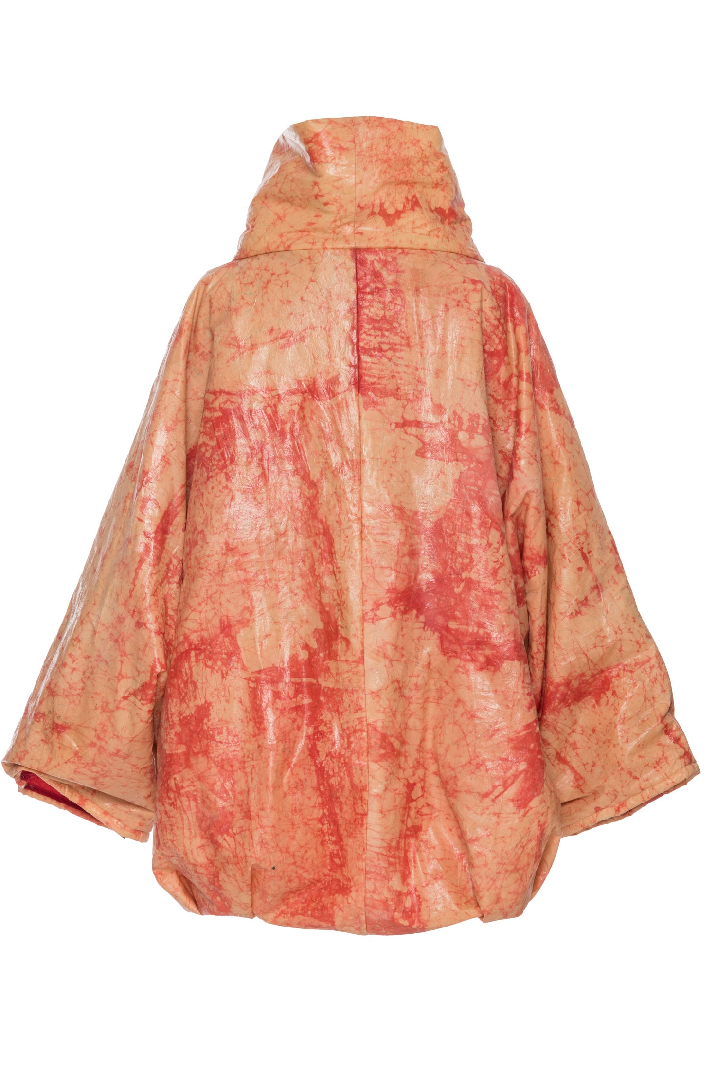 A convertible piece that can be worn as a jacket or displayed as an artwork. Made of crepe, silicone, and a patchwork of leftover fabrics.