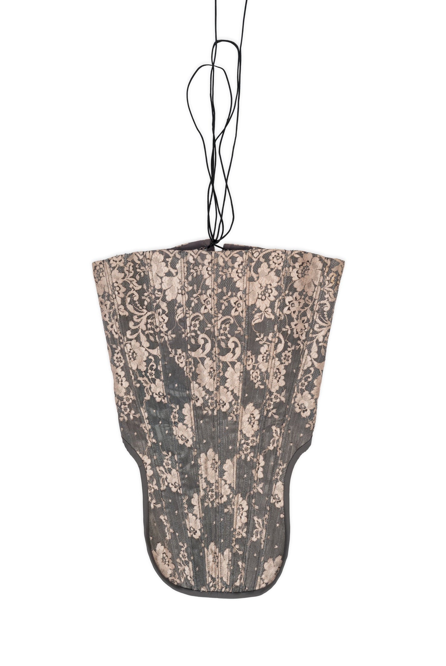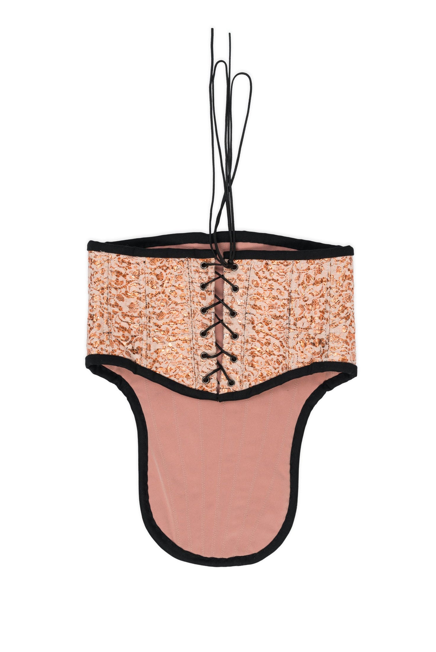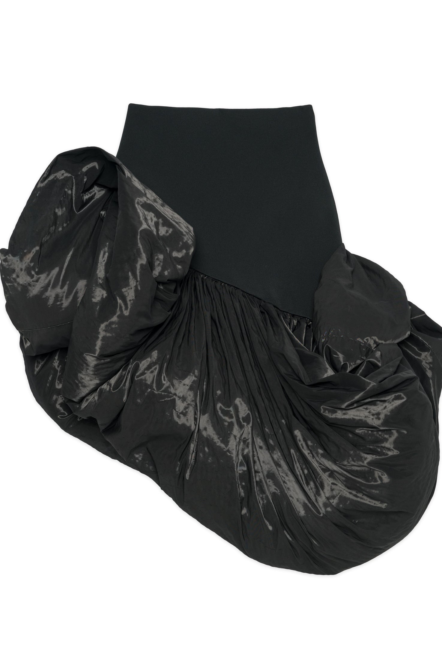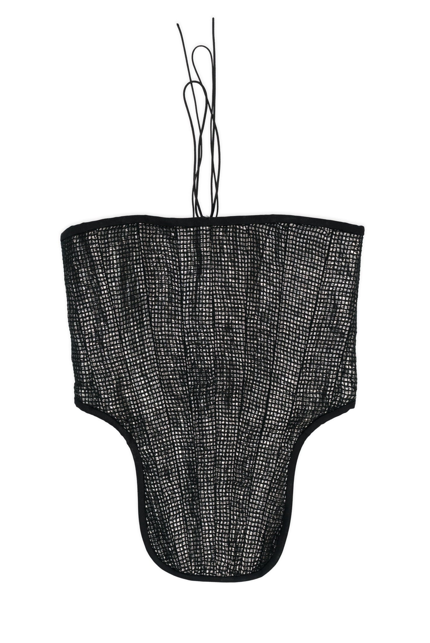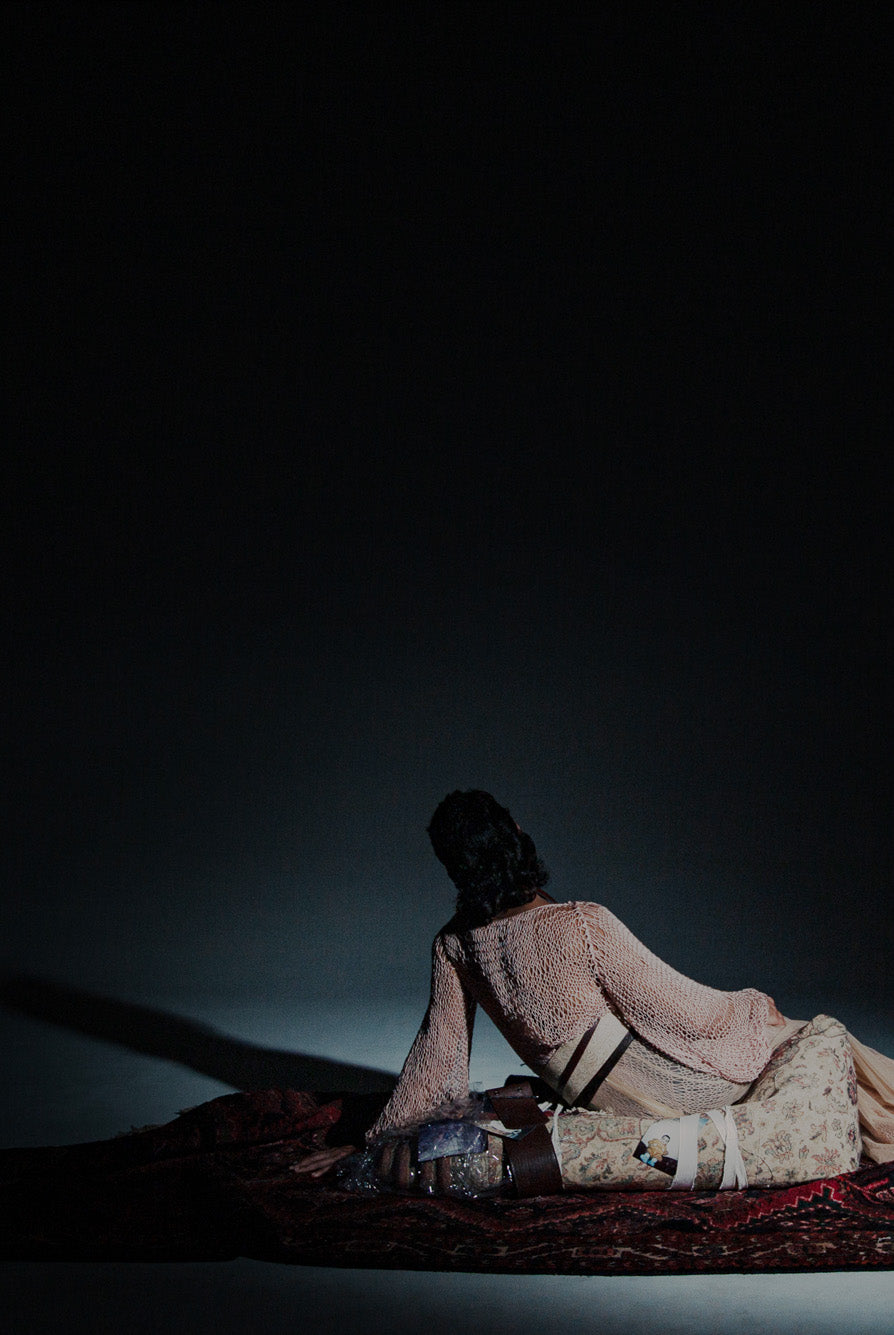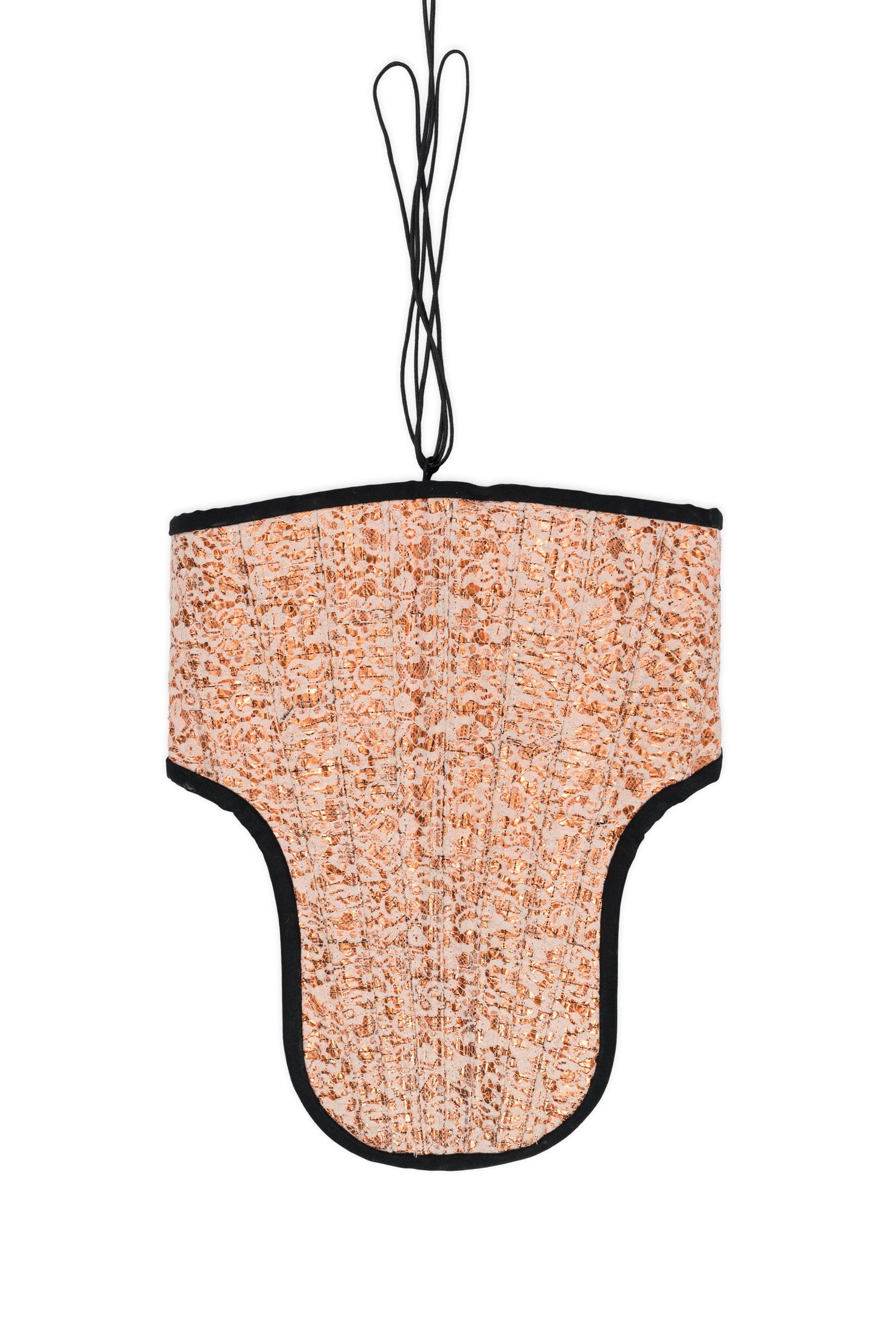 A convertible piece that can be worn as a jacket or displayed as an artwork. Made of crepe, silicone, and a patchwork of leftover fabrics.