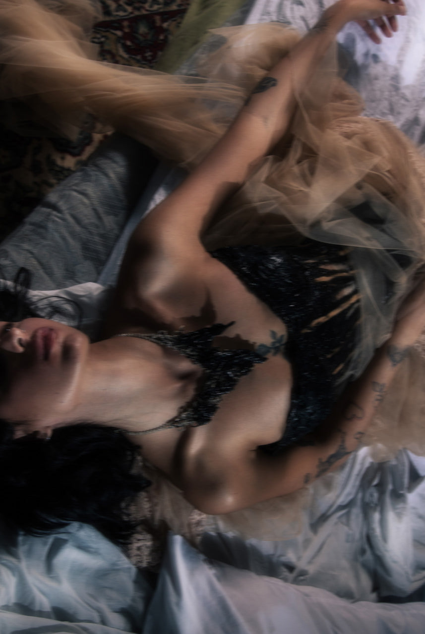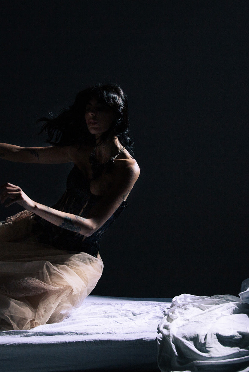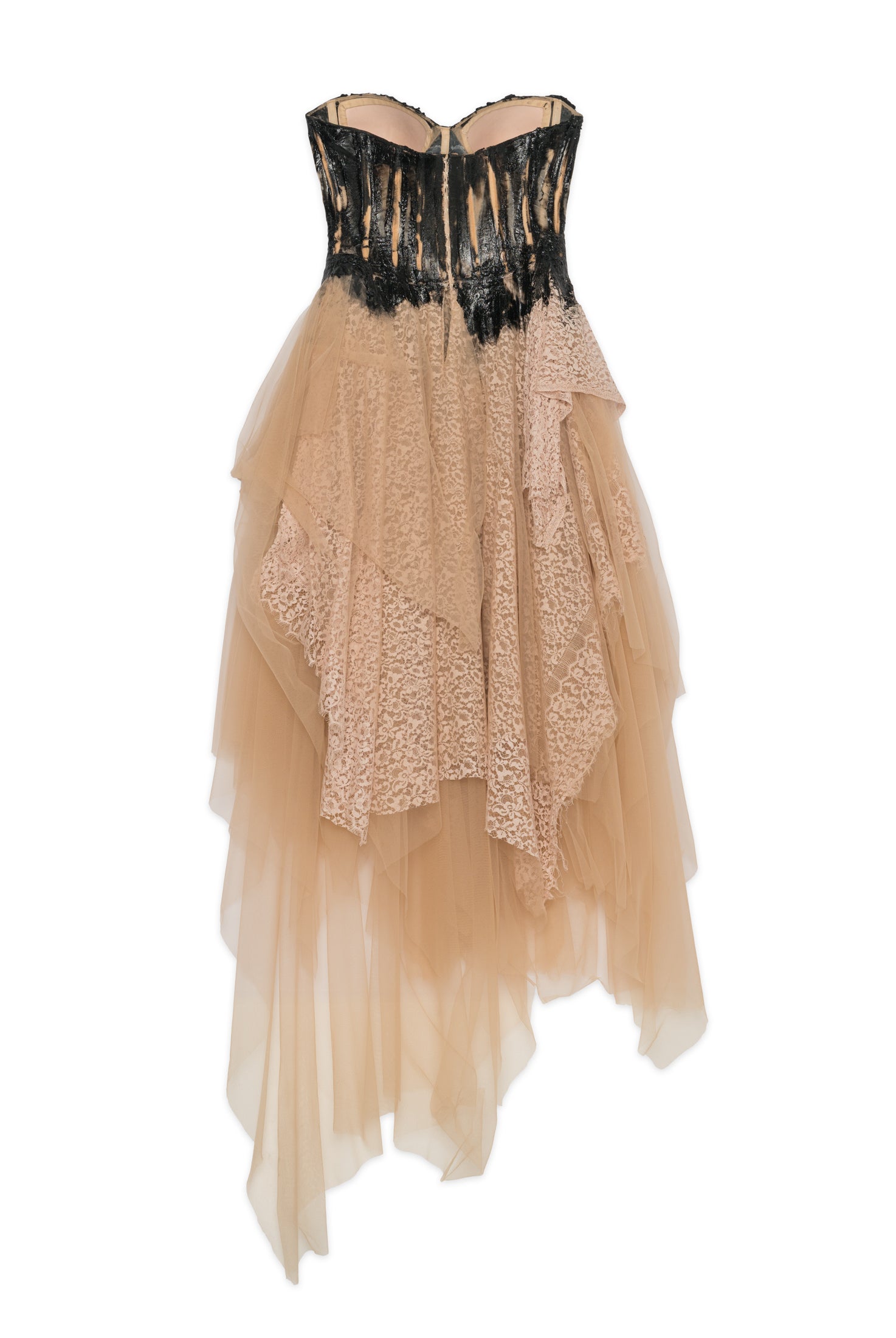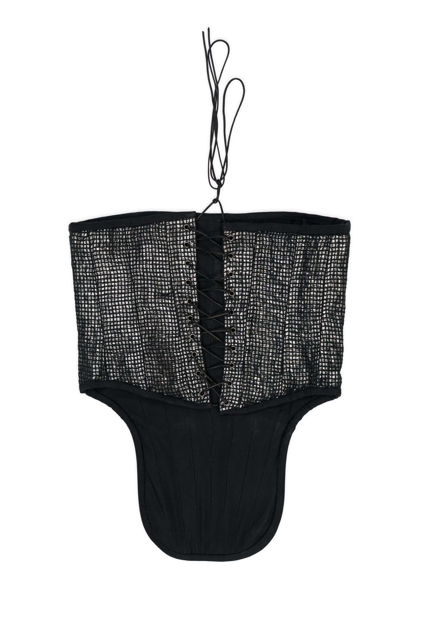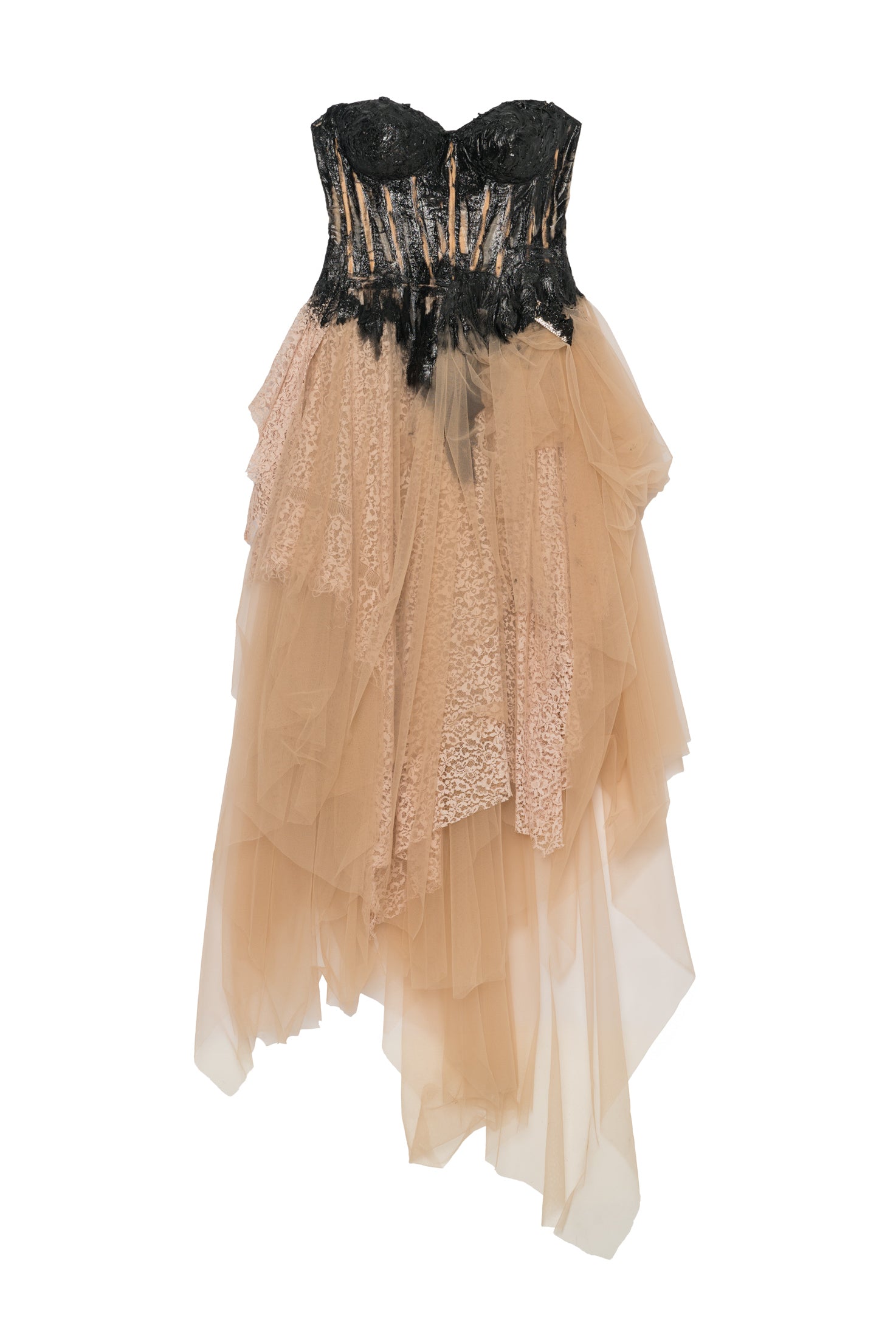 A convertible piece that can be worn as a jacket or displayed as an artwork. Made of crepe, silicone, and a patchwork of leftover fabrics.
