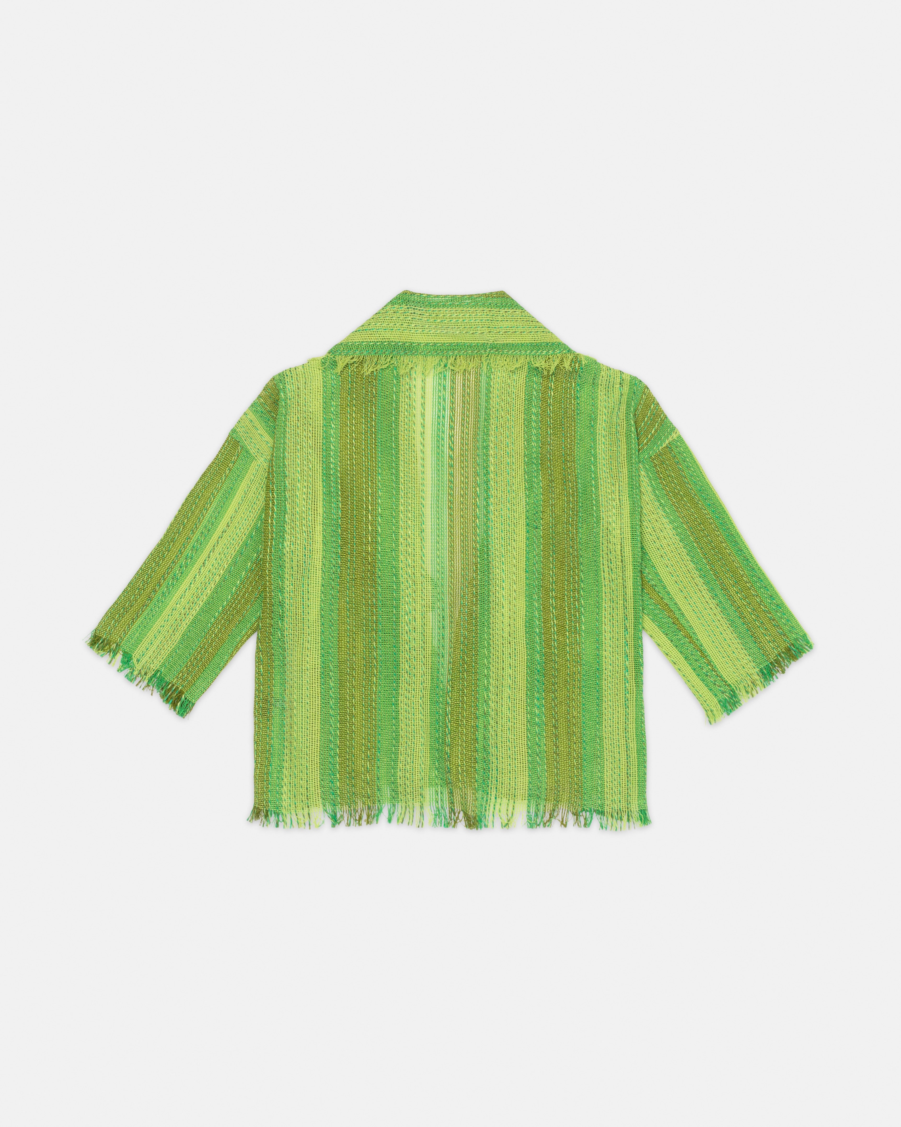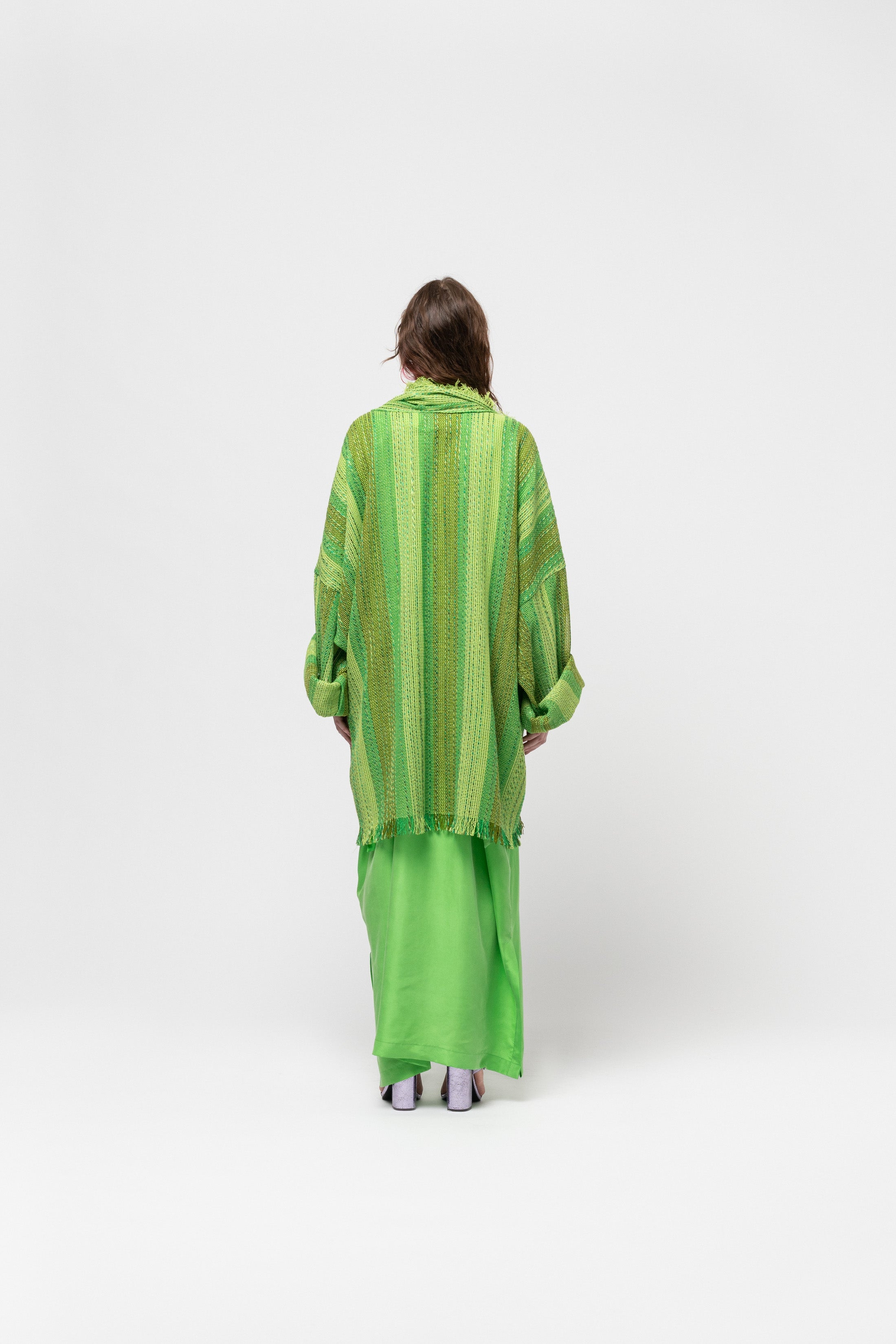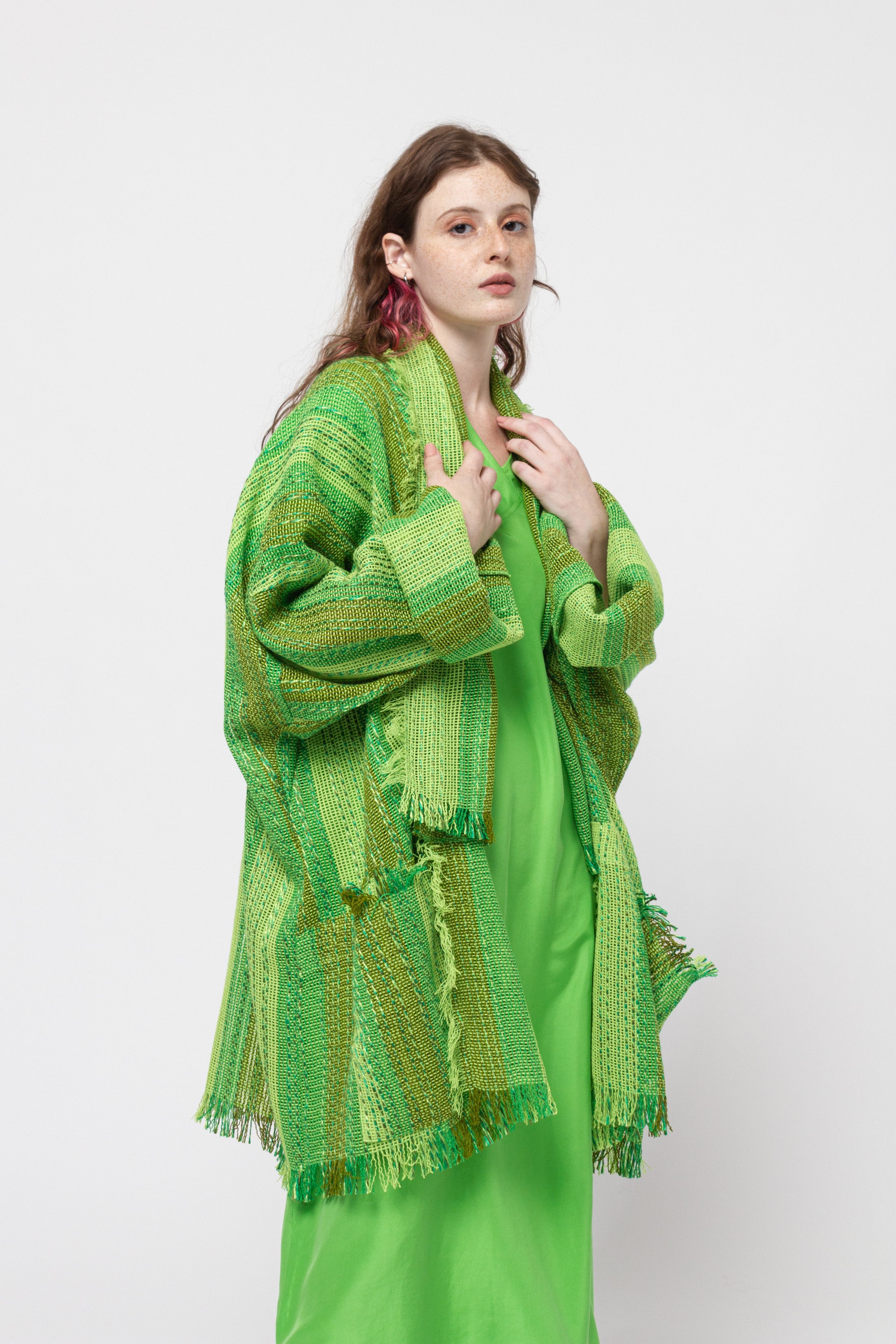An open-style coat woven in various shades of green, from bright lime to lush forest, with draped lapels and frayed details.