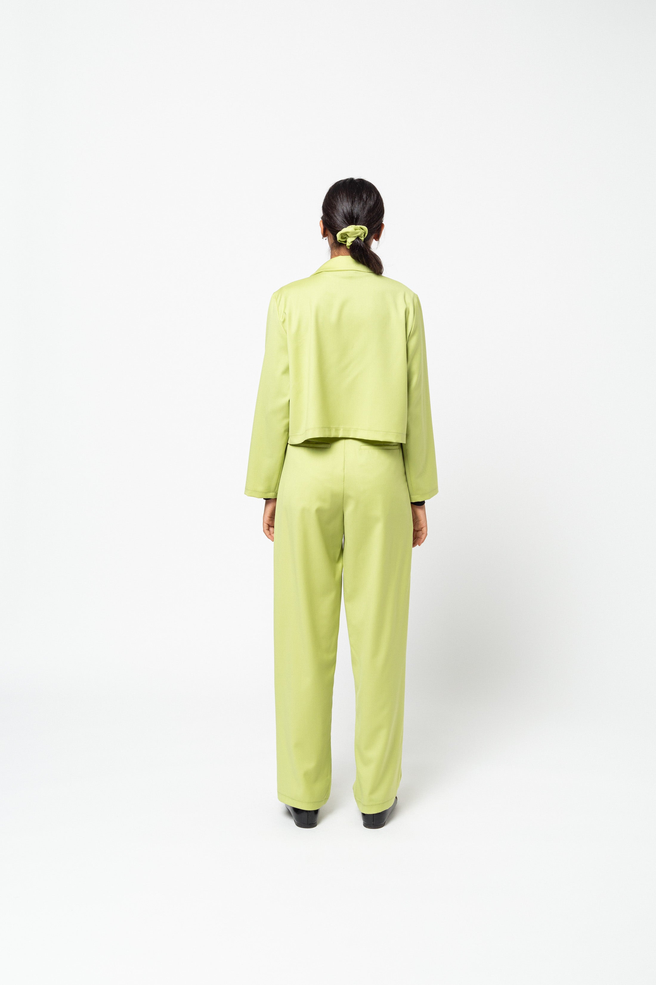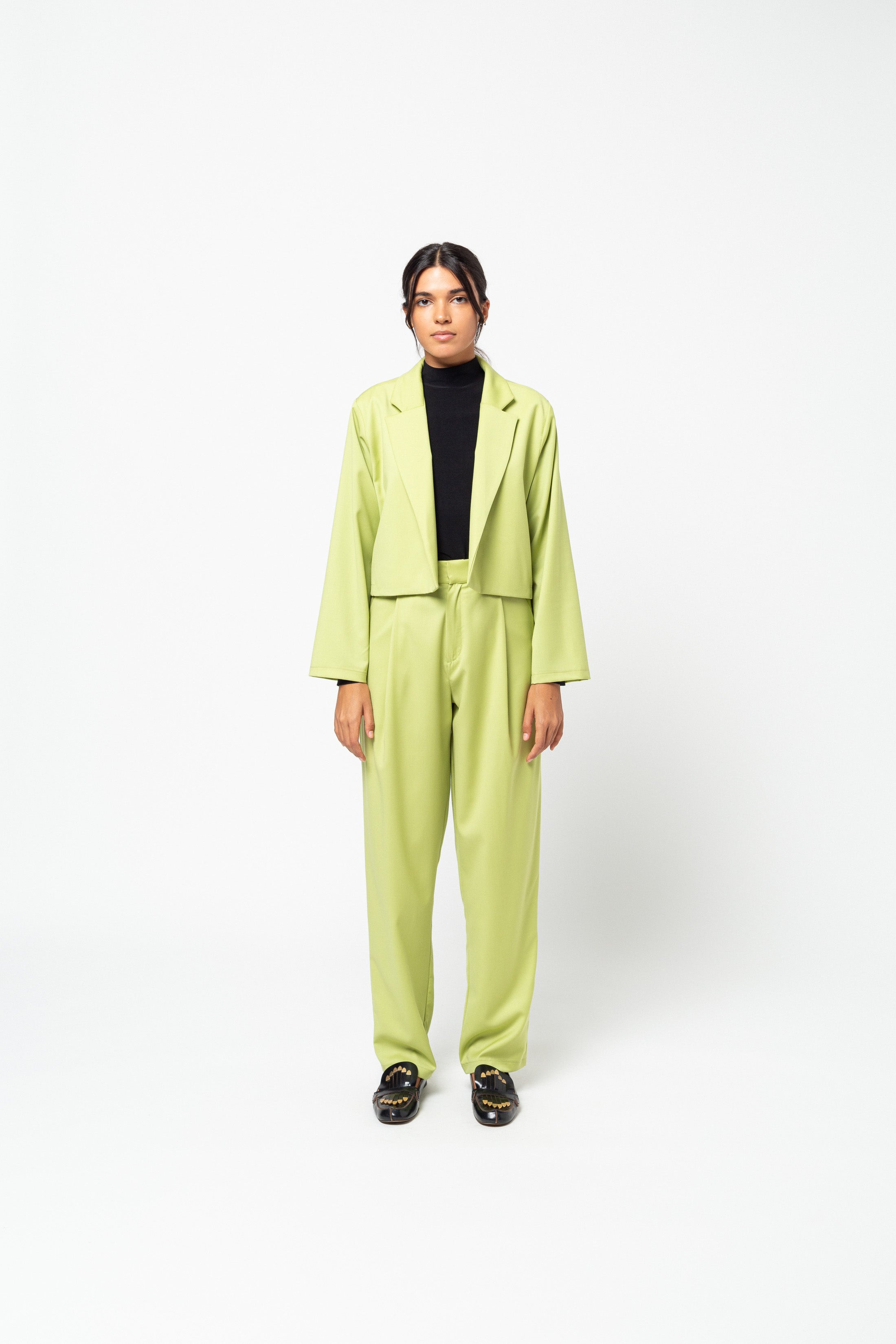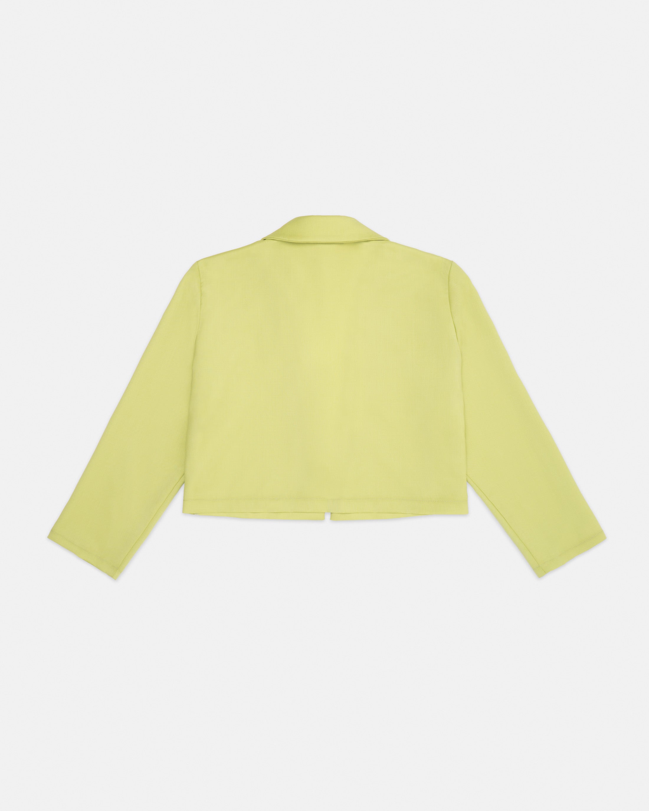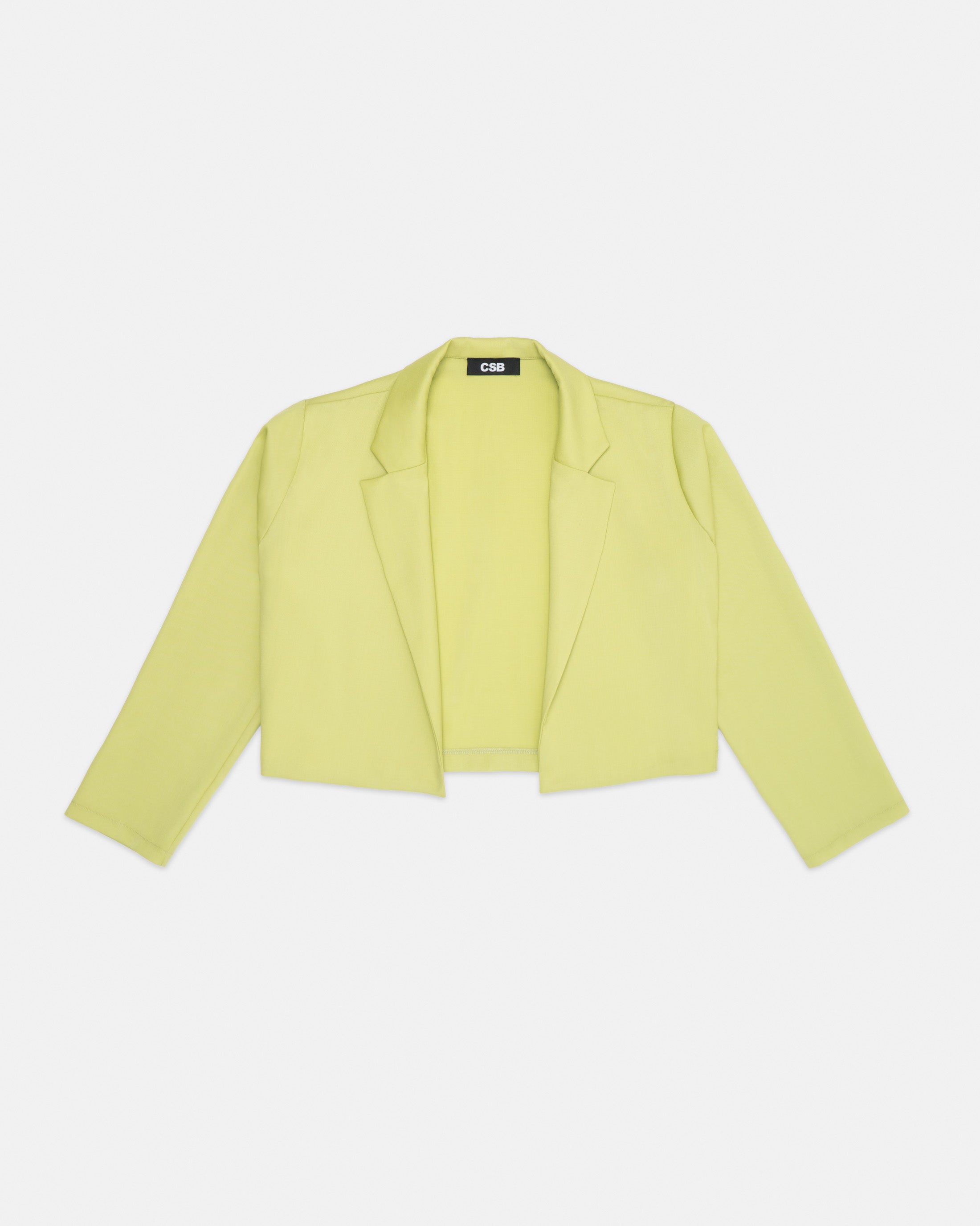 A cropped, buttonless blazer in lime green wool.