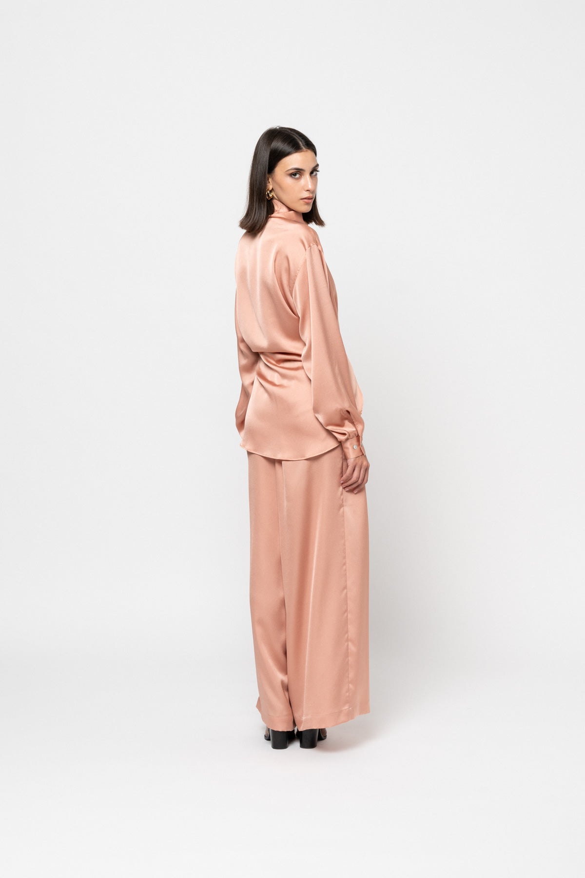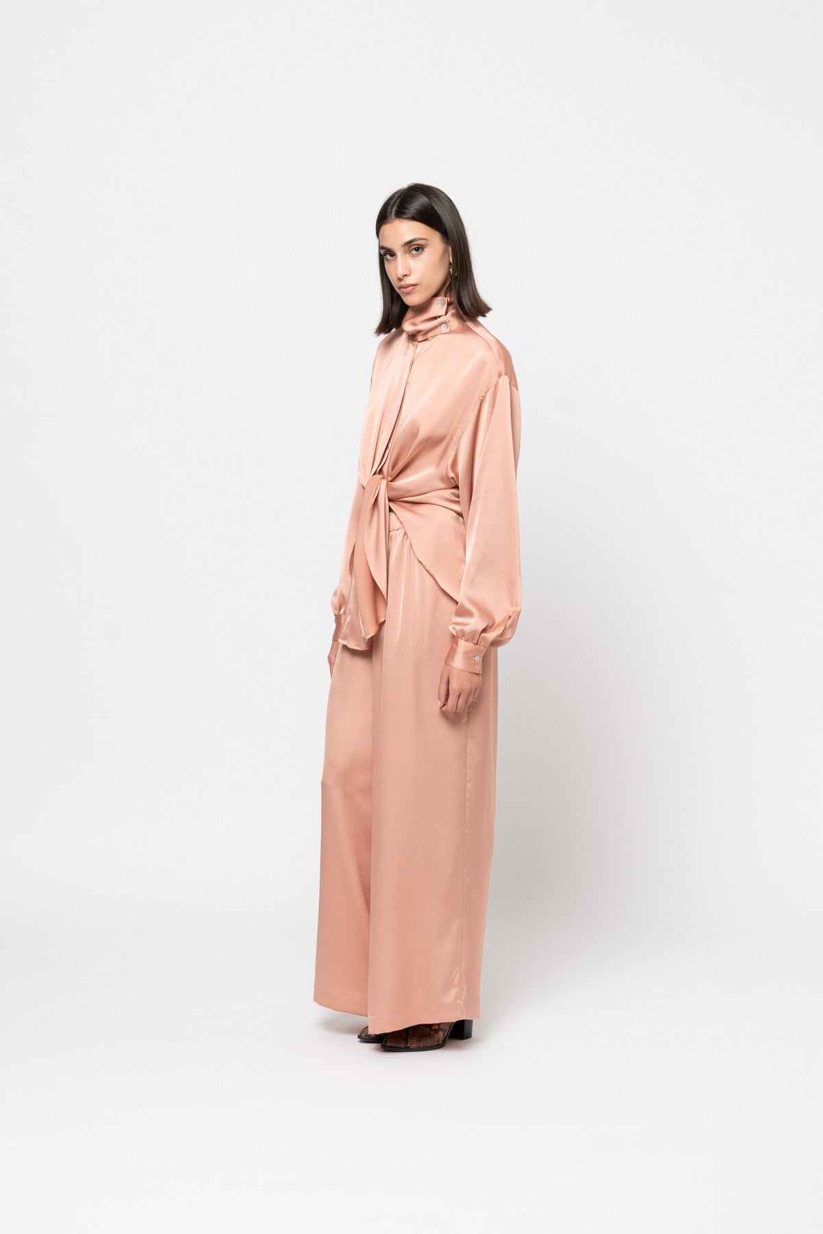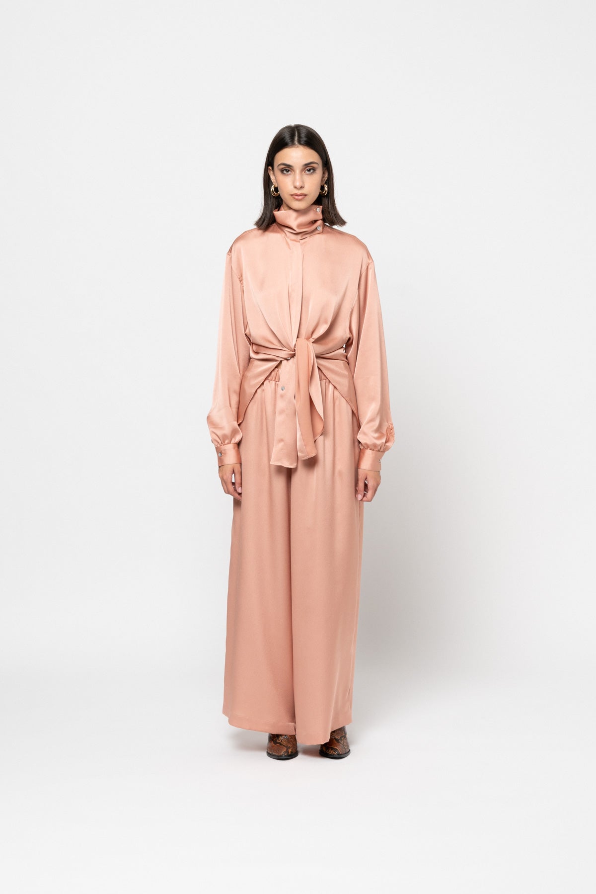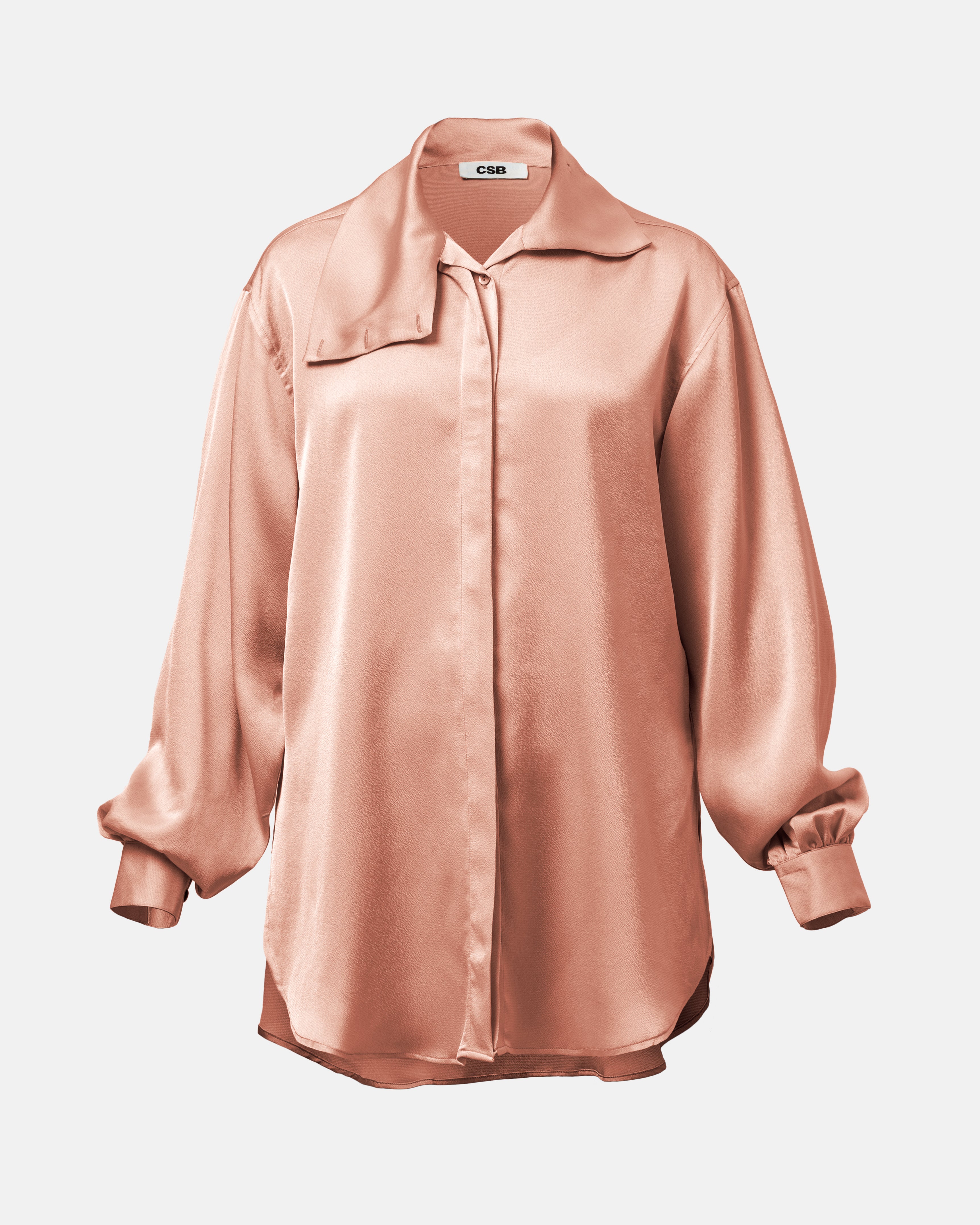 This oversized powder-pink satin shirt features gathered cuffs can be worn buttoned all the way up for a high neck collar option, worn open as an outer layer, or tied up for some drama.