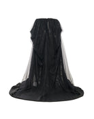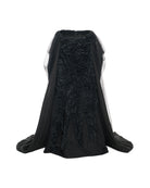 A two-layer skirt featuring a bias A-line silhouette with gathered fabric as material work, topped with a bedsheet-inspired layer, a structured belt, and a sheer black tulle overlay.