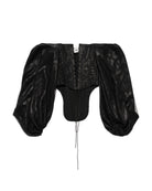 A corset made of linen and silicone, with a black tulle layer and attached sleeves.