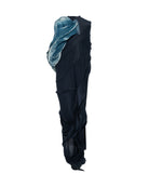 A fluid, draped navy maxi dress with a sculptural form, shaped by internal pintucks and plastic boning. Cut on the bias, it falls in natural, waterfall-like folds down the body. The sleeve is made of lightweight, sheer cotton, cyanotyped with floral motifs and discreet family portraits, echoing the material and conceptual language of the dress.