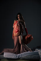 A headpiece gown crafted from cotton and silicone, featuring a red and nude palette. The batik technique evokes skin-like textures. Finished with inner sock sleeves to hold gathered fabric at the wrists.