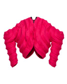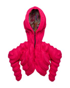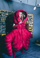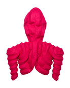 An oversized, structured ensemble consisting of a paneled jacket, hoodie, and dress, crafted from 100% wool cashmere knitted on needles 9 to 12. Built using bespoke tailoring techniques, including hand stitching, basting, and internal boning, the silhouette is supported by non-fusible horsehair canvas interfacings and constructed crinoline. The viscose lining adds fluidity beneath the controlled architecture of the garment.