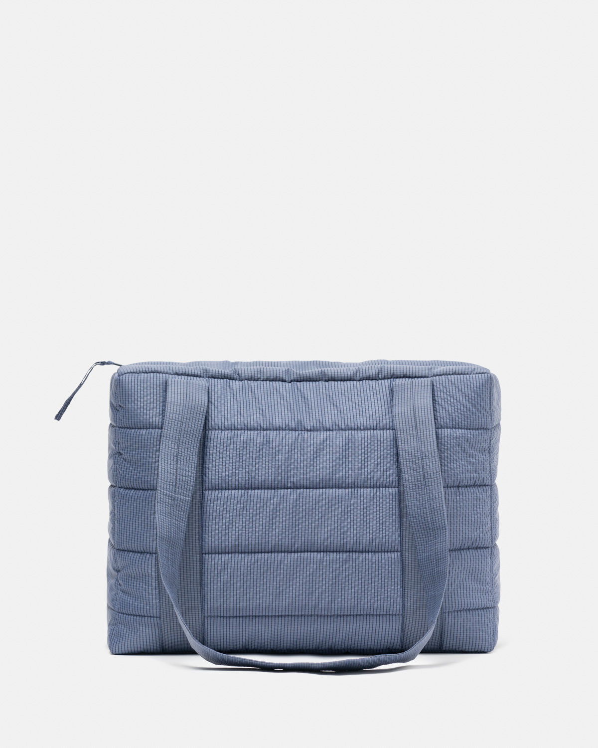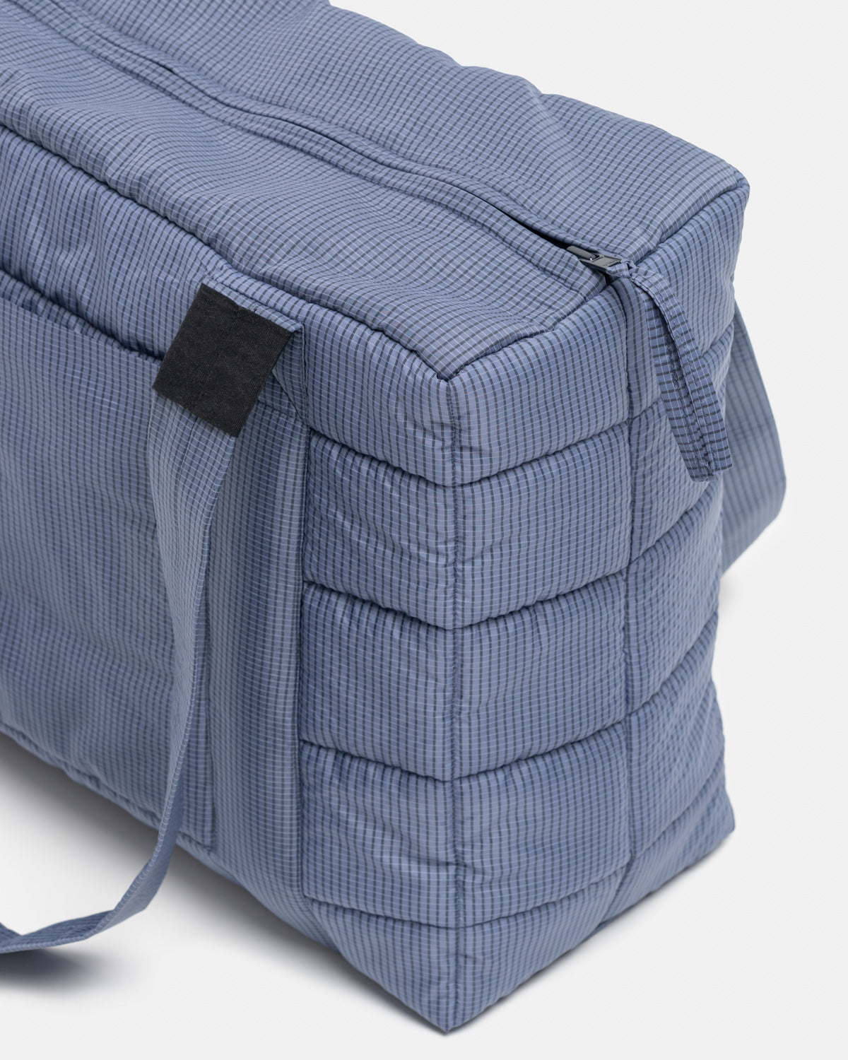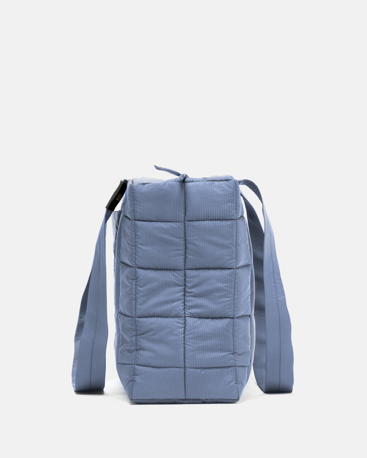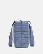 Medium rectangular puffer bag in light blue. Featuring a pocket on the outside and a zipper pocket on the inside.