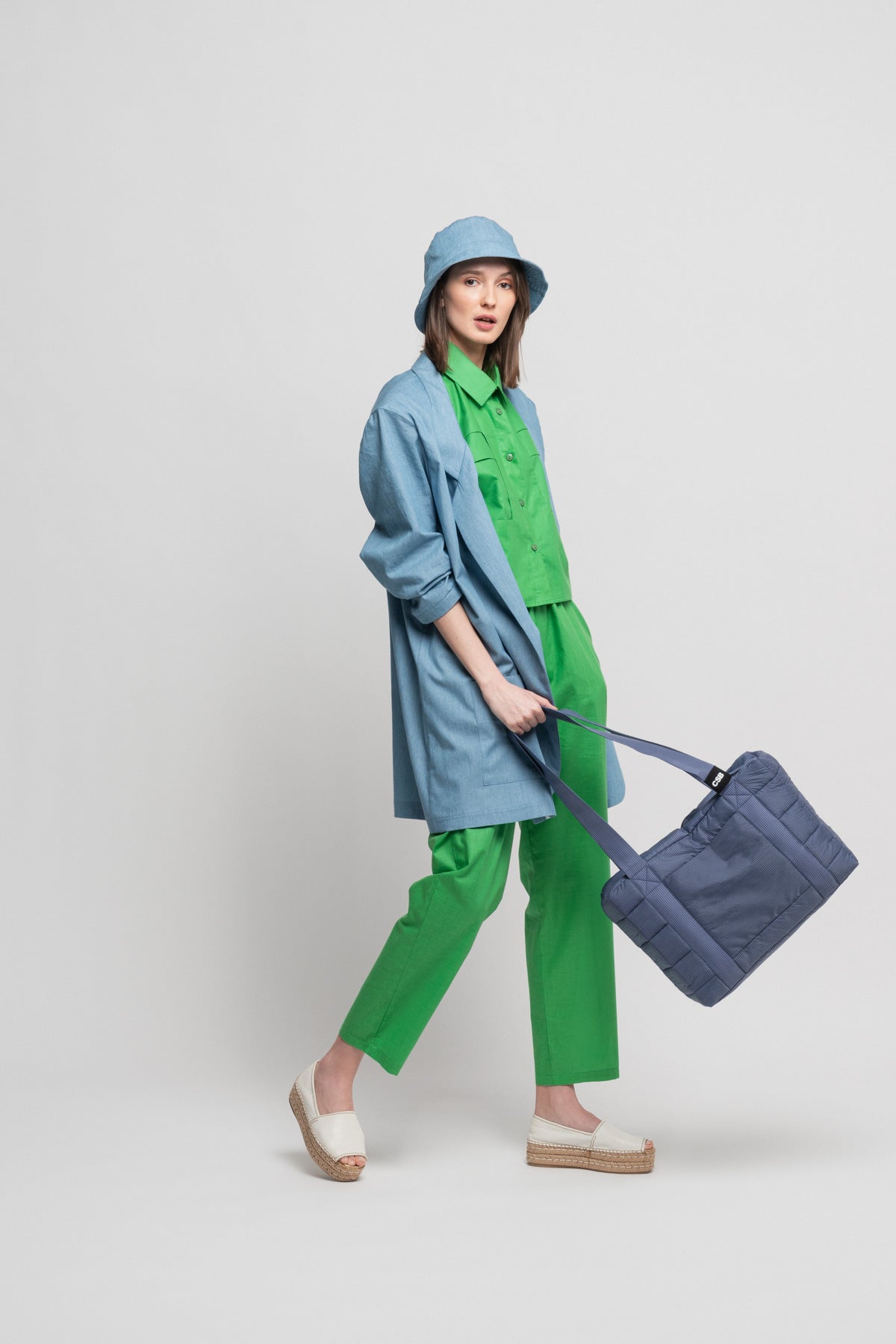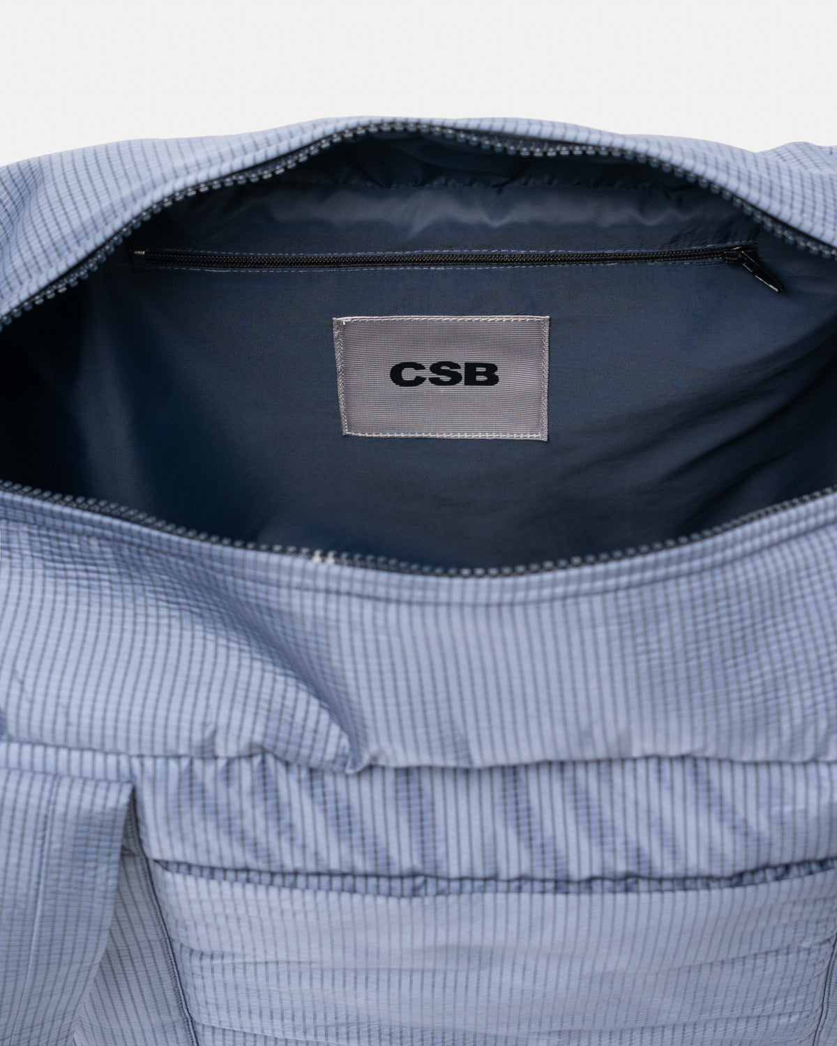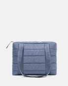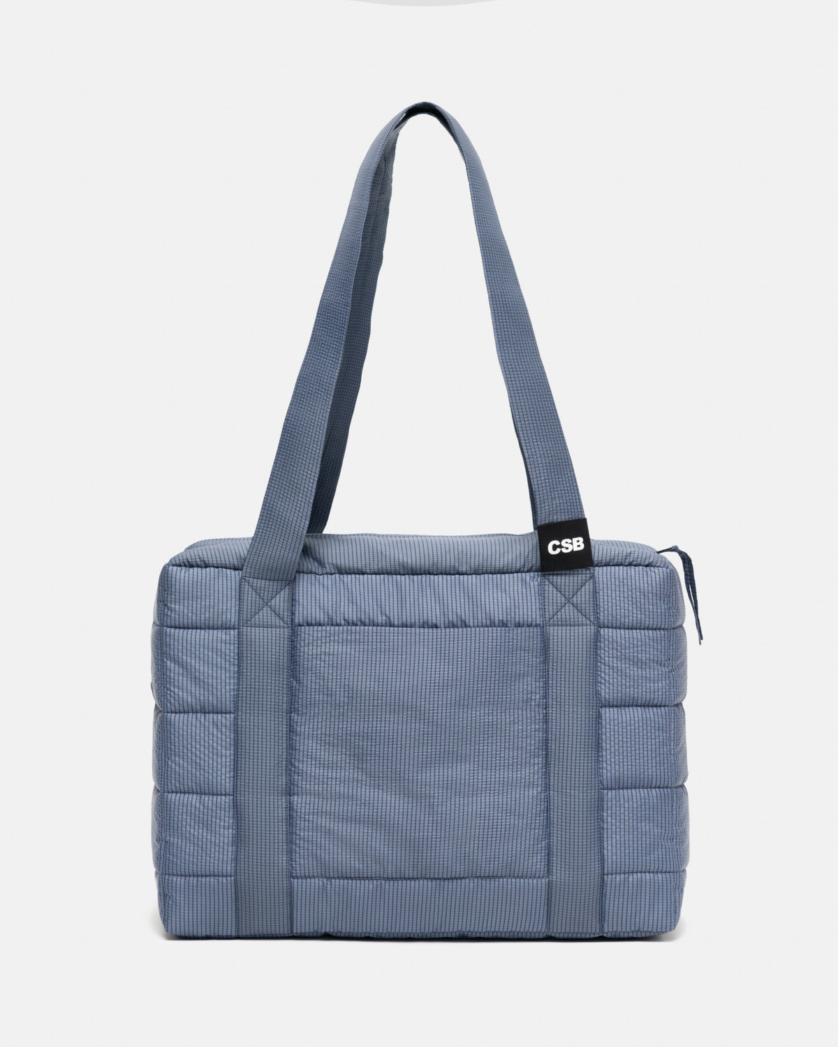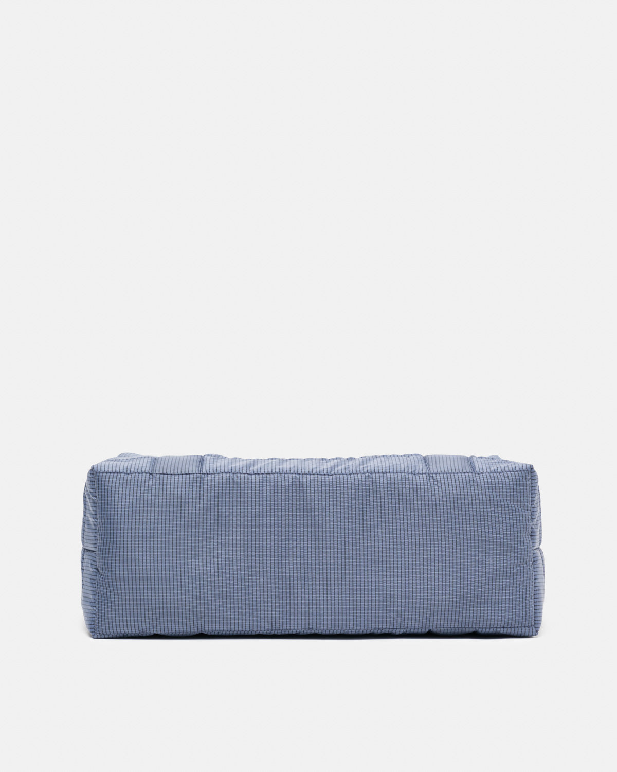 Medium rectangular puffer bag in light blue. Featuring a pocket on the outside and a zipper pocket on the inside.