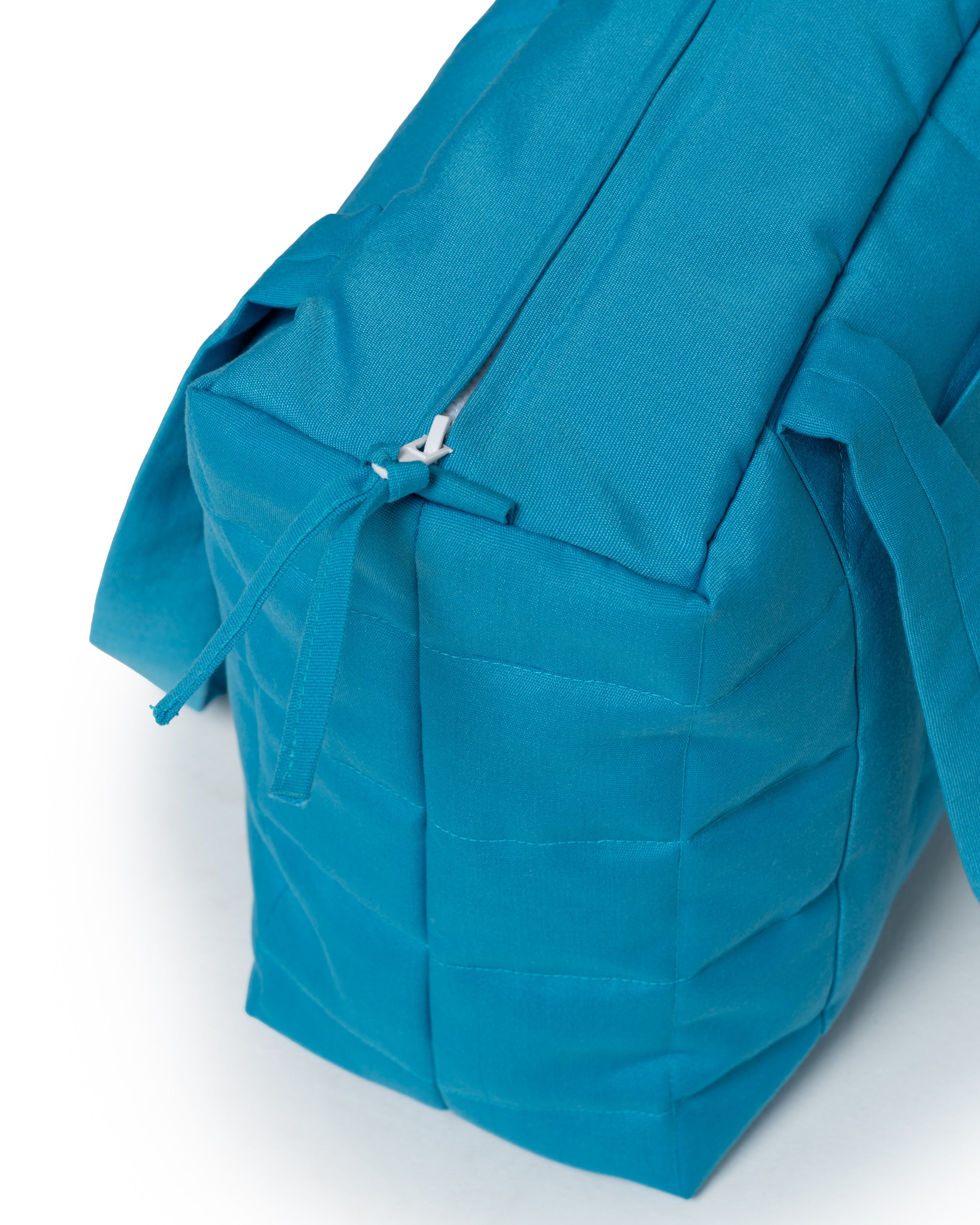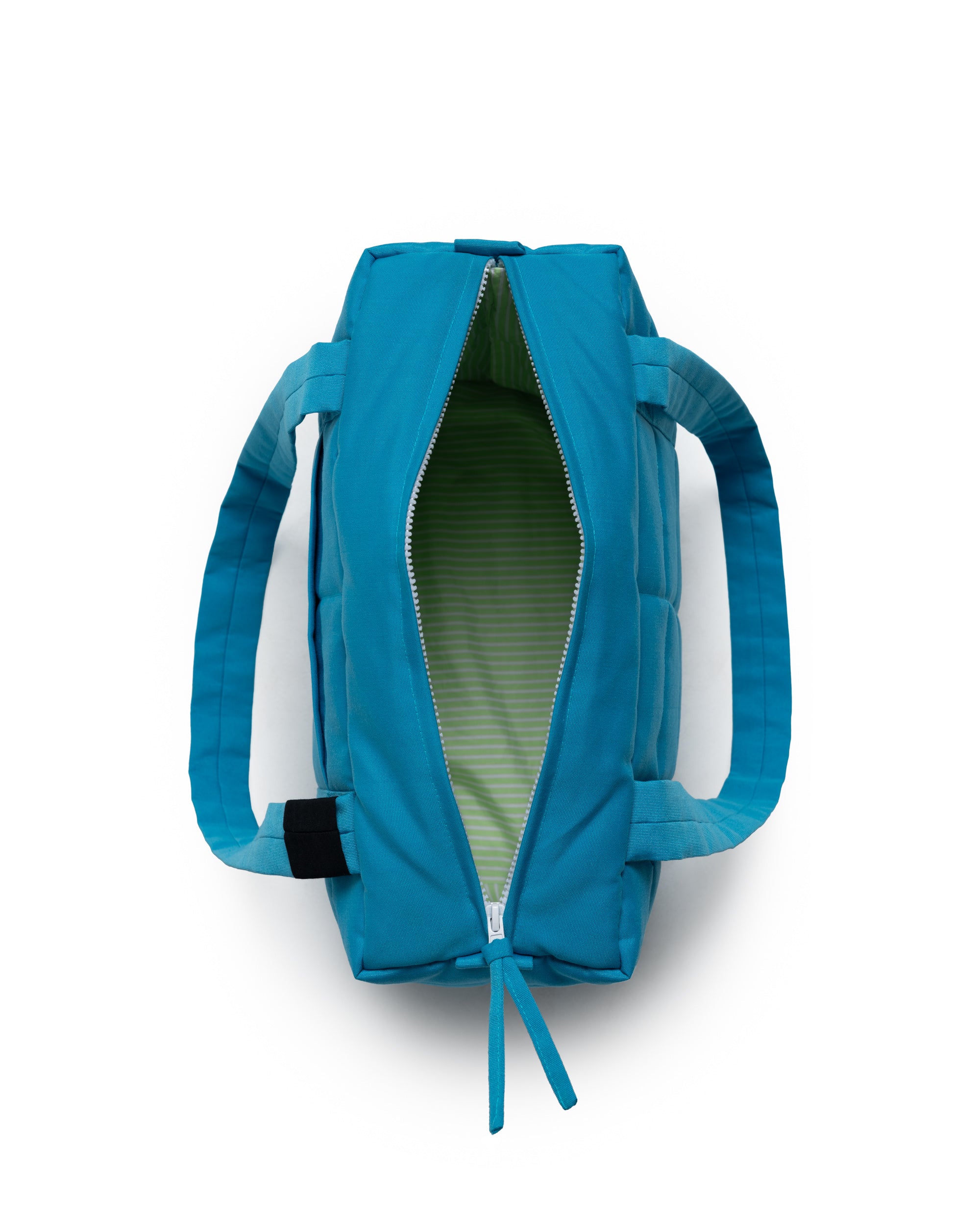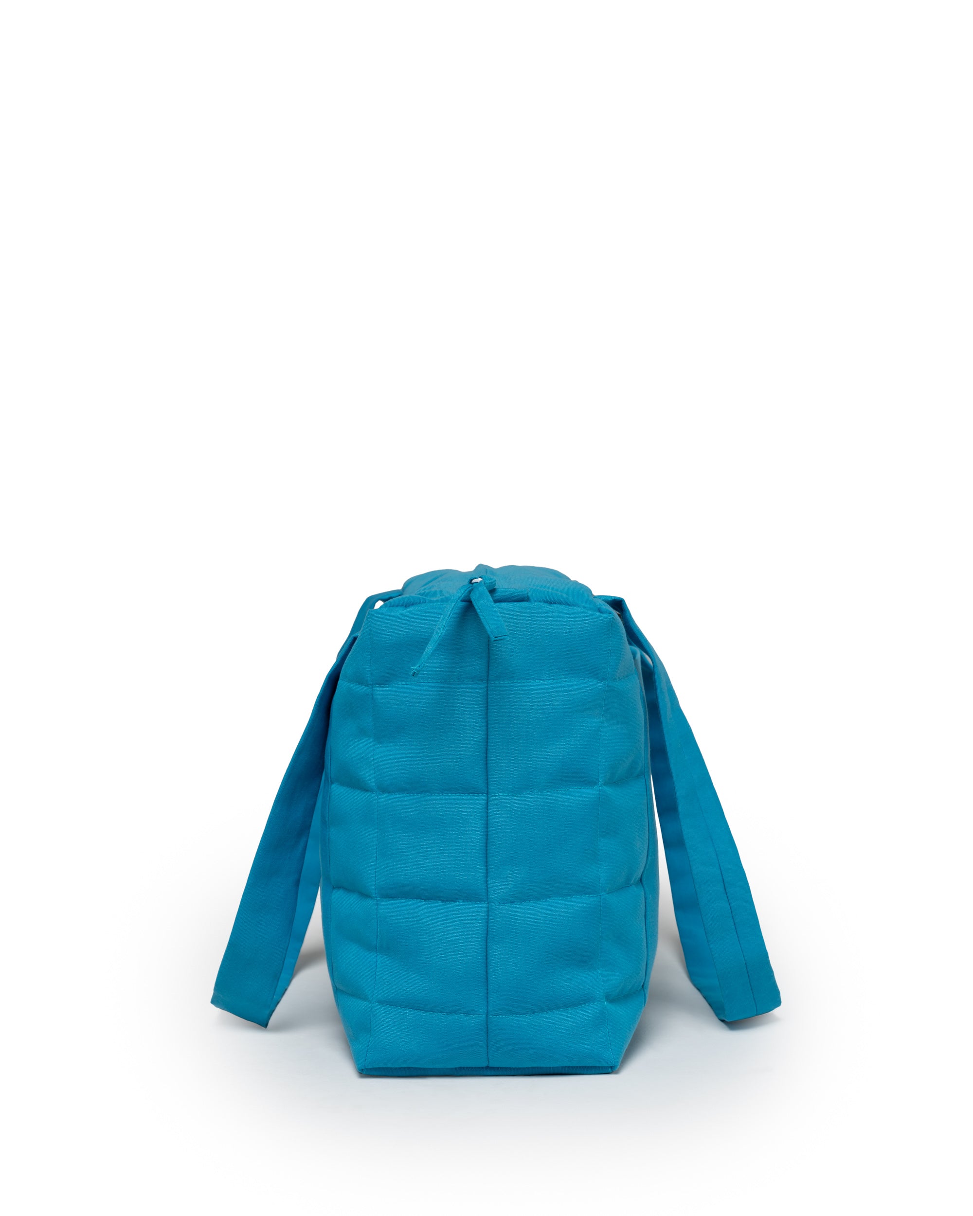 Medium rectangular puffer bag in Turquoise Canvas. Featuring a pocket on the outside and a zipper pocket on the inside.