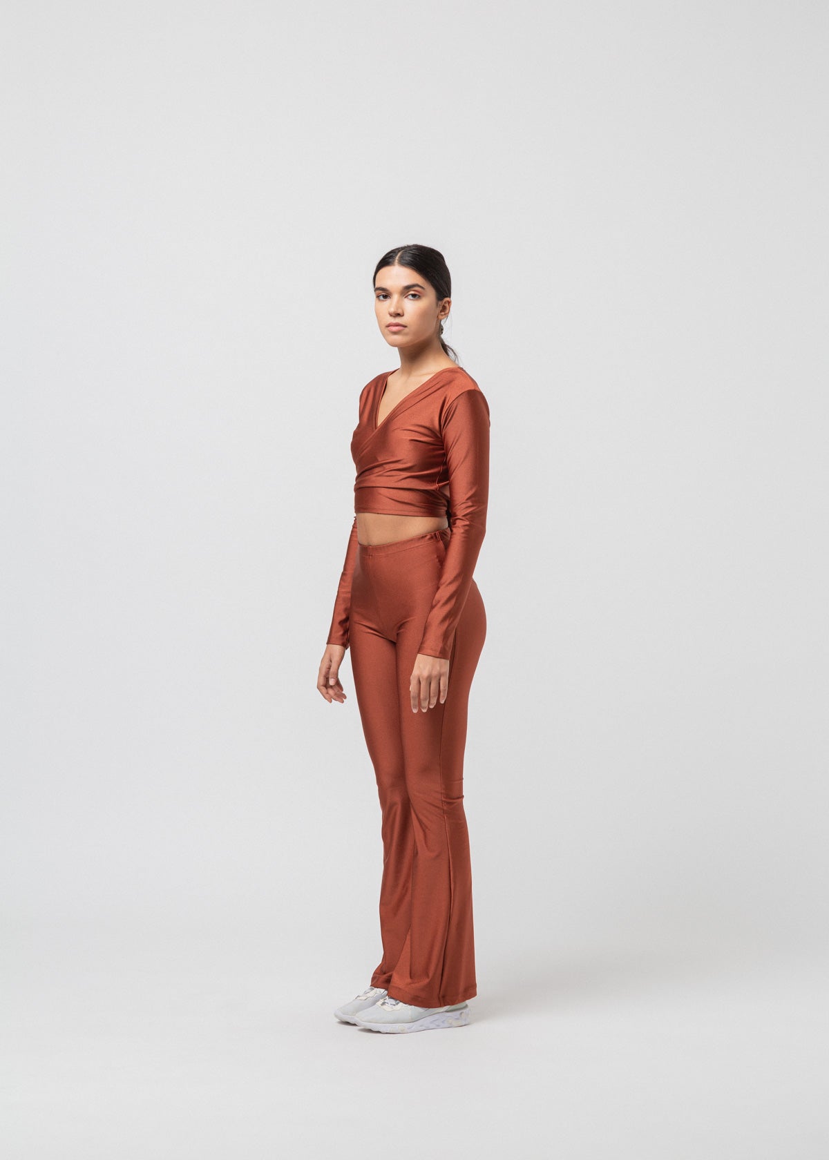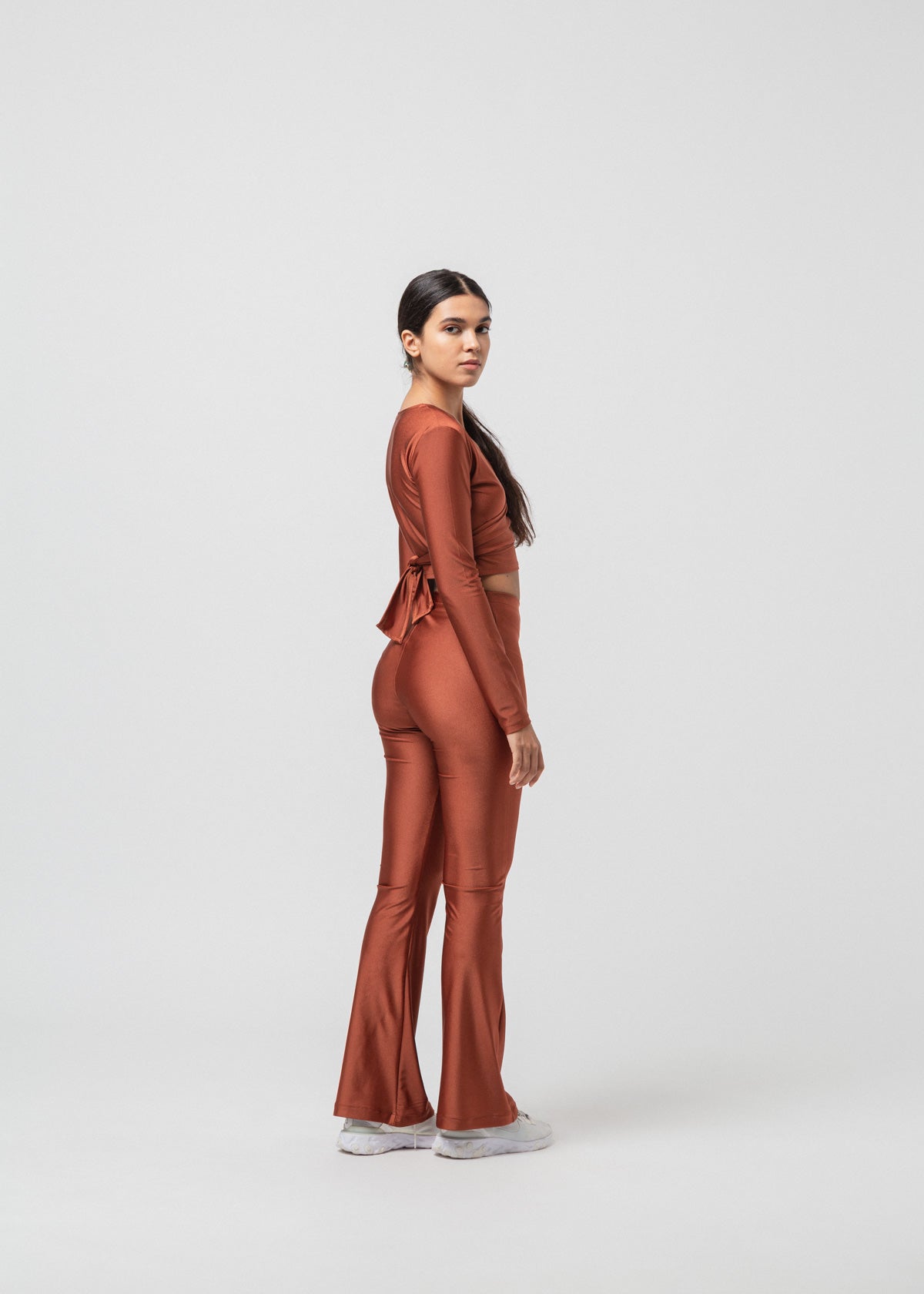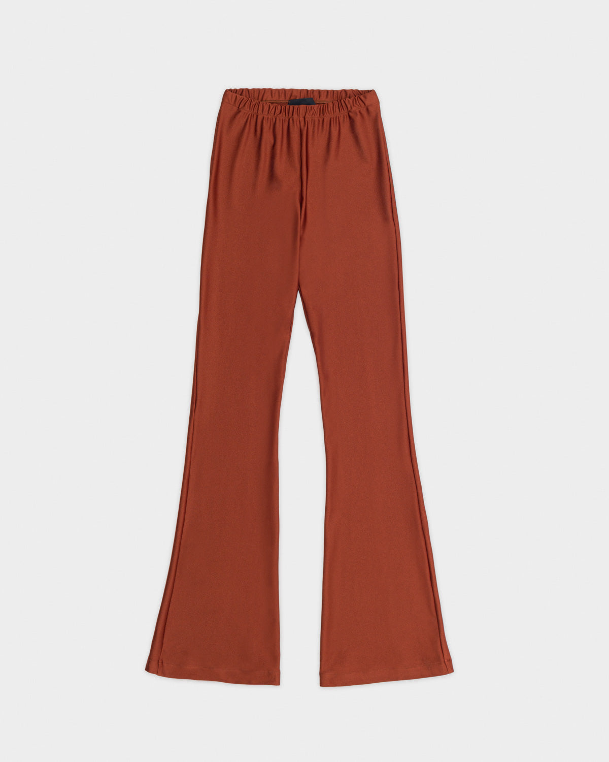 Body-hugging flared pants in soft shimmery brick jersey.