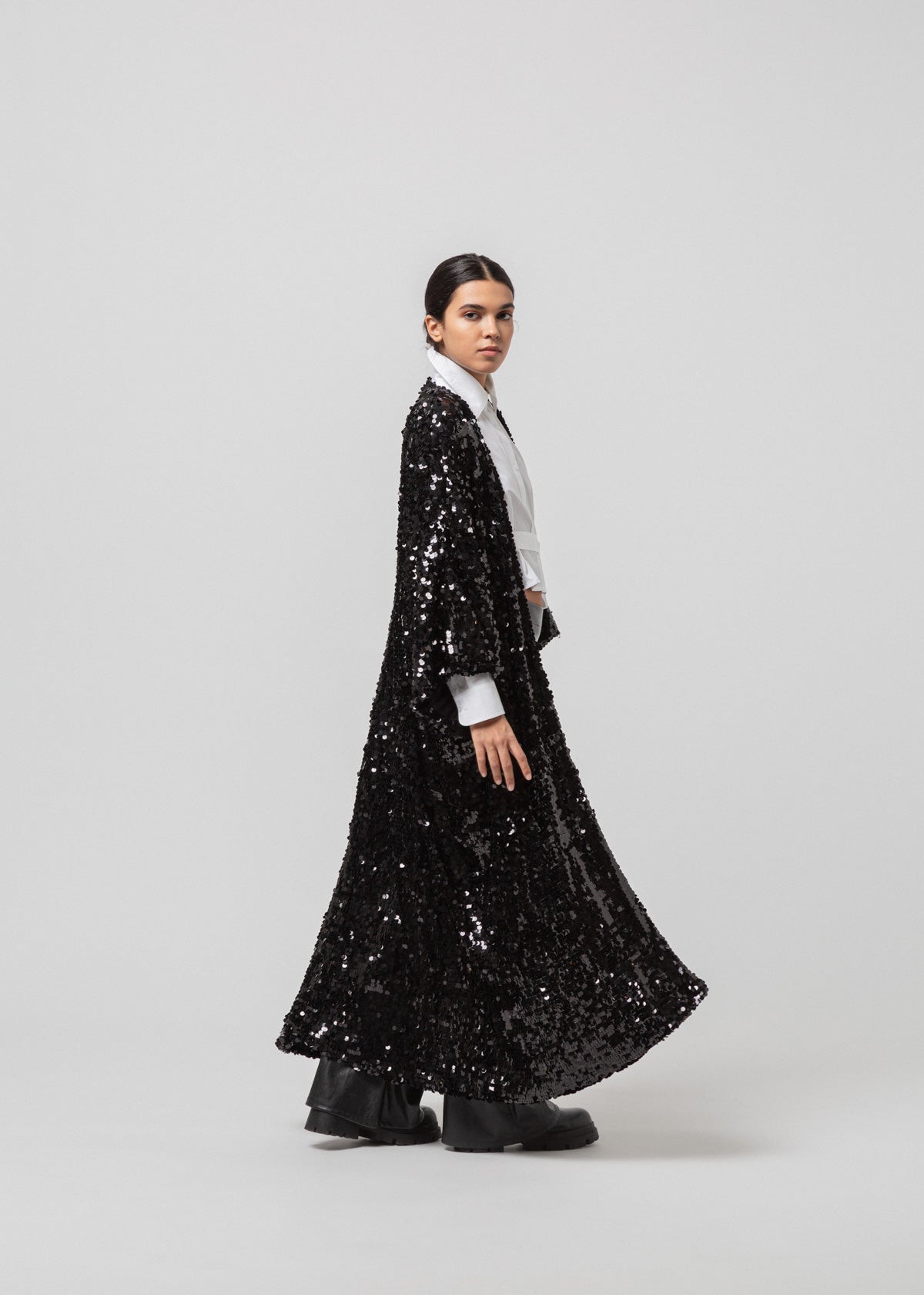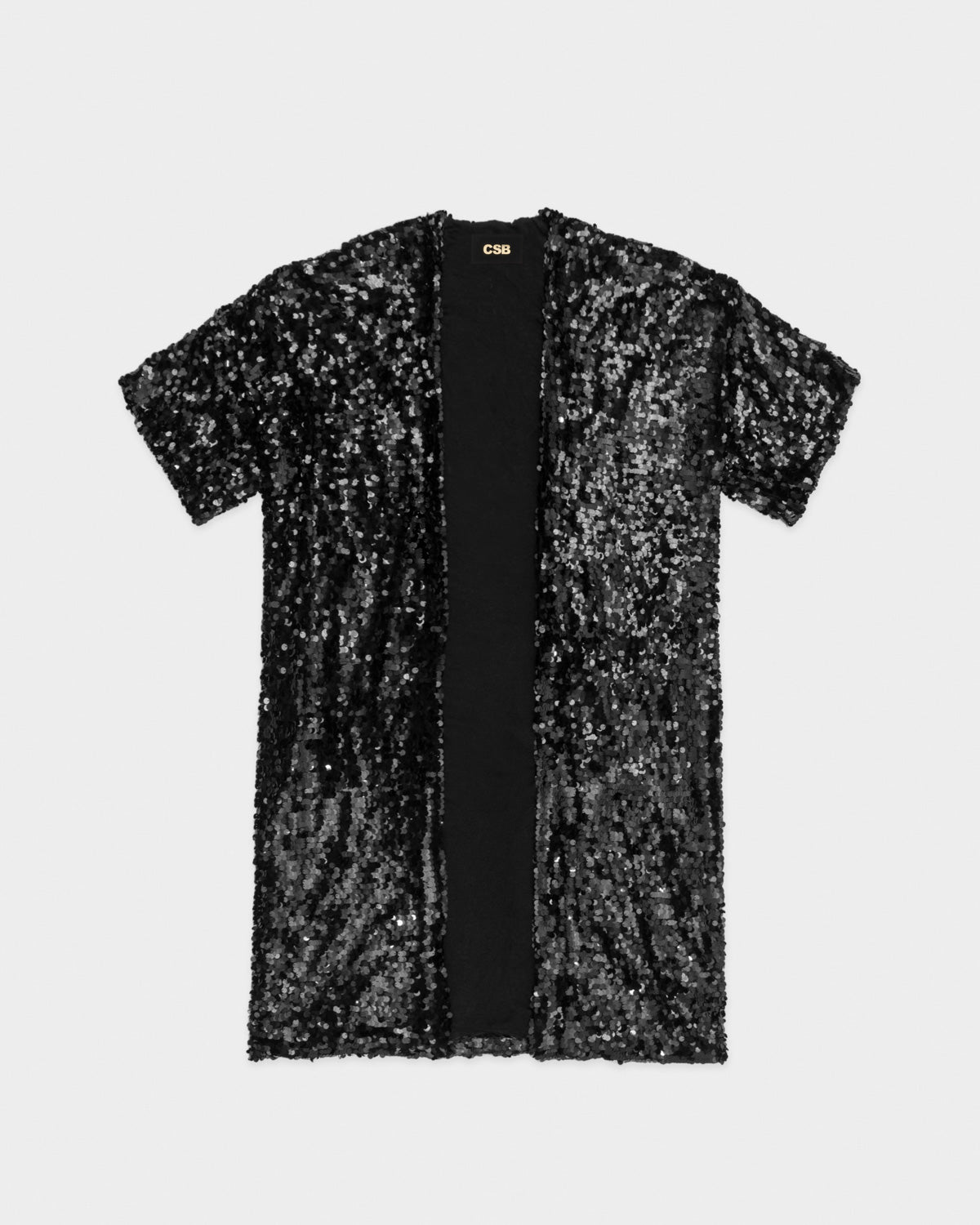 Black sequined open caftan with long and wide sleeves.